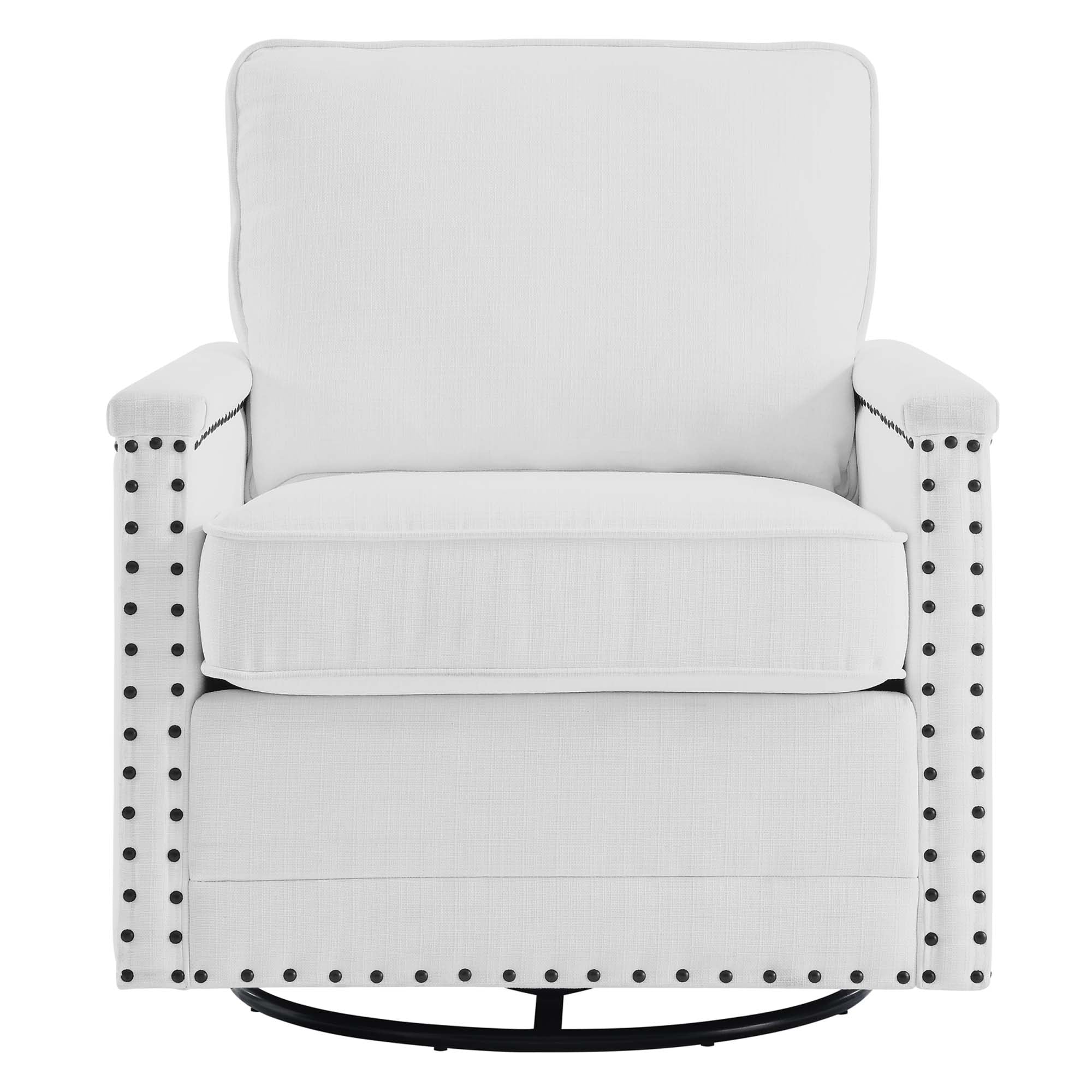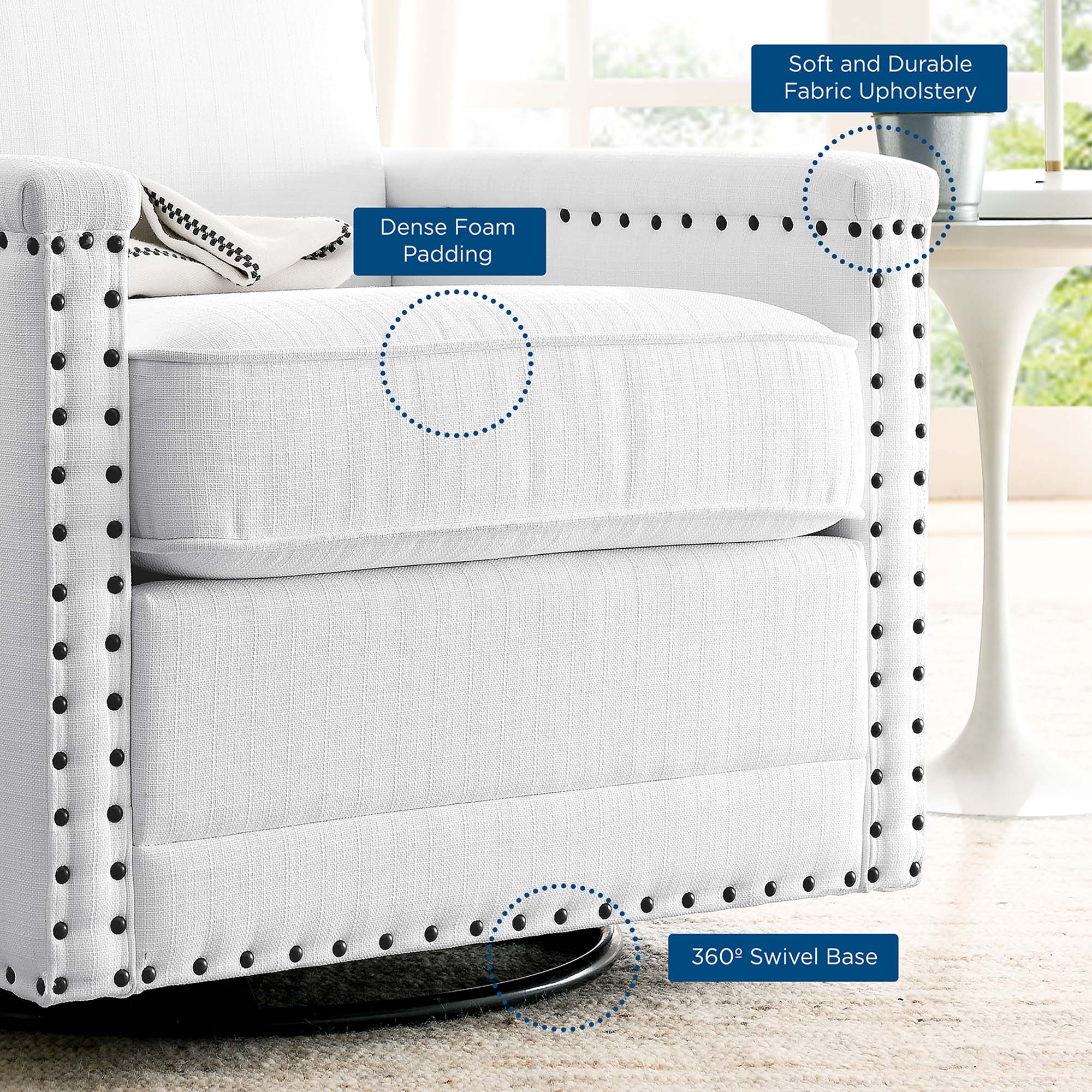 Sit back and relax amidst streamlined style and supportive comfort with the Ashton Upholstered Fabric Swivel Chair. Perfect for the living room, bedroom, office, entryway, or lounge area, this accent chair is enriched with a tailored profile, separate seat cushions, and a classic nailhead trim. Upholstered in beautiful polyester fabric, this swivel armchair is padded with dense foam and complete with a spring pocket support system to offer a premium seating experience. Durably crafted, this swivel chair rests on a sturdy black metal 360º swivel base with non-marking foot pins to protect flooring. Say goodbye to the days of hauling heavy furniture because Ashton ships in a conveniently portable box that's easily maneuverable up staircases and narrow hallways. Assembly required. Armchair Weight Capacity: 441 lbs.