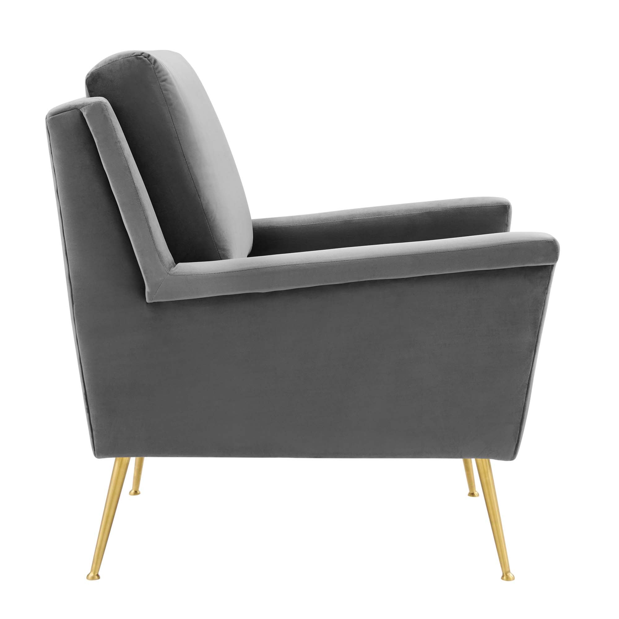 Redefine your living space with the modern design and glam deco style of the Chesapeake Performance Velvet Accent Armchair. Featuring a tailored profile and subtle flared silhouette, this velvet chair refreshes a living room, entryway, den, office, or bedroom sitting area. Offering a luxurious seating experience, this accent chair is upholstered in stain-resistant performance velvet and padded with dense foam for ultimate comfort. Resting atop brushed gold stainless steel legs, this living room armchair is crafted with solid wood and plywood and supports up to 300 lbs.