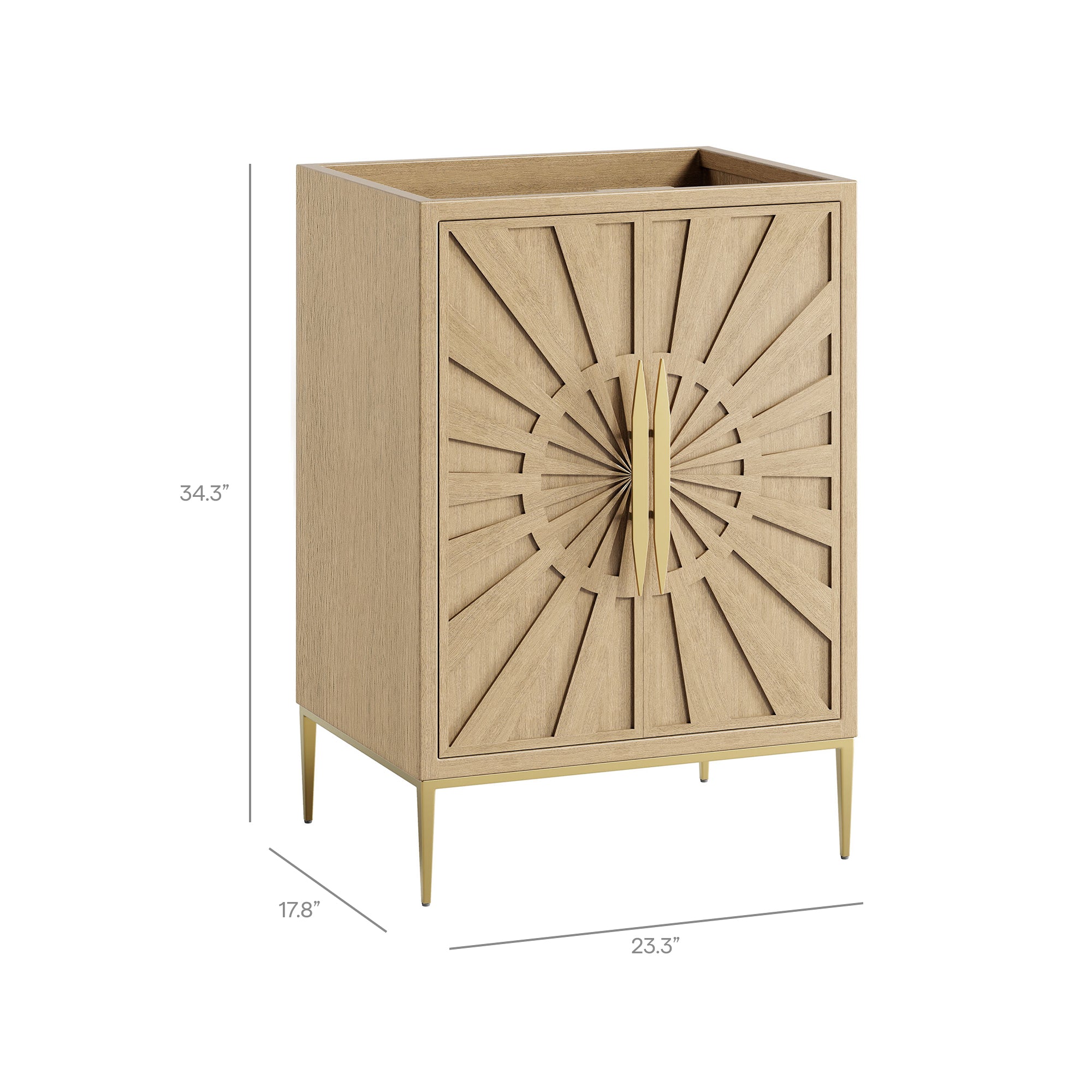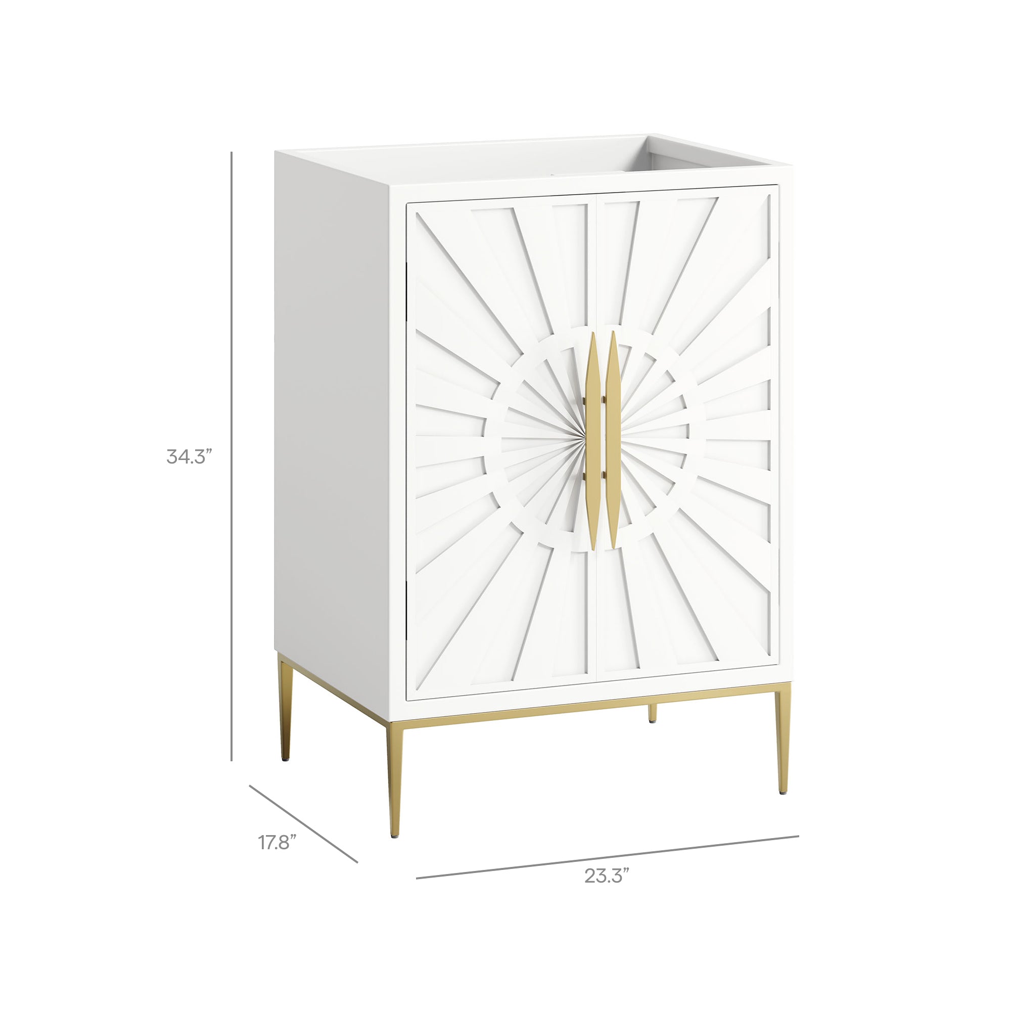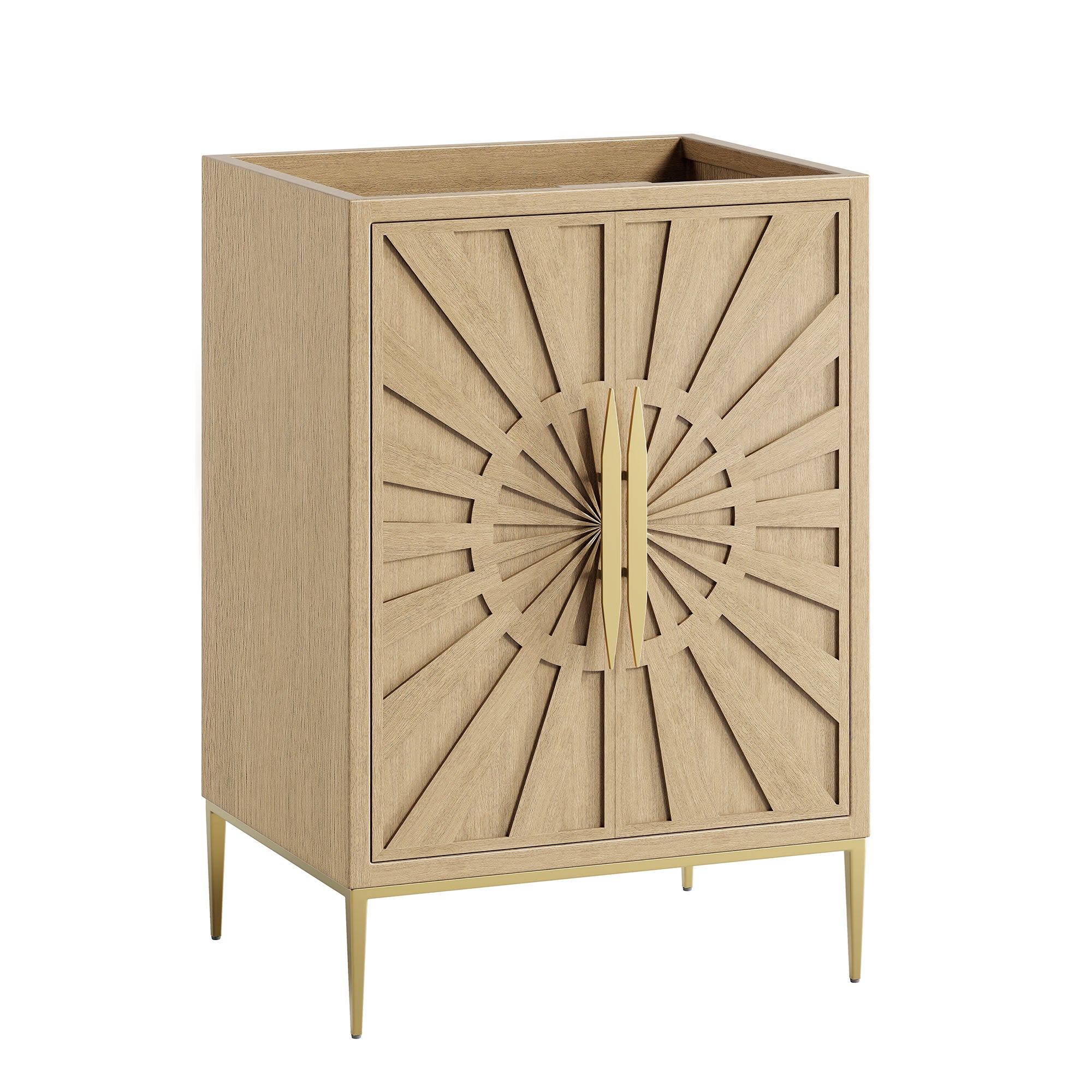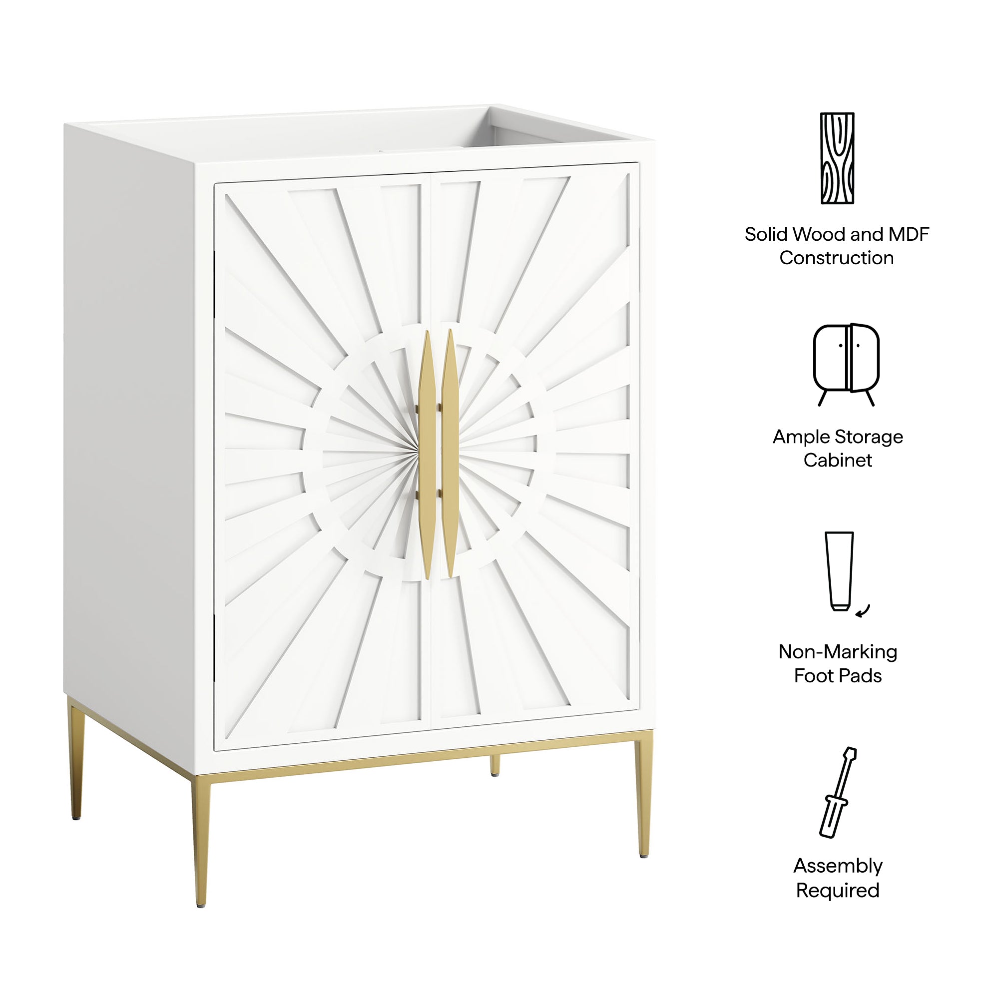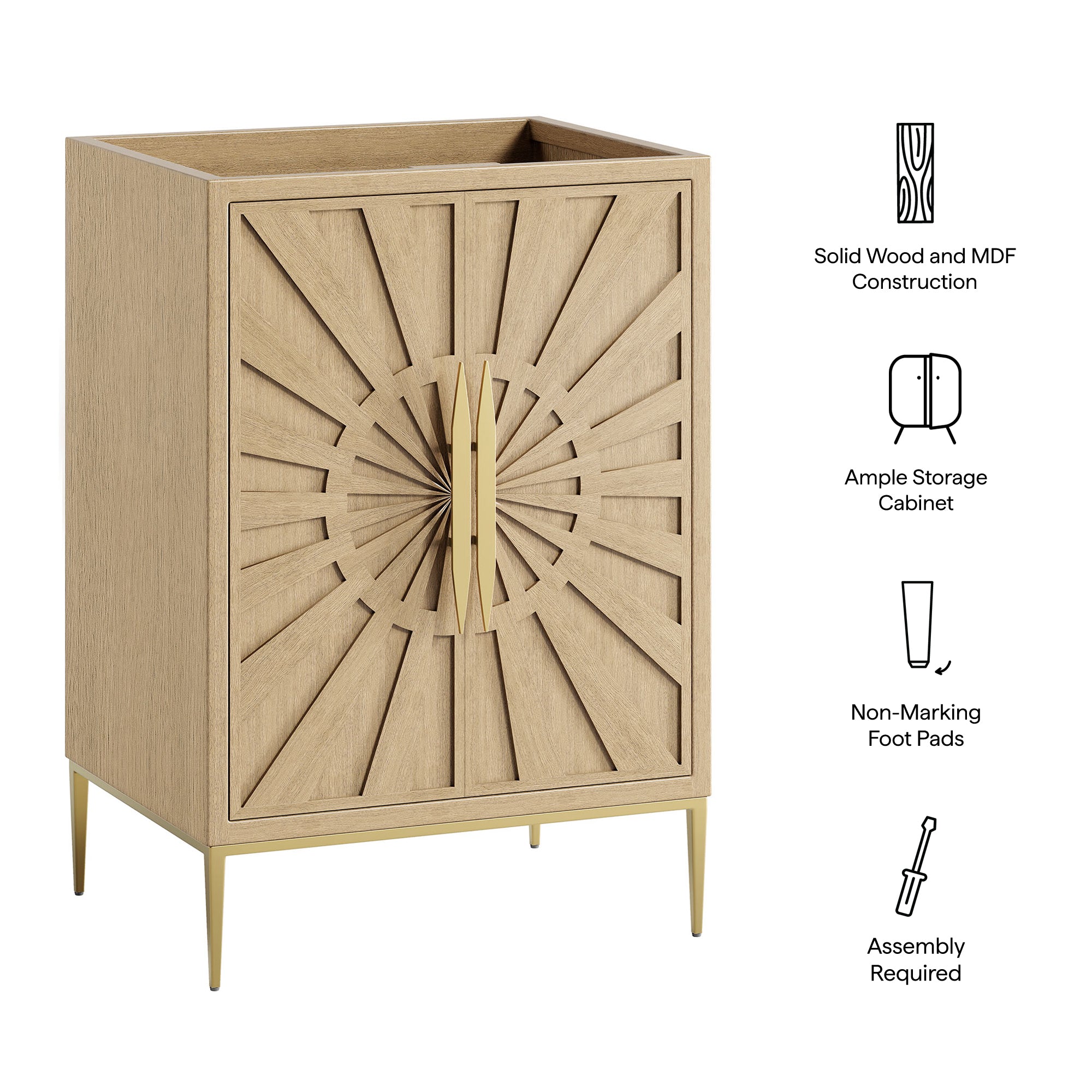 Intricate modernity radiates into your bathroom space with the Awaken 24" Bathroom Vanity Cabinet. Showcasing clean lines arranged in a radial formation, this bathroom vanity is crafted with solid wood and MDF and rests on a gold base with non-marking foot pads to protect flooring. Offering ample storage space for bathroom essentials and more, this vanity cabinet features spacious shelves hidden behind detailed doors with sleek gold hardware. Sink basin and fixtures not included. Assembly required.