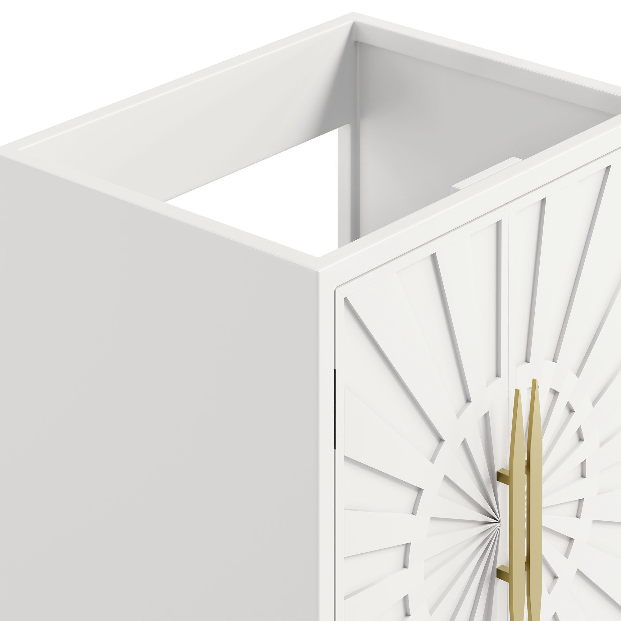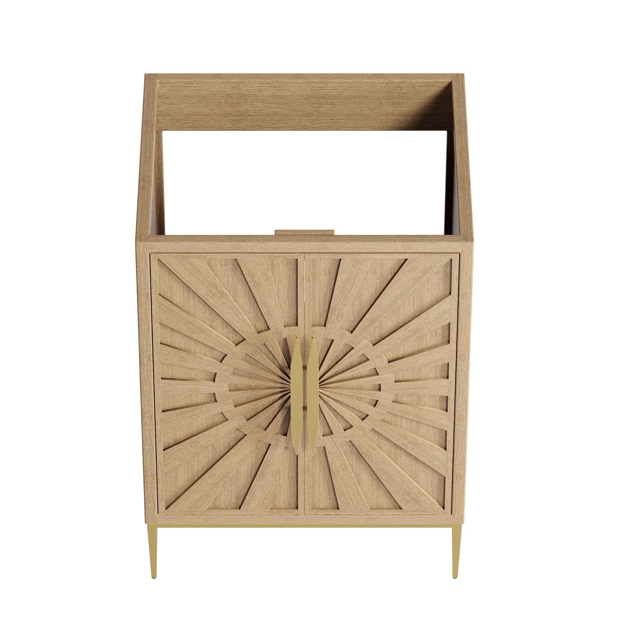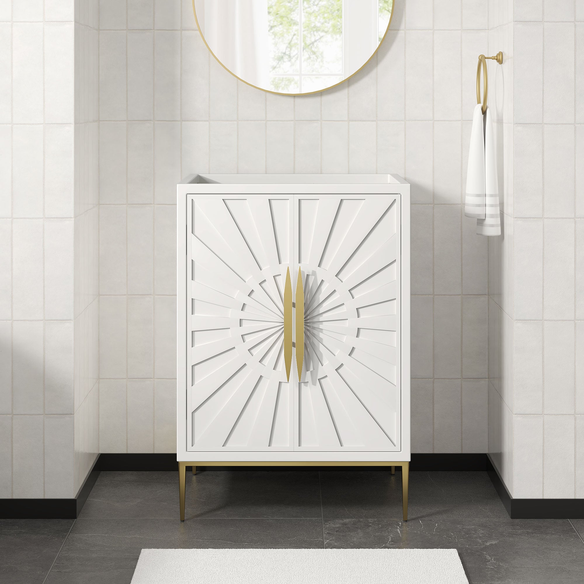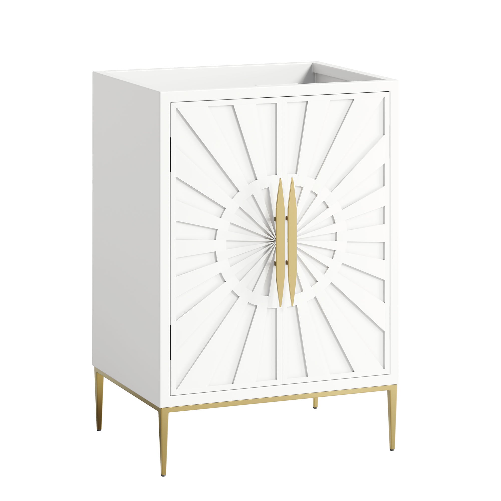 Intricate modernity radiates into your bathroom space with the Awaken 24" Bathroom Vanity Cabinet. Showcasing clean lines arranged in a radial formation, this bathroom vanity is crafted with solid wood and MDF and rests on a gold base with non-marking foot pads to protect flooring. Offering ample storage space for bathroom essentials and more, this vanity cabinet features spacious shelves hidden behind detailed doors with sleek gold hardware. Sink basin and fixtures not included. Assembly required.