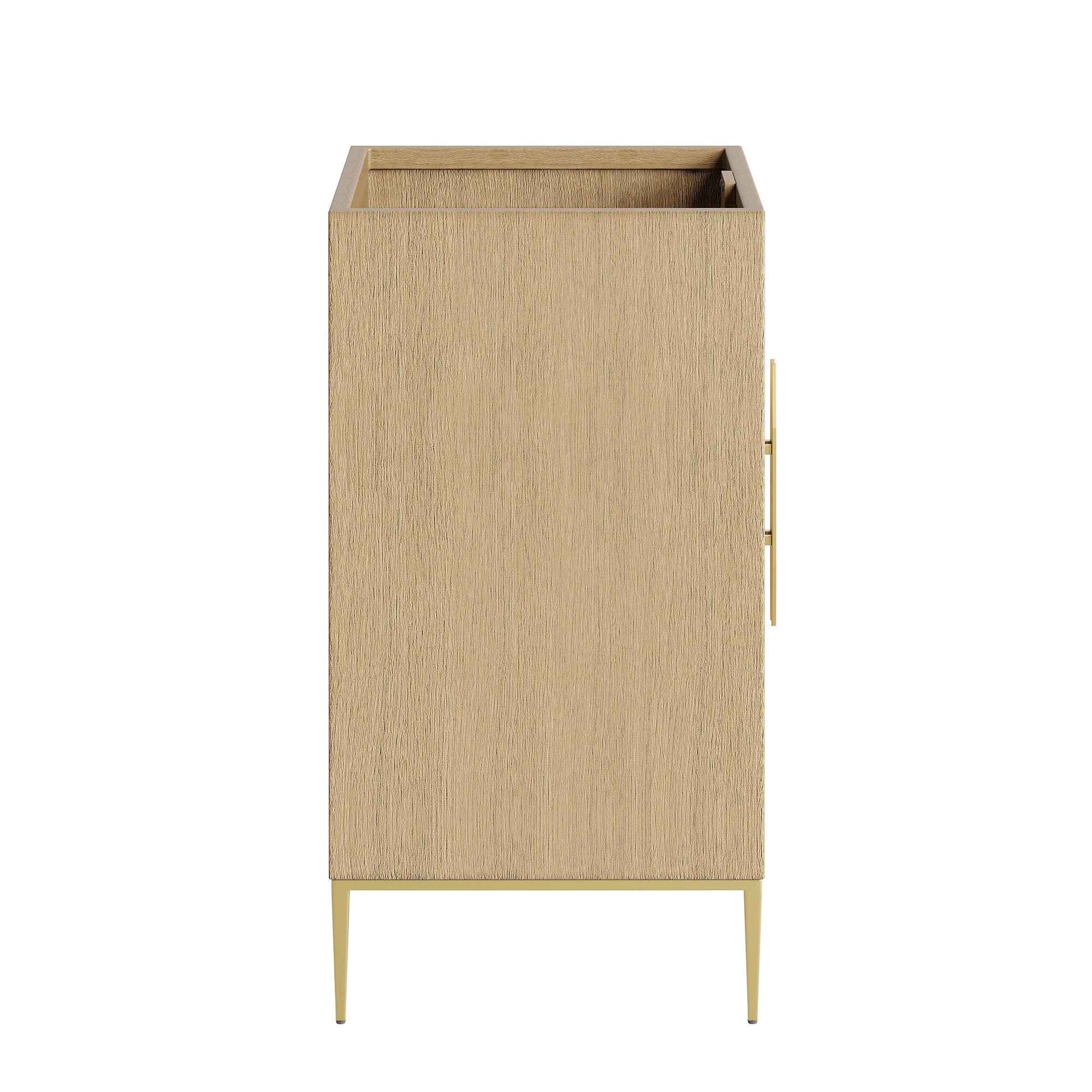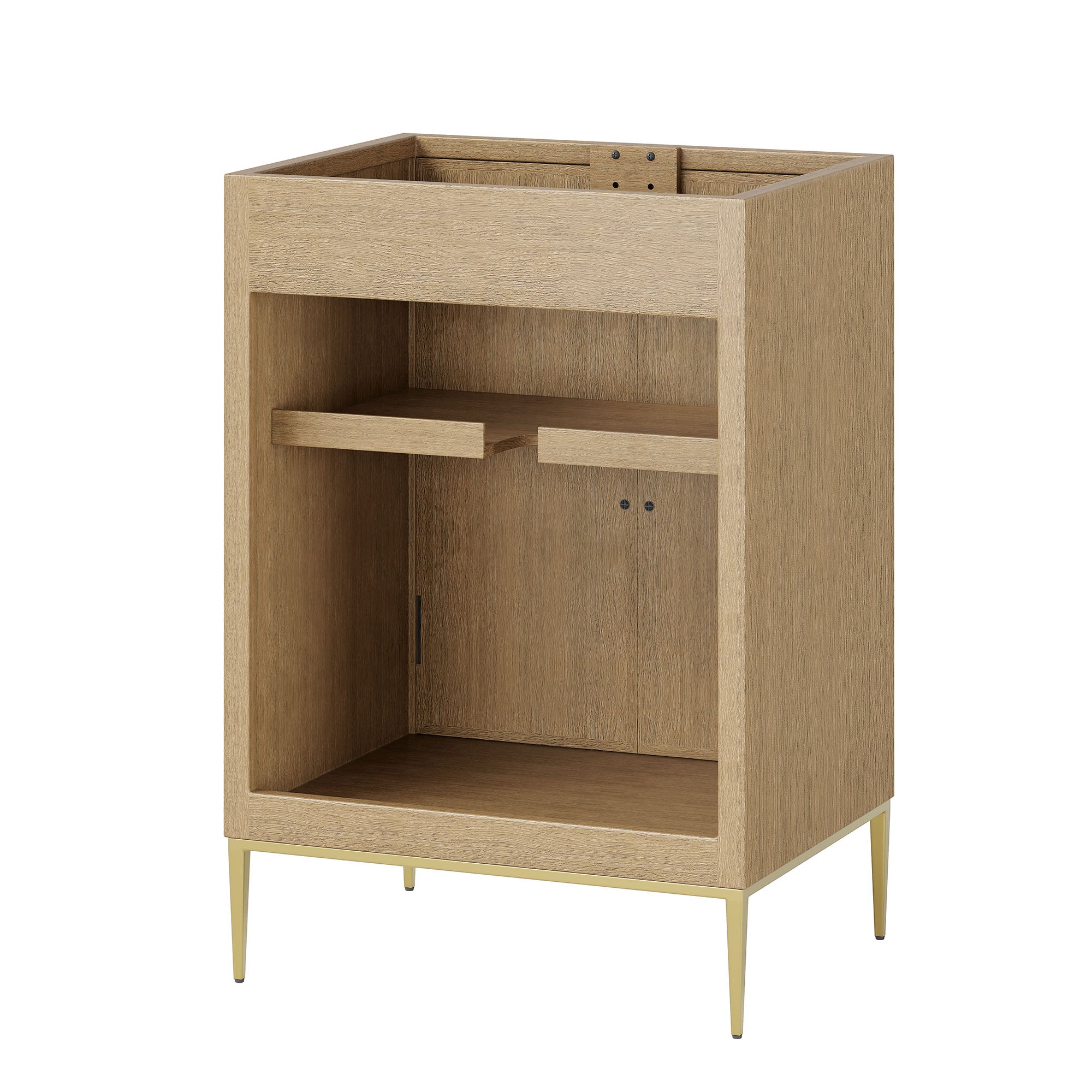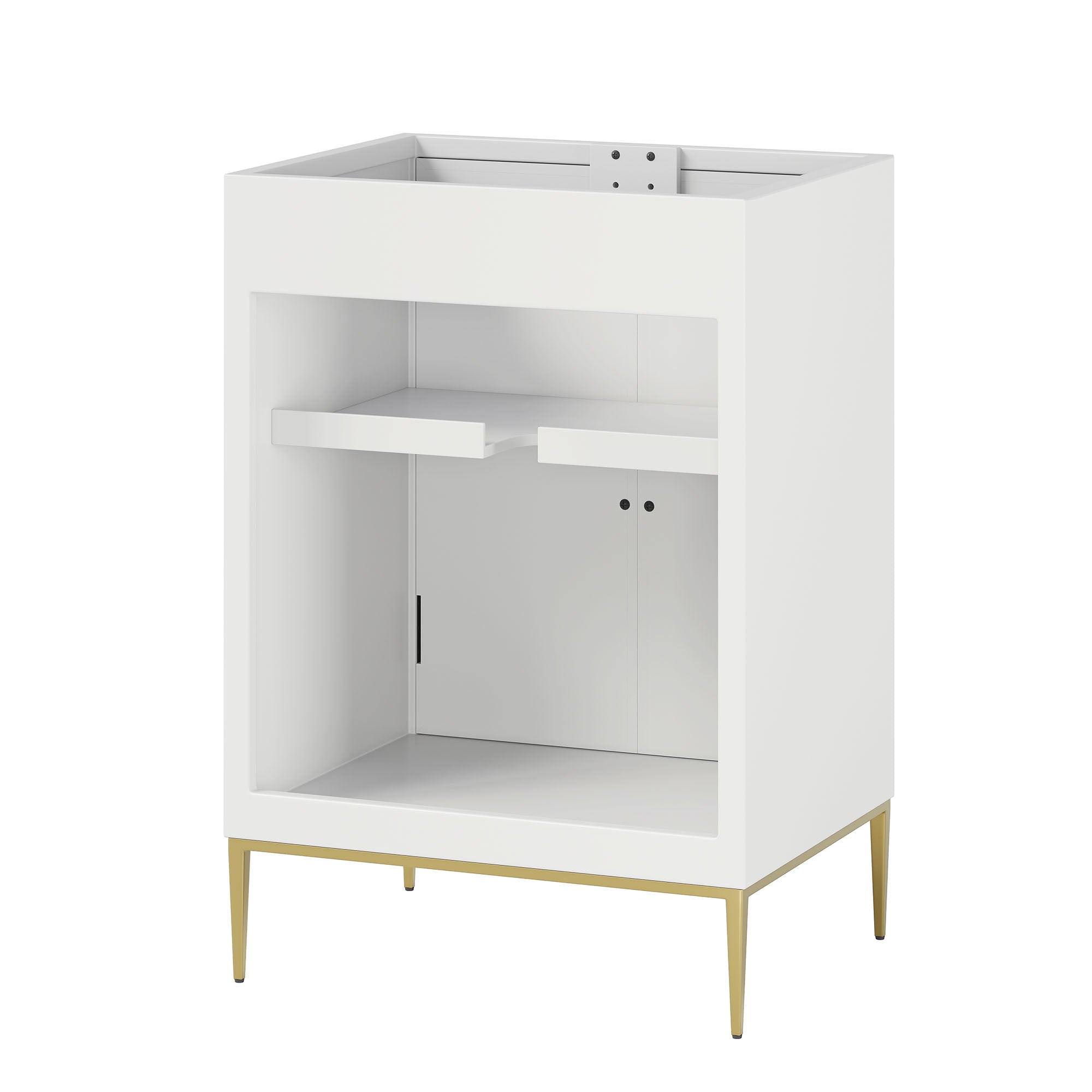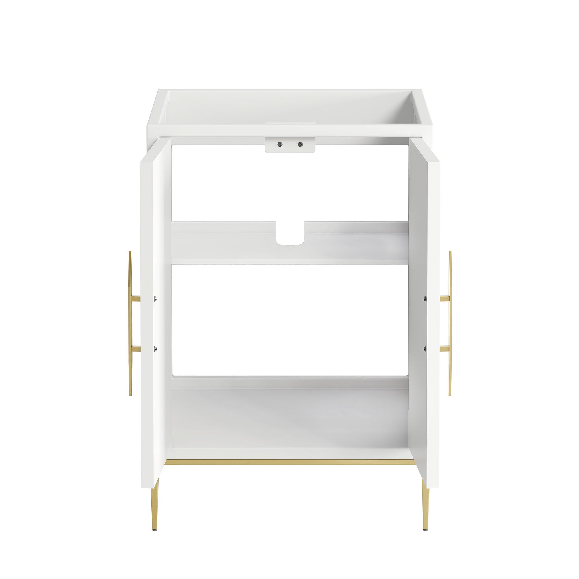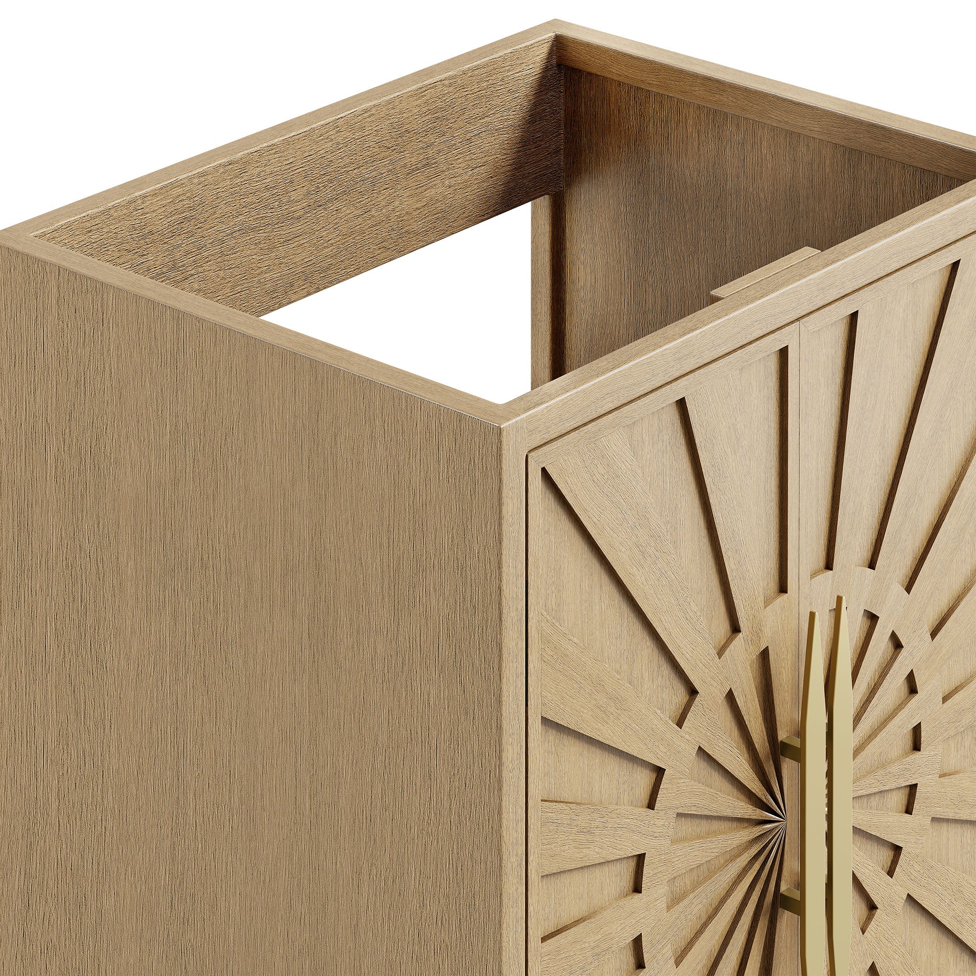 Intricate modernity radiates into your bathroom space with the Awaken 24" Bathroom Vanity Cabinet. Showcasing clean lines arranged in a radial formation, this bathroom vanity is crafted with solid wood and MDF and rests on a gold base with non-marking foot pads to protect flooring. Offering ample storage space for bathroom essentials and more, this vanity cabinet features spacious shelves hidden behind detailed doors with sleek gold hardware. Sink basin and fixtures not included. Assembly required.