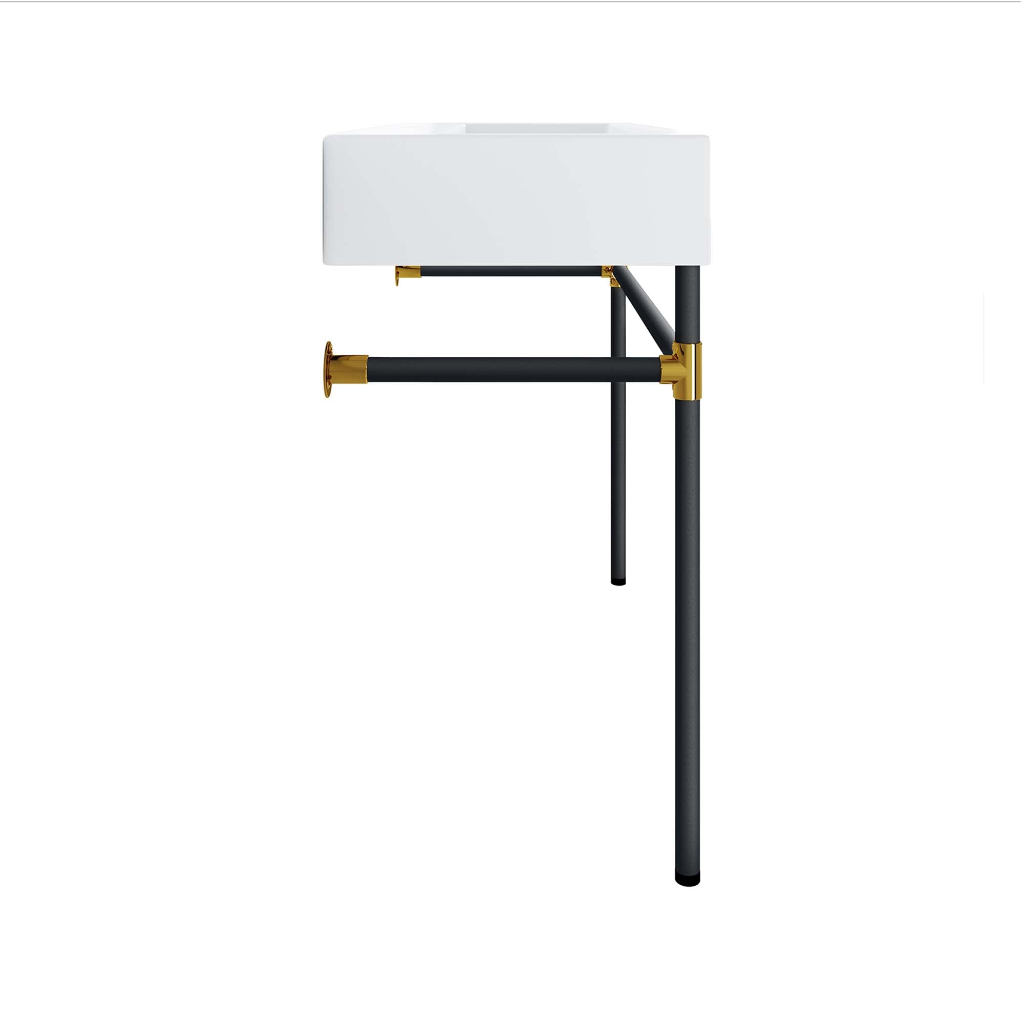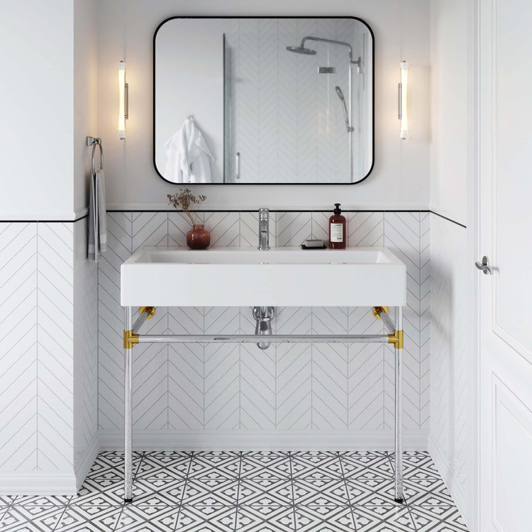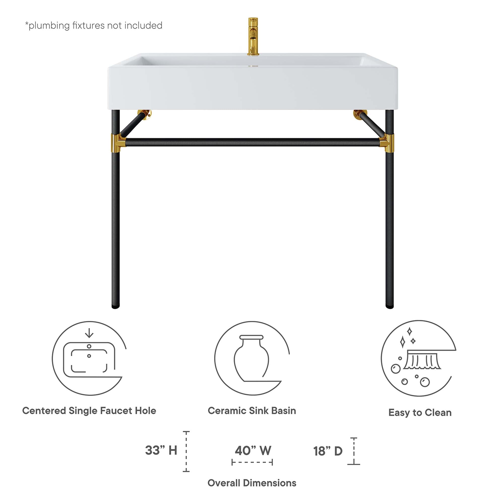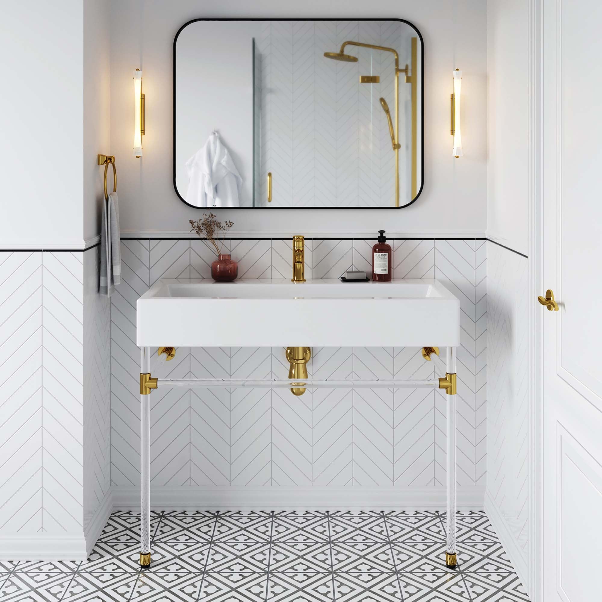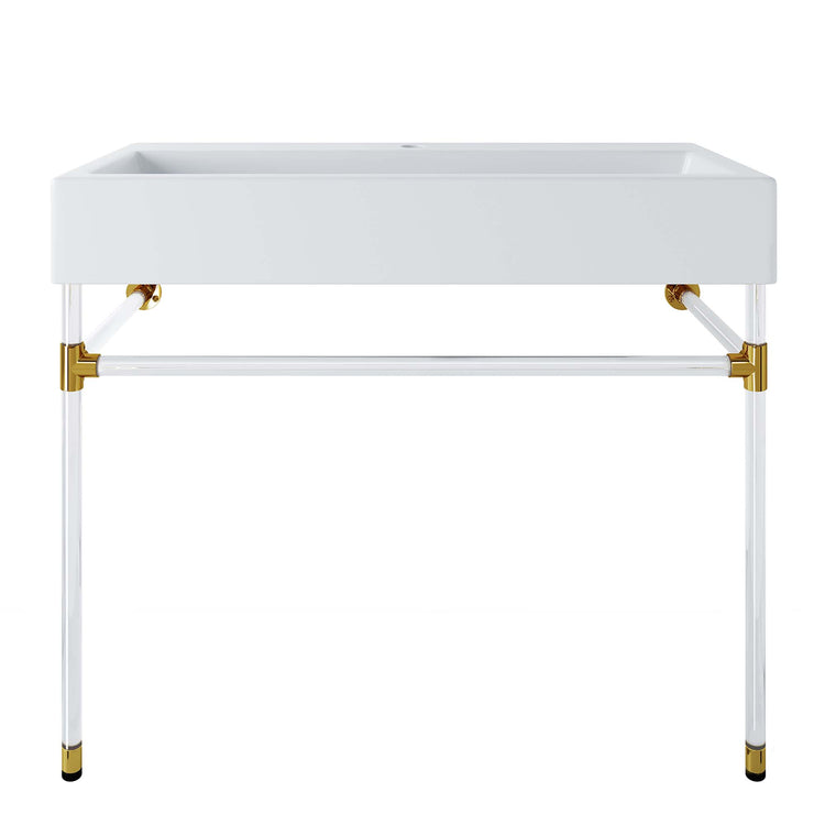 Create a bathroom oasis with the minimalist style and efficiency of the Redeem Wall-Mount Acrylic Bathroom Vanity. The glossy white ceramic sink basin and streamlined acrylic frame affix directly and securely to the bathroom or powder room wall. Redeem dispenses gentility in spaces large and small, resting confidently on a sturdy acrylic frame with gold joints for added stability. This small bathroom vanity has a single faucet hole and is outfitted with non-marking foot caps to protect your bathroom floor. Assembly required and fixtures not included.