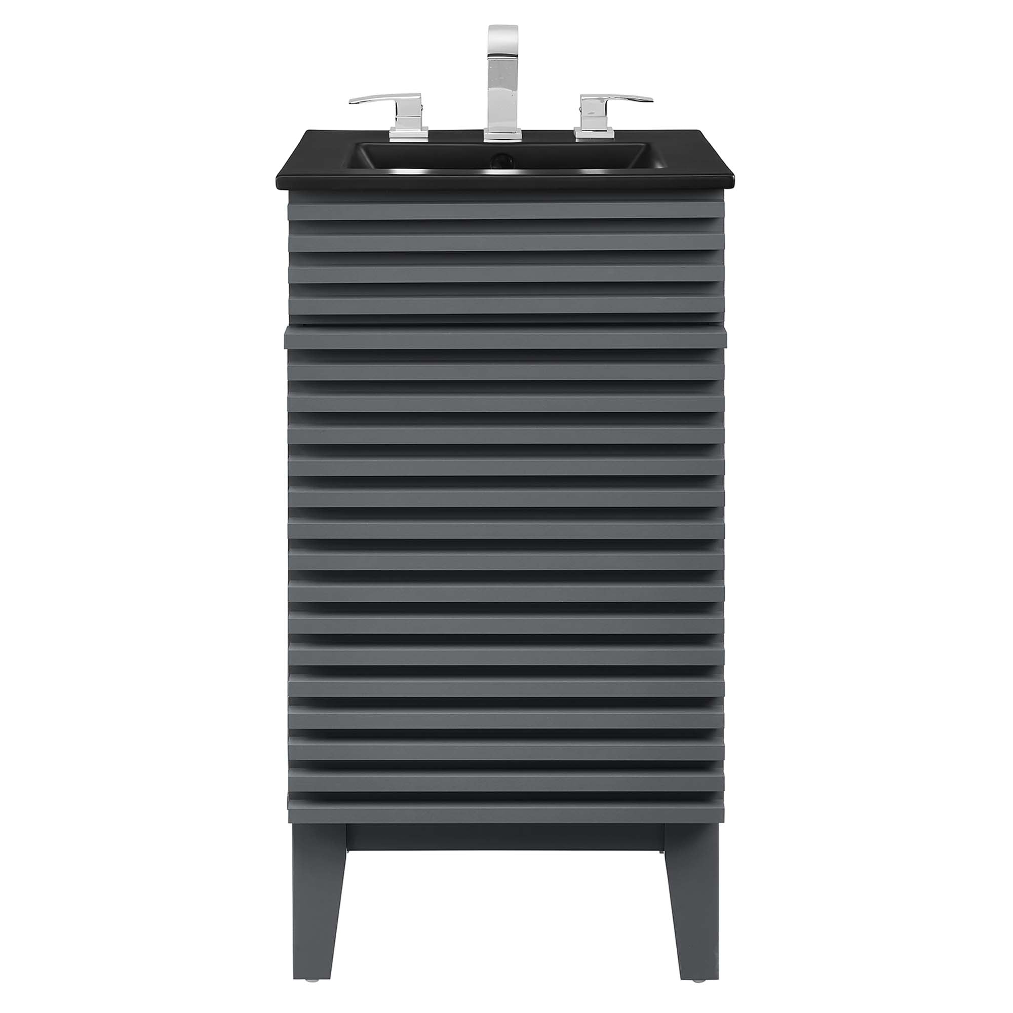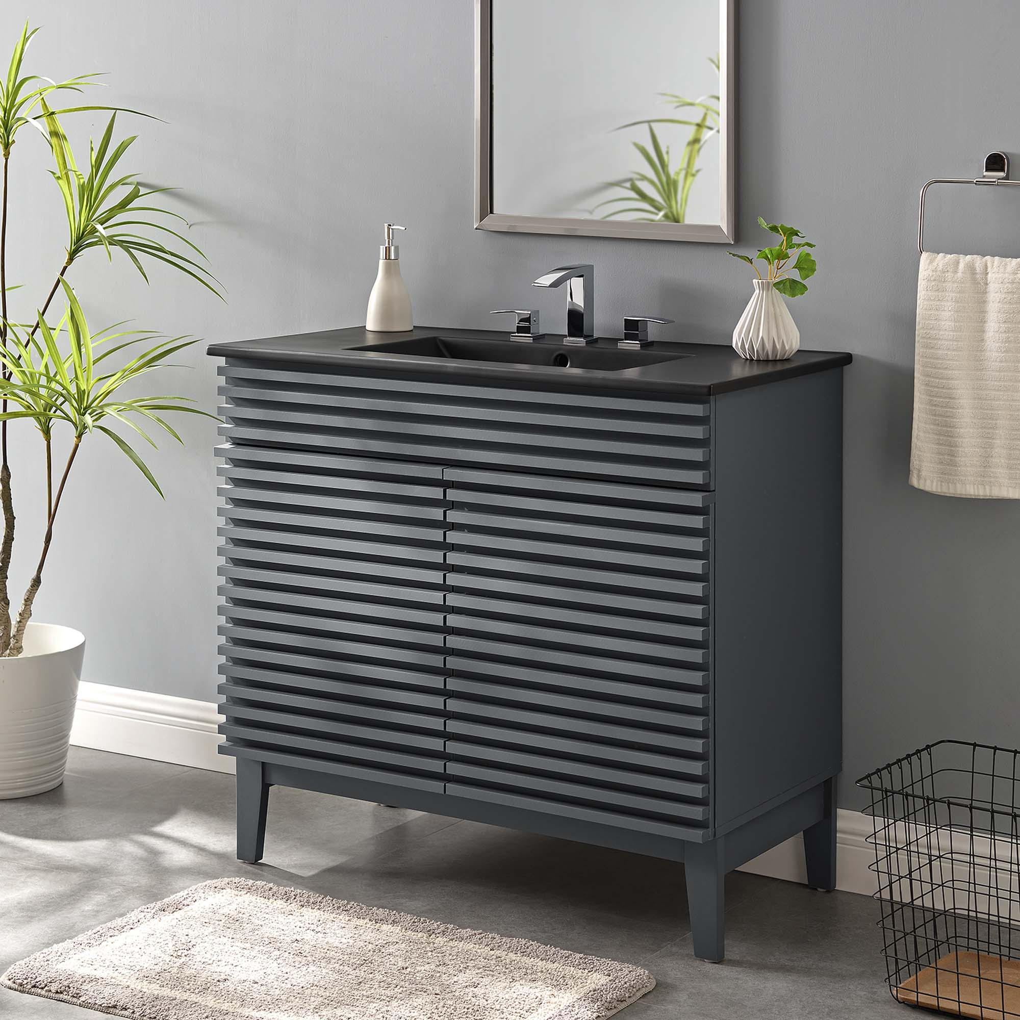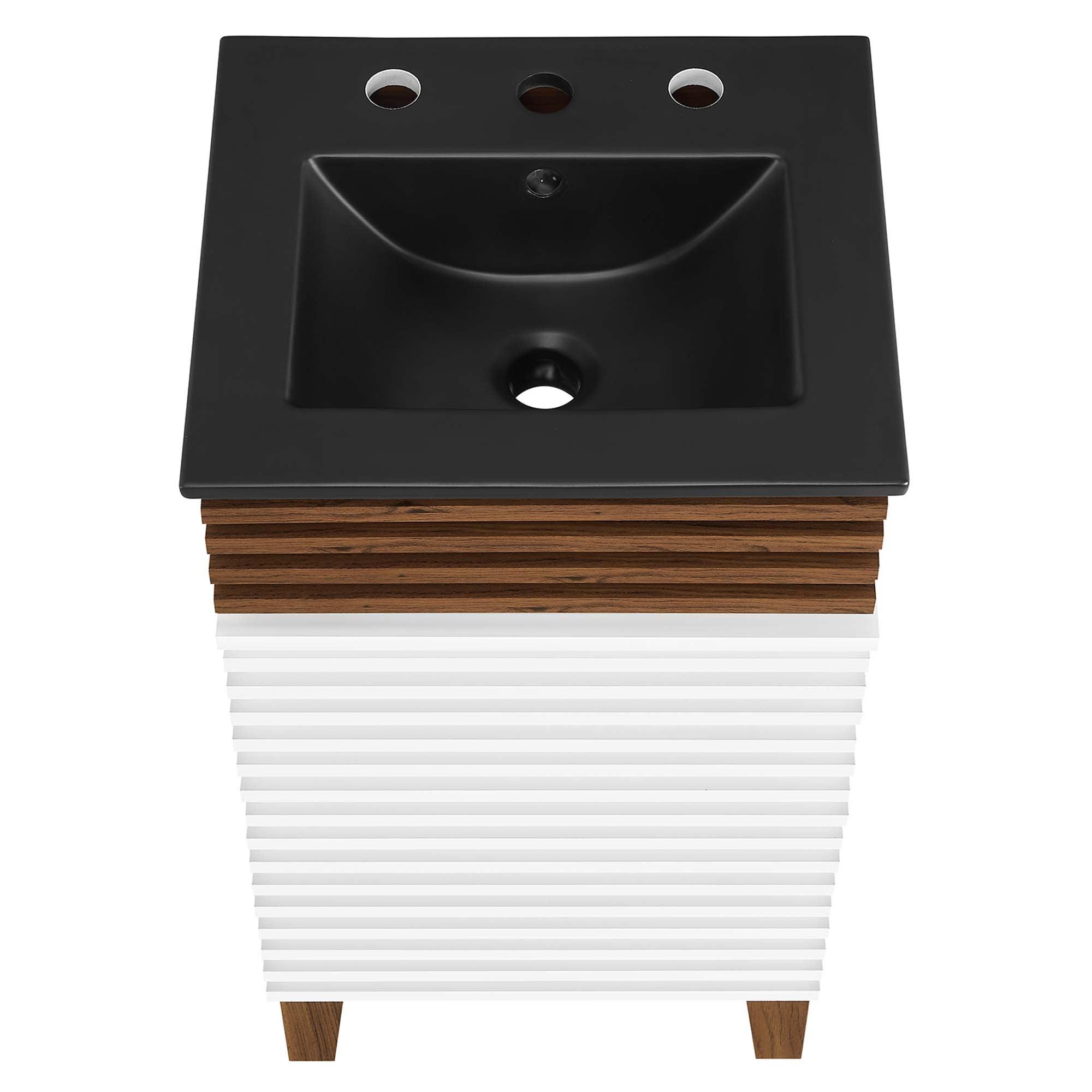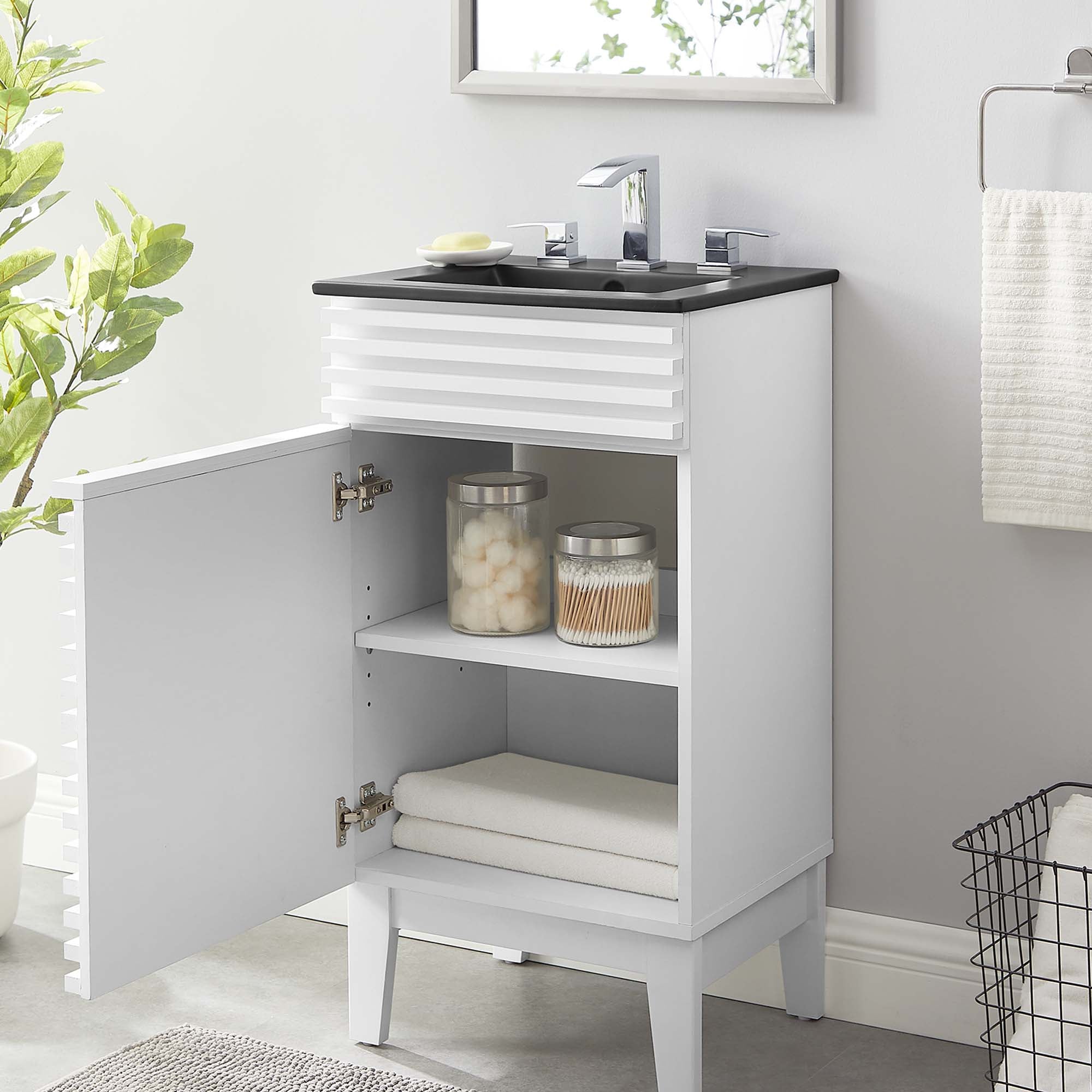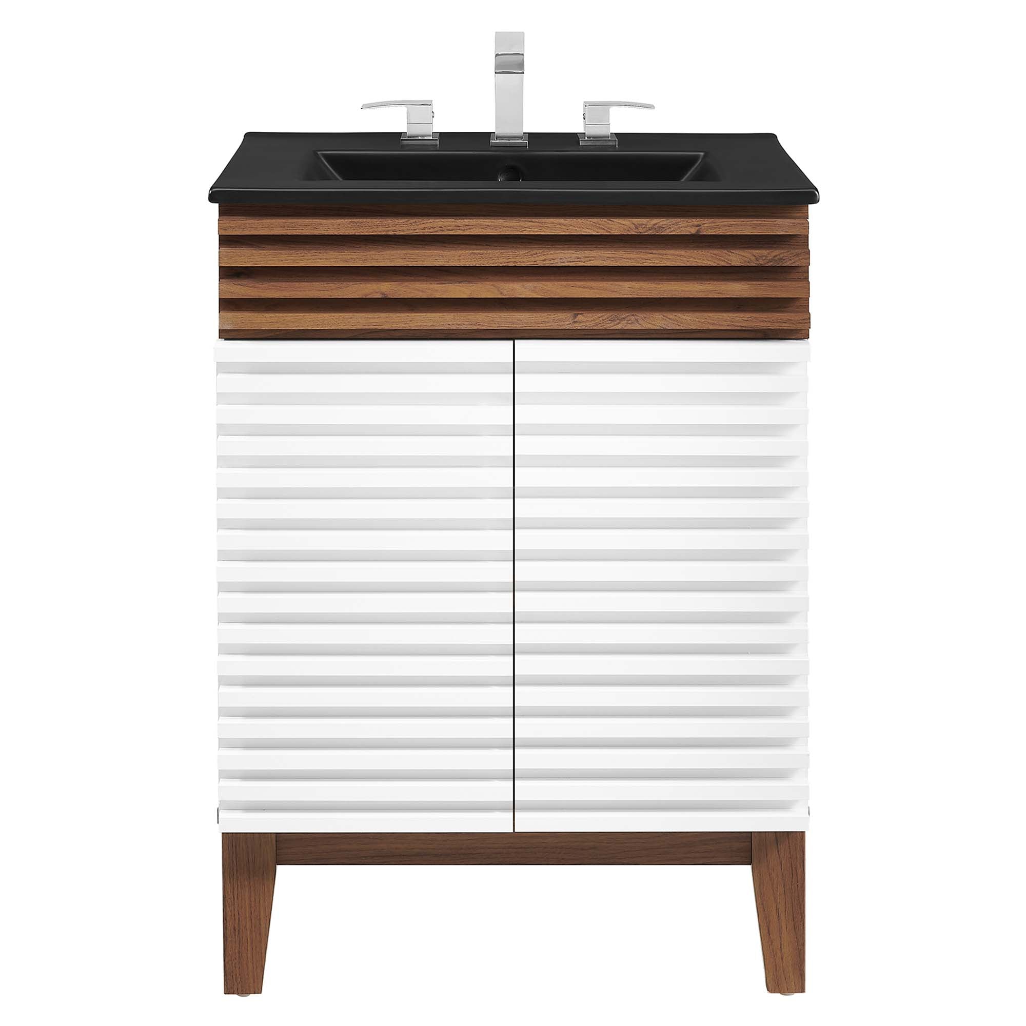Tap into mid-century aesthetics with the Render Vanity. Render Bathroom Vanity features a durable particleboard frame with smooth laminate, four tapered wood legs, and adjustable storage shelf behind two soft-close hinged doors. A curved ceramic basin and integrated countertop with three faucet holes create sleek lines and crisp design for an edgy style designed to meet your needs. Boasting a mid-century modern style this vanity features a solid construction with a pleasing look and practical functionality. 8" widespread faucet holes. Assembly required and fixtures not included.