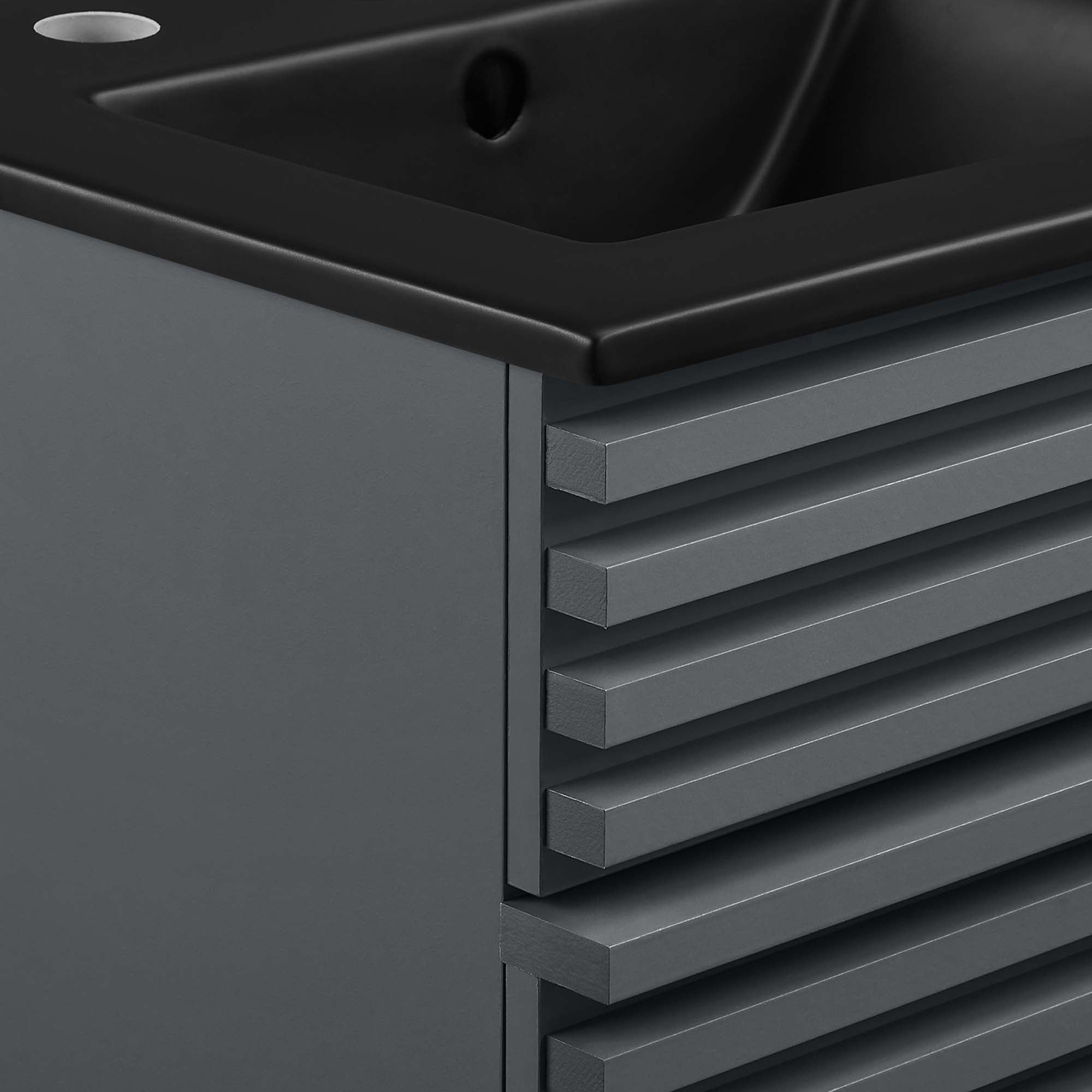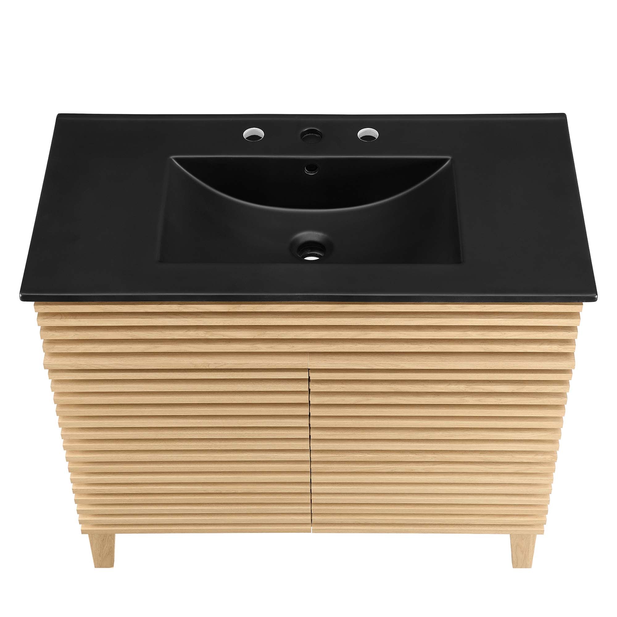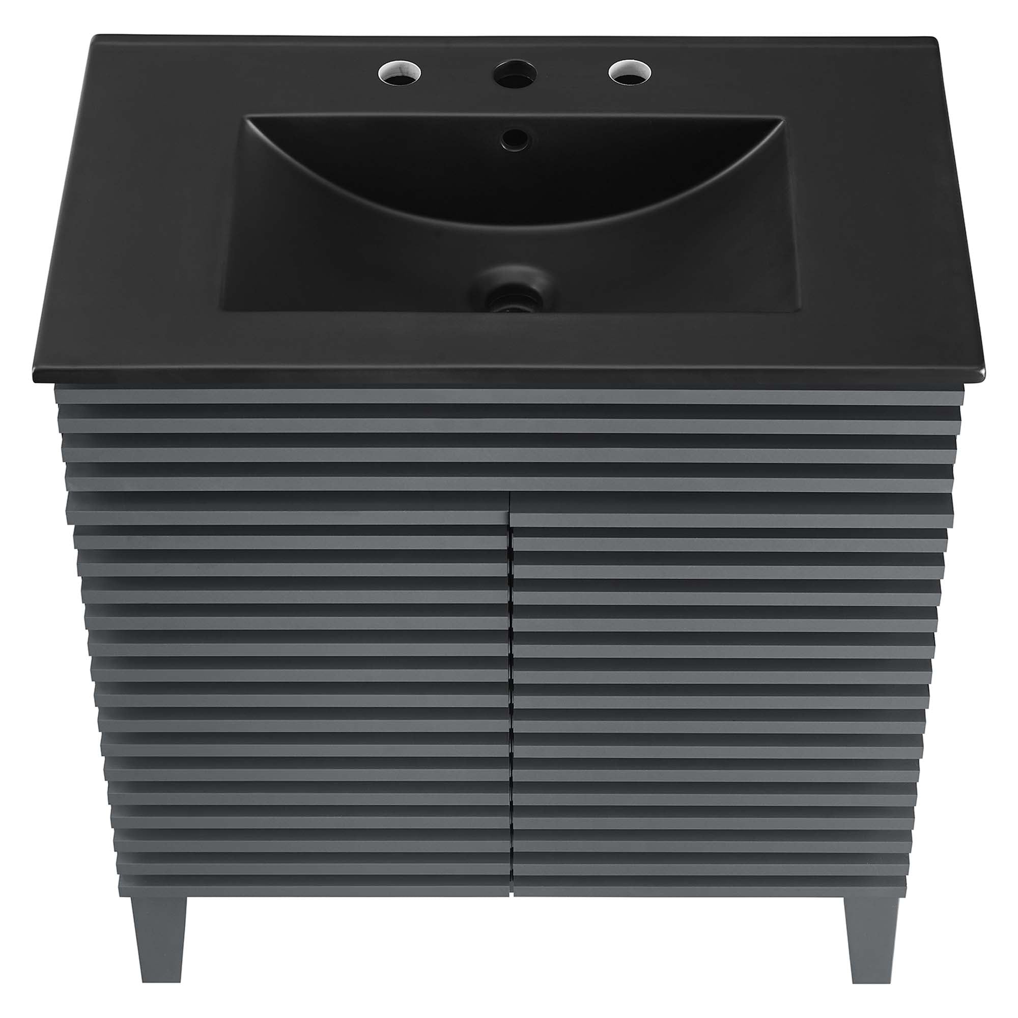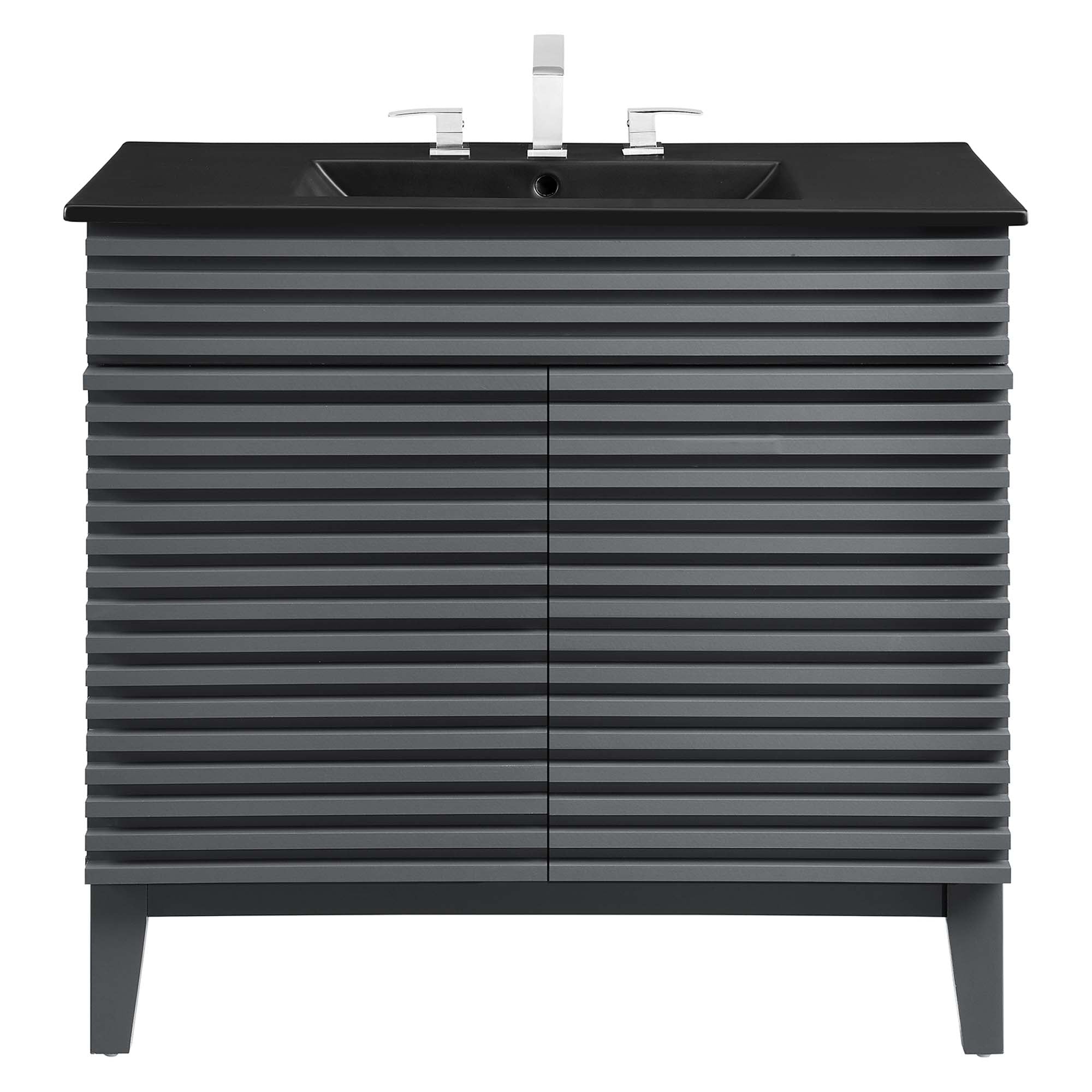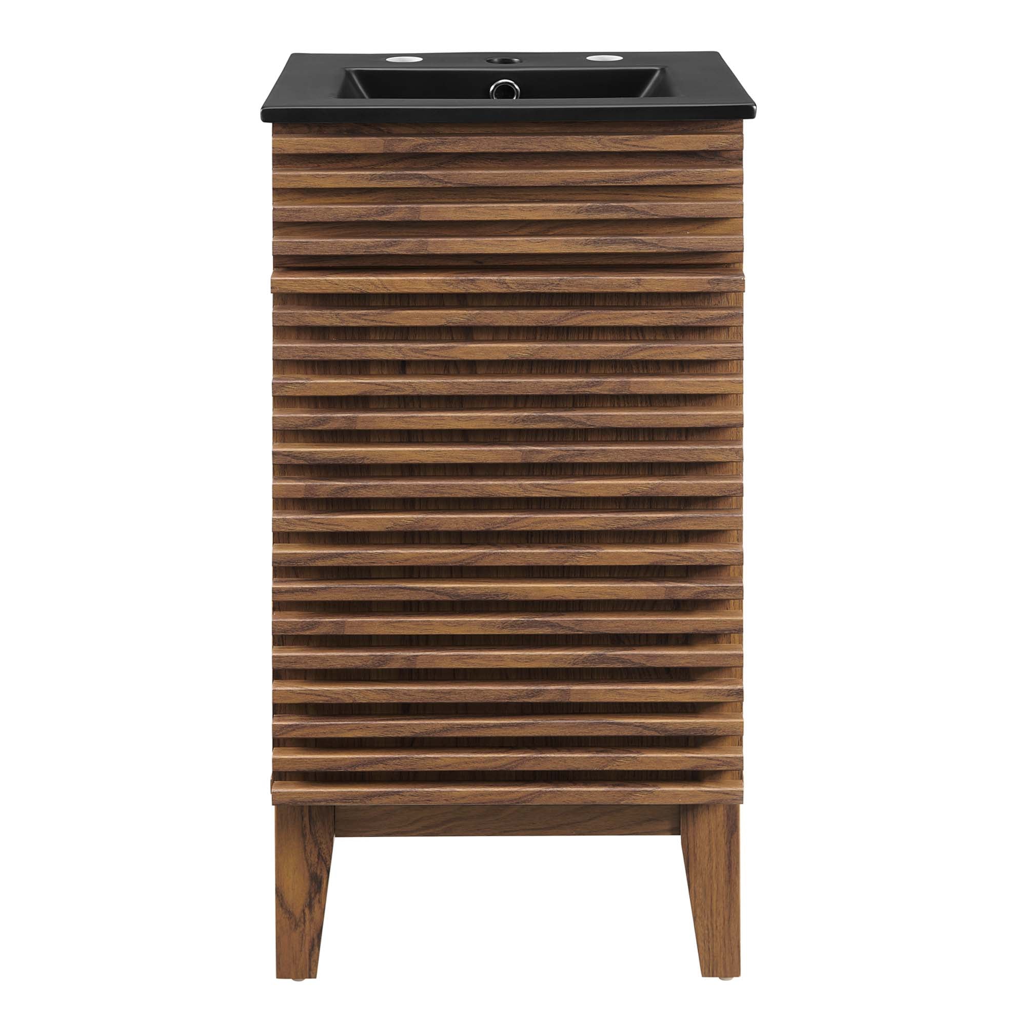 Tap into mid-century aesthetics with the Render Vanity. Render Bathroom Vanity features a durable particleboard frame with smooth laminate, four tapered wood legs, and adjustable storage shelf behind two soft-close hinged doors. A curved ceramic basin and integrated countertop with three faucet holes create sleek lines and crisp design for an edgy style designed to meet your needs. Boasting a mid-century modern style this vanity features a solid construction with a pleasing look and practical functionality. 8" widespread faucet holes. Assembly required and fixtures not included.
