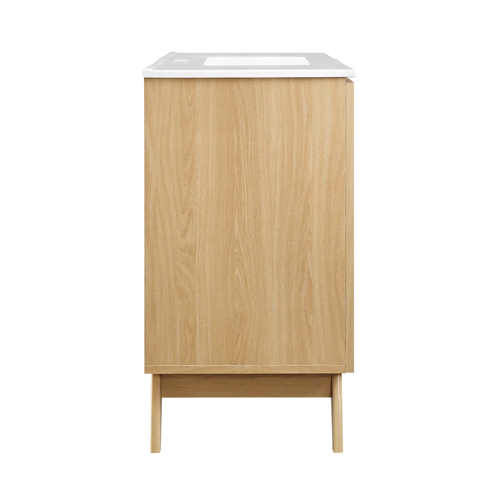 Introduce refreshing style to your restroom with the Soma 18" Bathroom Vanity. Showcasing a beautiful rattan weave on the cupboard door, this vanity brings organic aesthetics and modern functionality to any bathroom or powder room. Crafted from durable MDF and particleboard with a natural wood grain finish, this vanity boasts a ceramic sink basin with 8-inch widespread holes and an integrated countertop. This vanity features an adjustable shelf, providing easy customization for arranging towels, toiletries, and bathroom necessities. Complete with a metal doorknob with a brushed gold finish and soft-close hinges, this bathroom vanity cabinet is designed for quiet and effortless functionality. Resting on splayed legs, the Soma Bathroom Vanity includes non-marking foot caps to protect flooring. Assembly required. Fixtures not included.