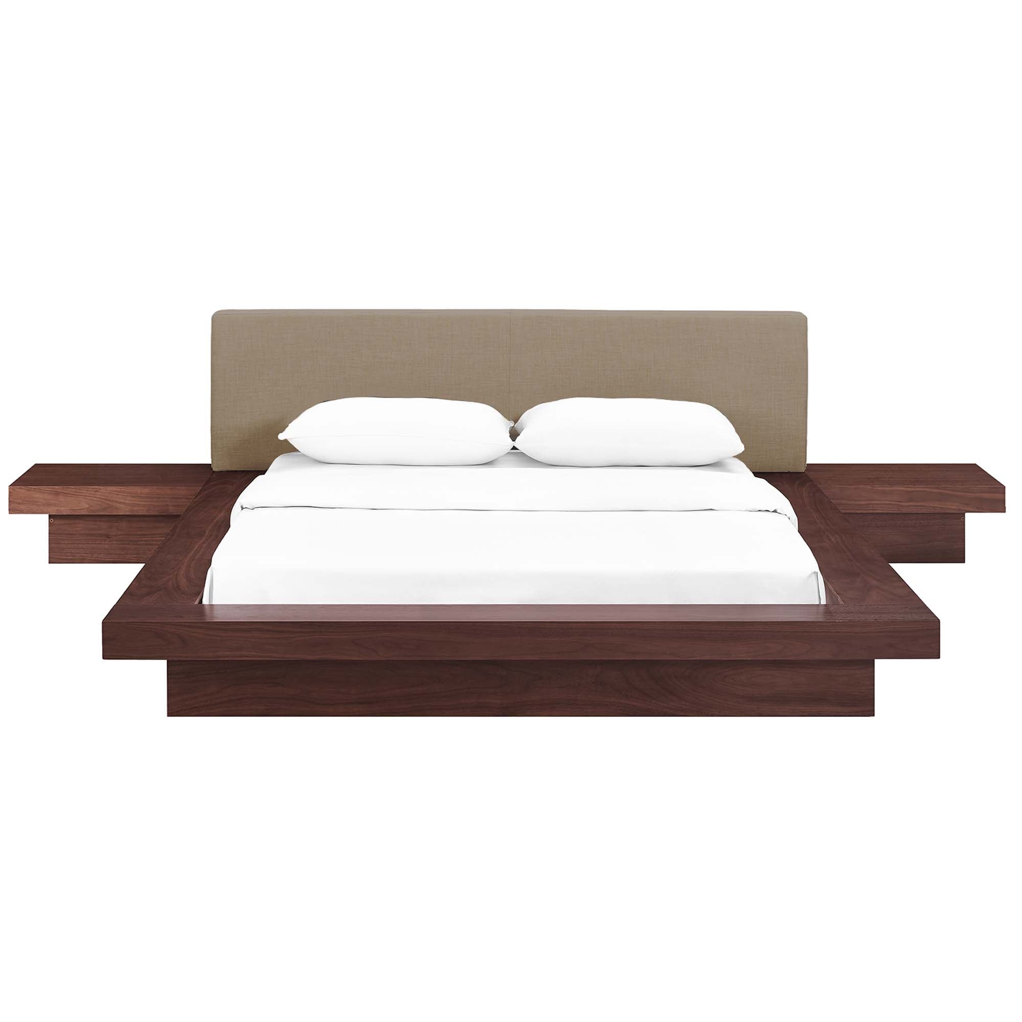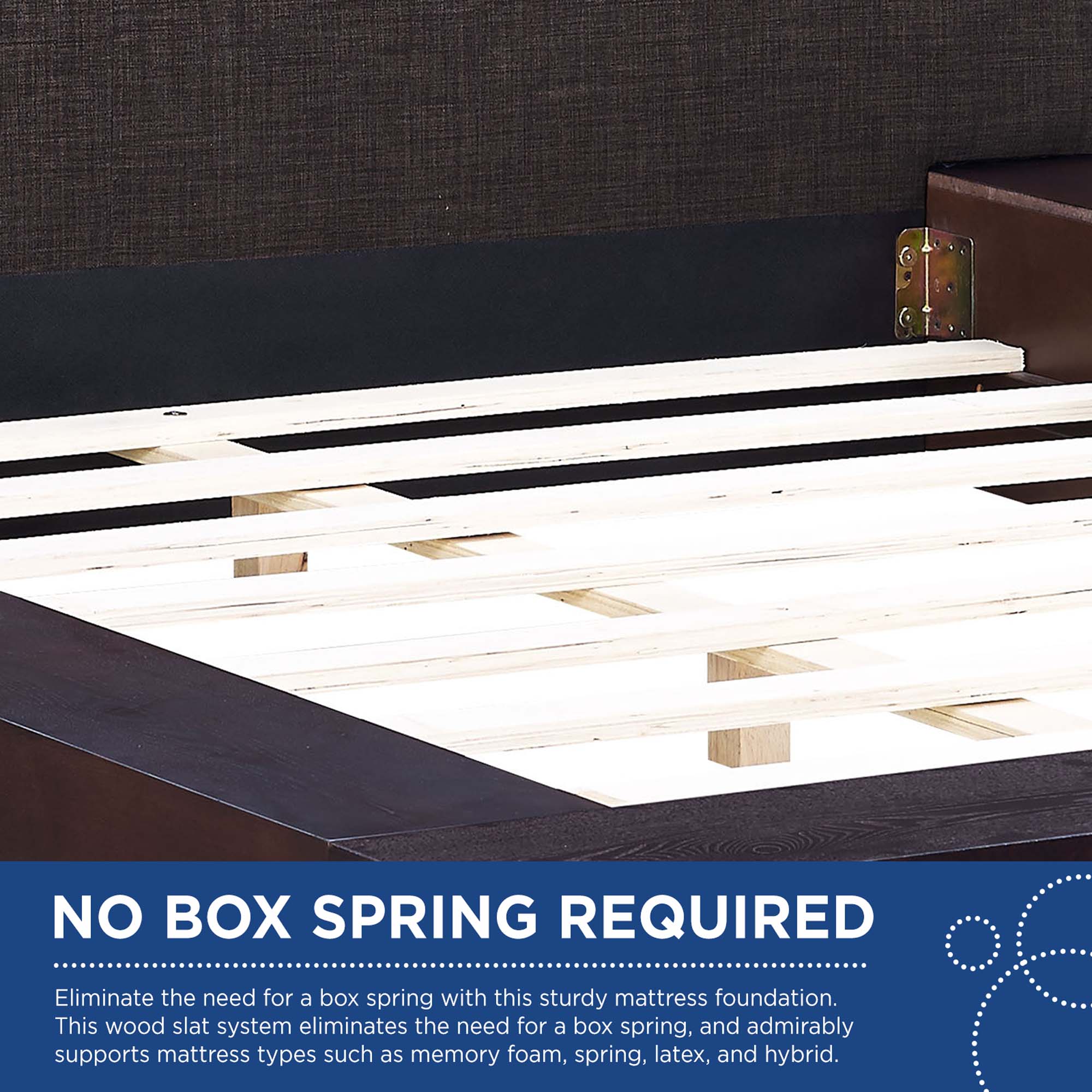 Instantly transform your bedroom landscape with the Freja Bedroom Set. Designed with clean straight lines and a compelling aesthetic, Freja features a sturdy laminated particleboard base with cappuccino veneer, foam-padded headboard upholstered in polyester fabric, slatted support that eliminates the need for a box spring, and a reinforced center beam with supporting legs for maximal stability. Update your bedroom décor with an engaging platform bed which evinces a refined look and striking design. Freja admirably supports mattress types such as memory foam, spring, latex, and hybrid. Mattress Not Included.