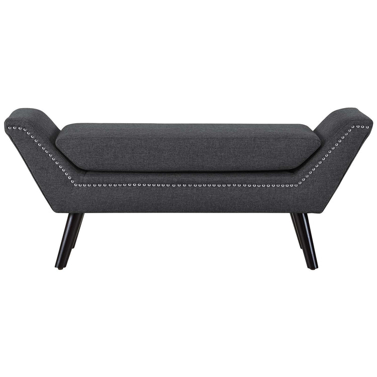 Roll out the charm with Gambol. Finely upholstered in polyester fabric and densely padded with just the right amount of give, Gambol is a comfortable bench supported by black finish dowel wood legs and non-marking foot caps. Decorated with polished silver accent nailhead trim, update your home today with a solidly made bench that complements any modern décor.