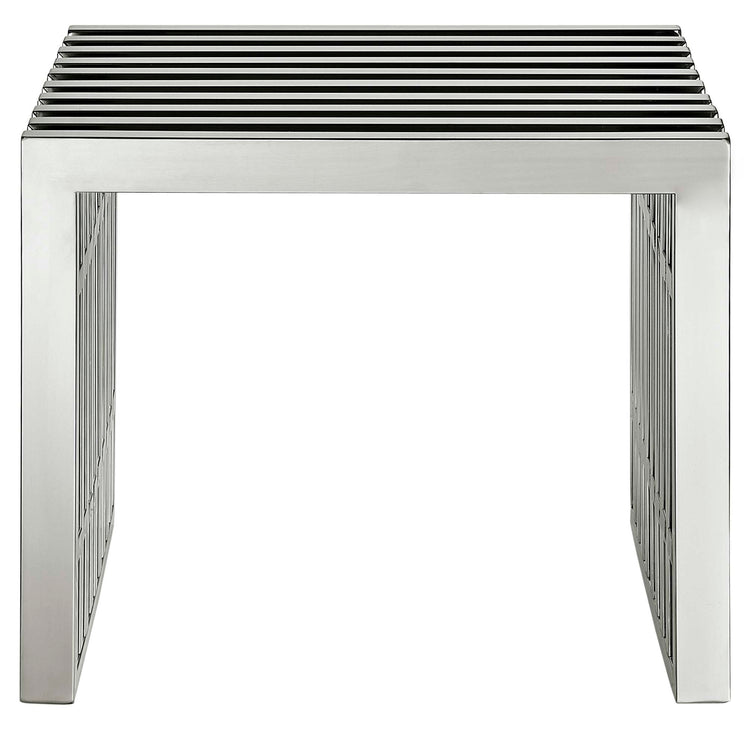 Silver rivers of laughter race back and forth in this high energy modern piece. Gridiron's sleek stainless steel bench contains a message of transformation and metamorphosis. Exuberance abounds as the strategic placement of this piece will radiate a happy atmosphere.