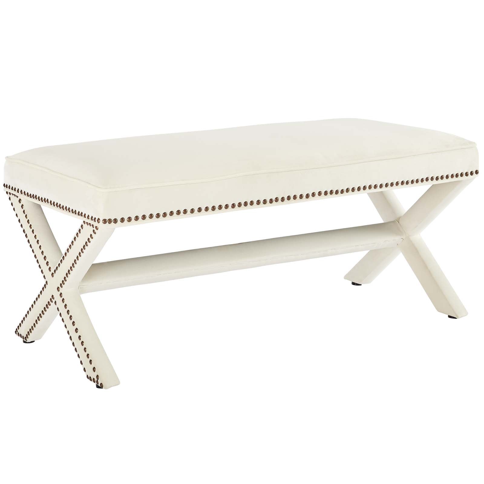 Add charm to your home or apartment décor with the Rivet Performance Velvet Accent Bench. Featuring timeless nailhead trim, an elegant X-base frame, and surrounded by stain-resistant performance velvet fabric with dense foam padding, Rivet is a perfectly soft and cozy bench for the chic modern lifestyle. Rivet is available in a variety of engaging colors and is the perfect addition to bed, living, and lounge rooms. Bench Weight Capacity: 331 lbs