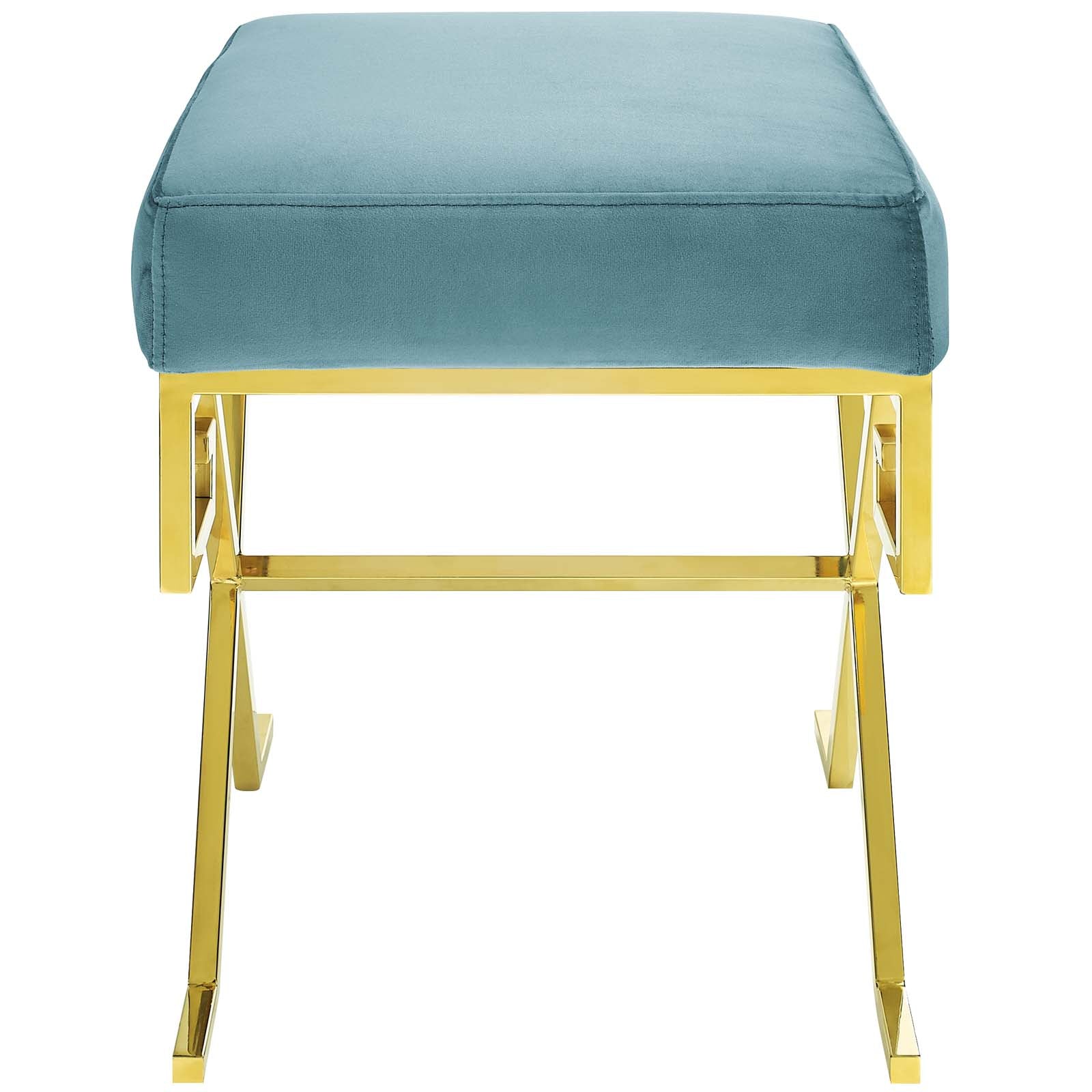 Embrace modern whimsy with Twist Performance Velvet Accent Bench. Brimming with energy and a sleek modern look, Twist features a polished gold stainless steel base with a Greek Key design and a dense foam padded performance velvet upholstered top. A striking statement piece in the living room, bedroom or lounge area, Twist can support up to 331 pounds and comes with foot pads to help protect your flooring.