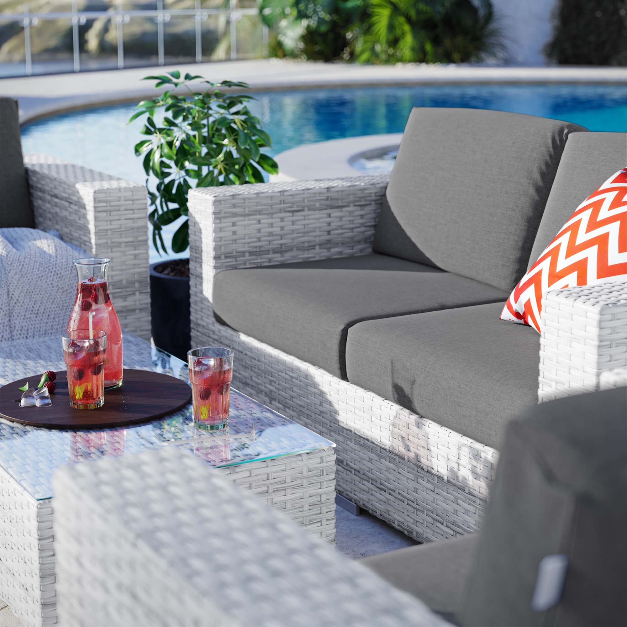 Gather stages of sensitivity with the Convene Outdoor Series. Made with a synthetic rattan weave and a powder-coated aluminum frame, Convene is a versatile outdoor furniture set that shifts and combines according to the spontaneous needs of the moment. Outfitted with all-weather fabric cushions, the Convene Sectional Set leaves a positive impression on friends and family while enhancing your patio, backyard, or poolside retreat with palpable distinction. This outdoor patio furniture set includes two armchairs, a loveseat, and a coffee table.
