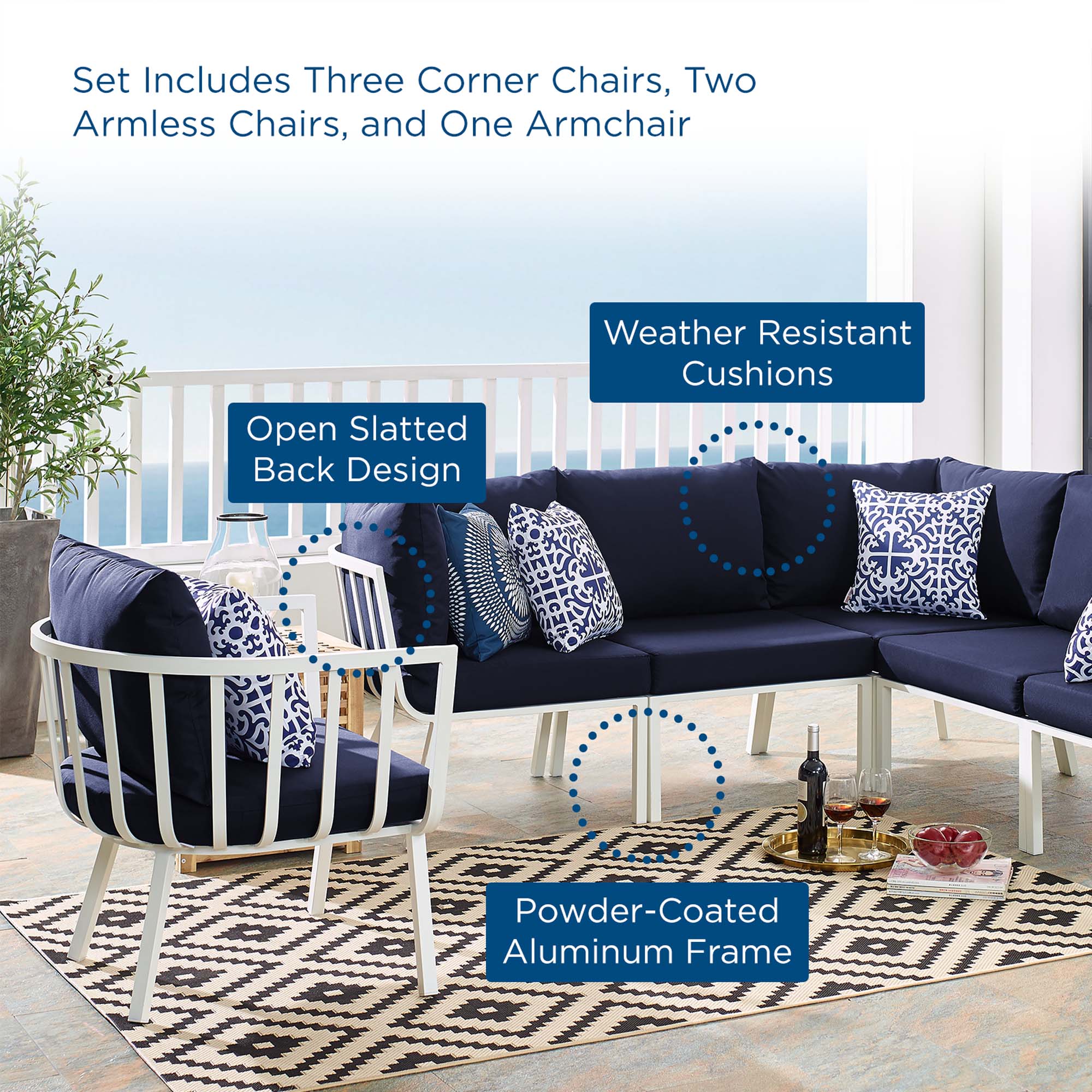 Refresh your outdoor decor with the Riverside Outdoor Patio Aluminum Sectional Set. This set includes one Riverside Outdoor Patio Armchair. Defined by a crisp, coastal style, this installment of the Riverside outdoor sectional sofa furniture collection features an open slatted back design, angled back legs, and plush 4" thick all-weather UV-resistant fabric cushions. Solidly constructed with a powder-coated aluminum frame, the Riverside outdoor sectional will enhance the look of your patio, backyard, balcony, porch, deck, or poolside area. Includes foot caps. Seat Weight Capacity: 300 lbs
