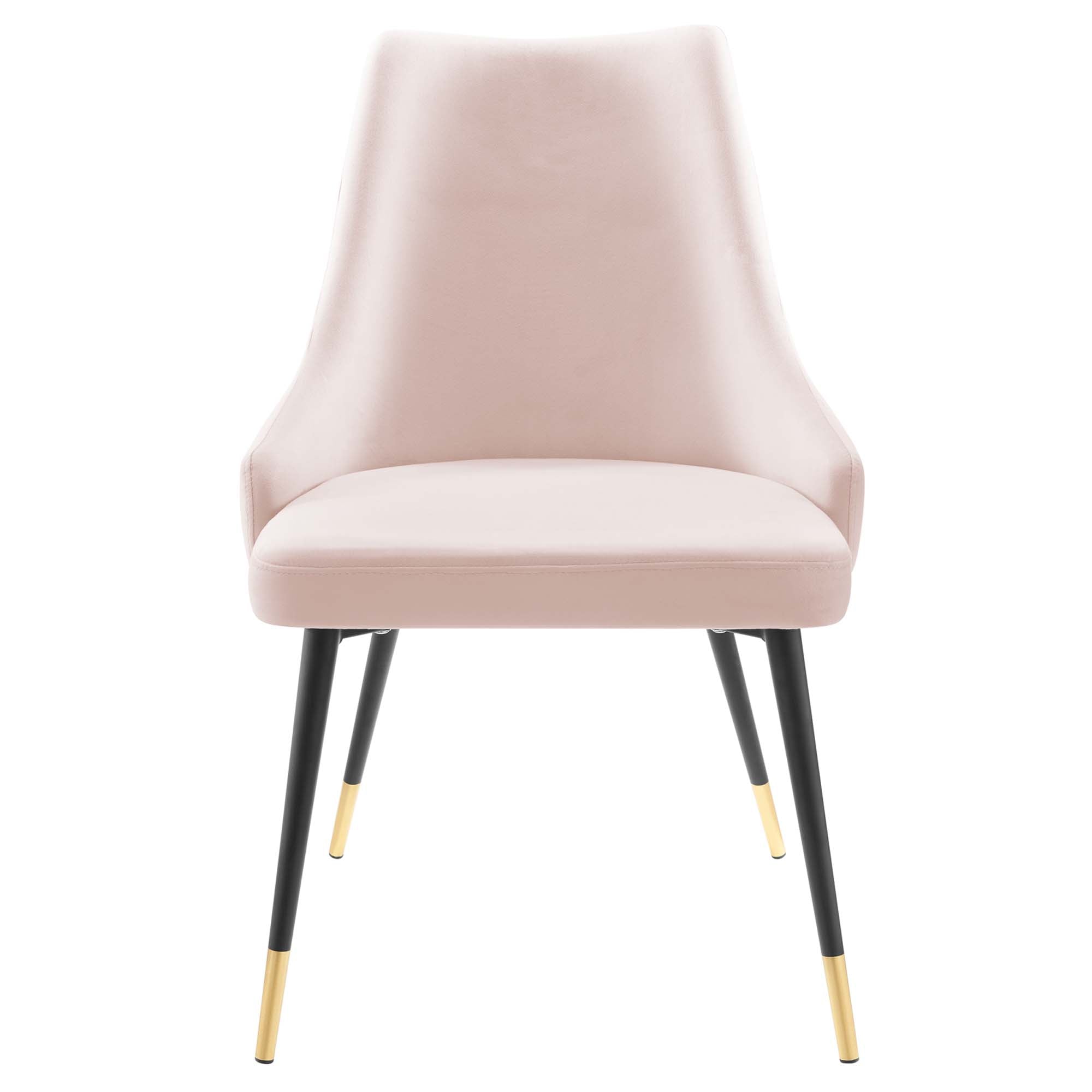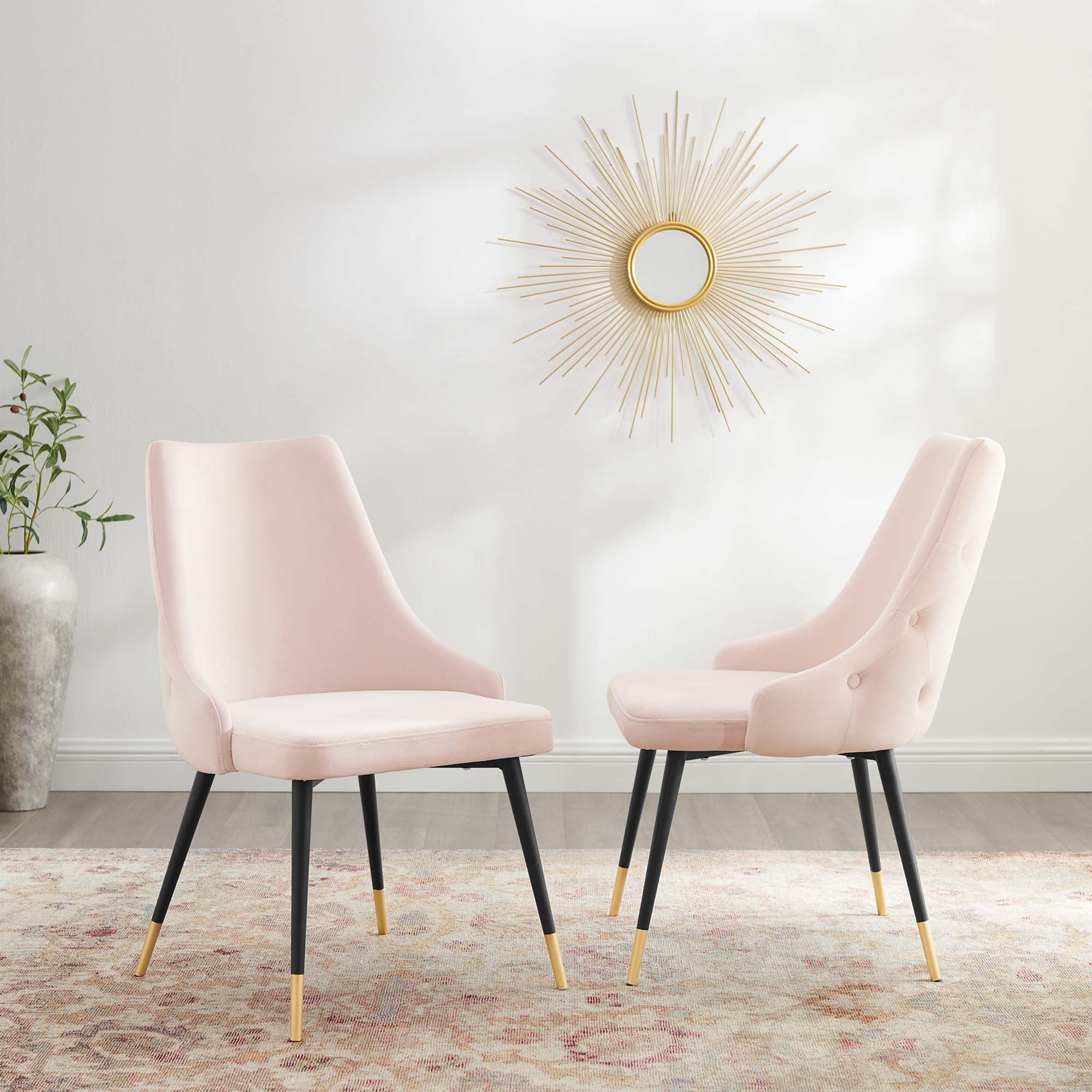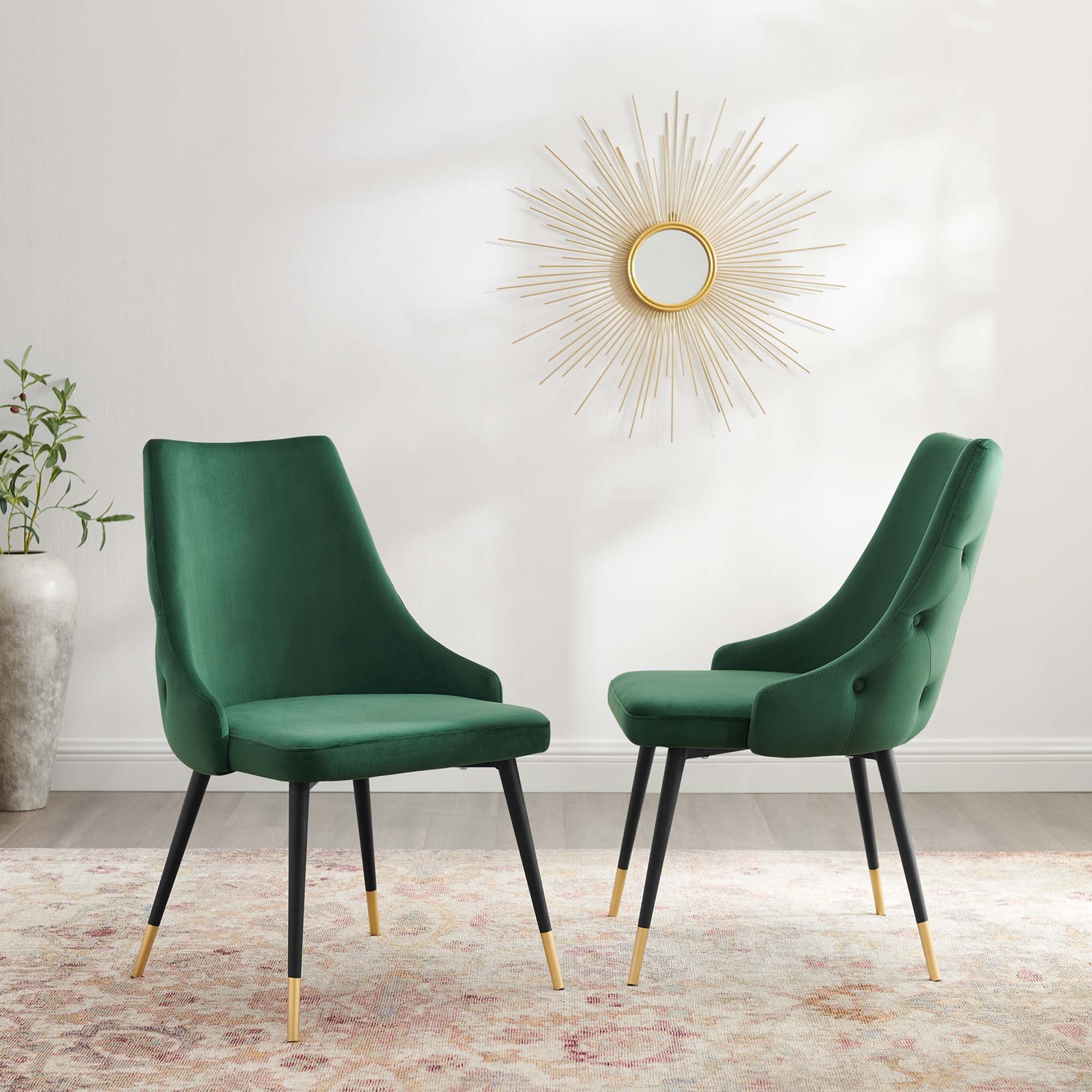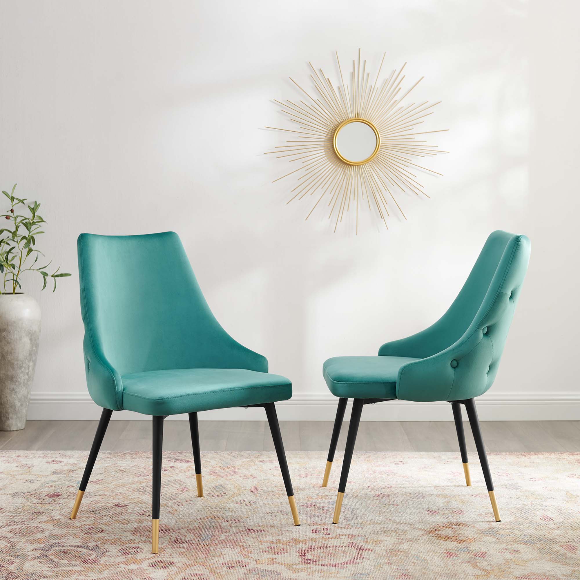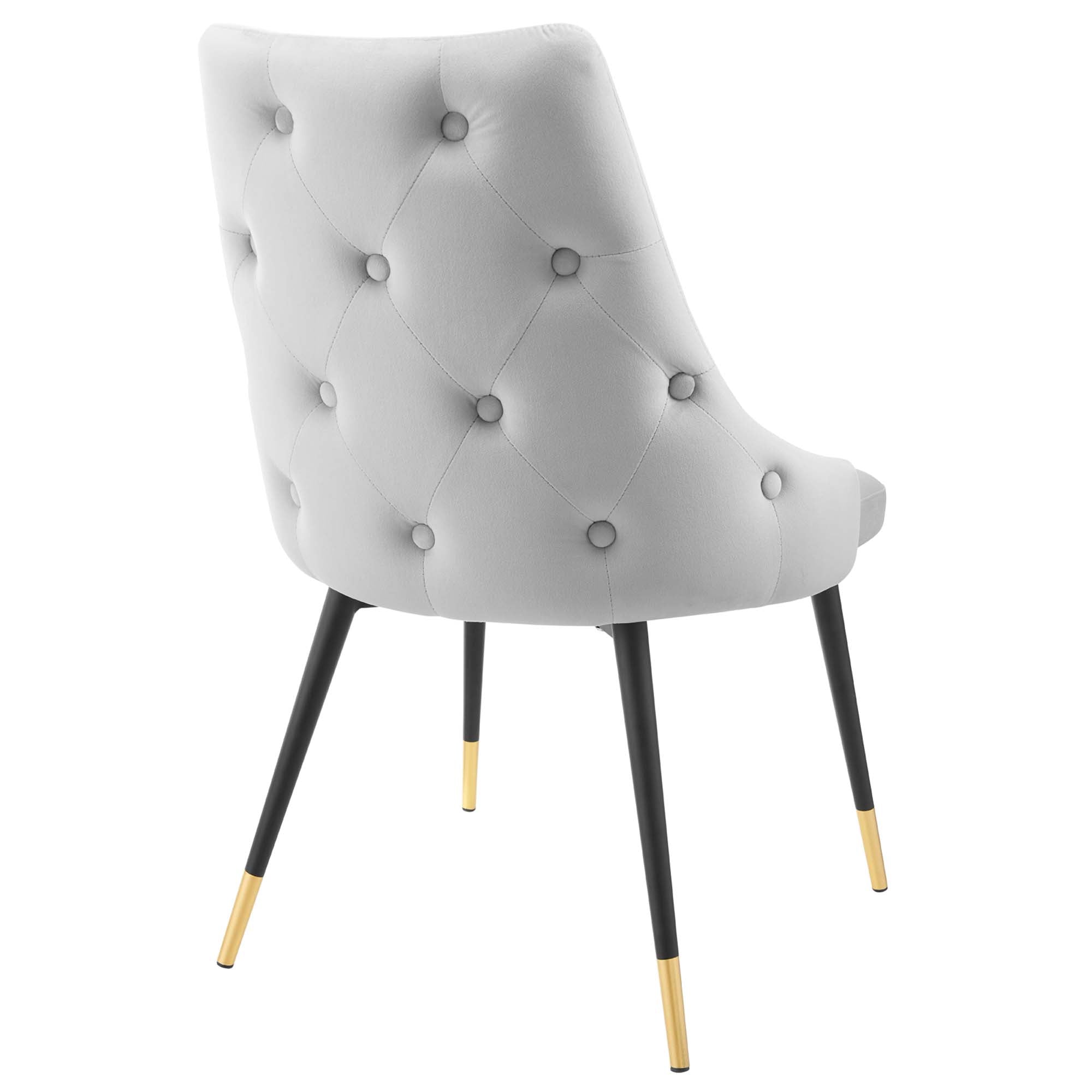 Revitalize dining decor or your living space with the Adorn Tufted Performance Velvet Dining Side Chair. Classic button tufting along the chair's exterior and graceful sweeping lines blend seamlessly into the lush comfort of this dining chair. With soft stain-resistant performance velvet upholstery, this accent chair offers a comfortable place to rest with dense foam padding. Sitting on four black tapered legs with gold foot sleeves, Adorn's versatile vintage modern style and glam deco charm makes this side chair ideally suited for a variety of rooms. Place this velvet chair around the dining table, or use it as an accent chair in the living room, bedroom or entryway, or update your home office seating with use as a cute desk chair. This modern dining chair supports up to 300 lbs. and is complete with non-marking foot caps to protect your flooring. No assembly required.