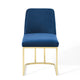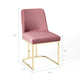 Striking lines and simple form blend to produce the Amplify Glam Deco Performance Velvet Upholstered Sled Base Dining Chair. A boldly flowing gold stainless steel sled base supports the premium seating experience produced by the soft and stain-resistant performance velvet polyester upholstery for a dining chair suitable for a variety of decor styles. Dense foam padding and gentle curves accent the glam deco elegance of the Amplify Dining Side Chair. Whether the Amplify Accent Chair is gracing your dining room, living room, lounge room, or office, visitors and guests will comment on this eye-catching addition. Chair Weight Capacity: 331 lbs. Assembly Required.