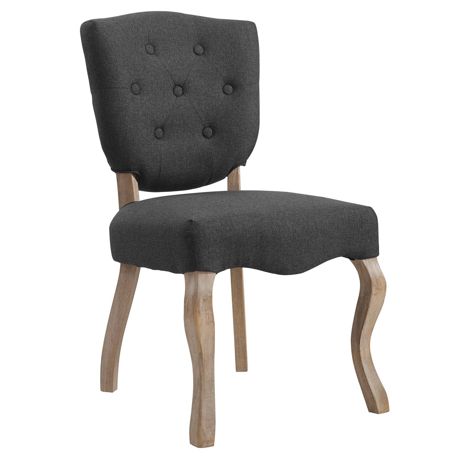 Usher forth a harmonious dining environment with the Array Vintage French Dining Side Chair. Four saber-shaped weathered wood legs develop a sculptured silhouette, while the shield back with button tufting displays hints of opulence. Complete with a generously padded seat, and soft polyester upholstery, Array comes with non-marking foot caps to preserve floor integrity, supports up to 331 pounds, and does not require assembly.