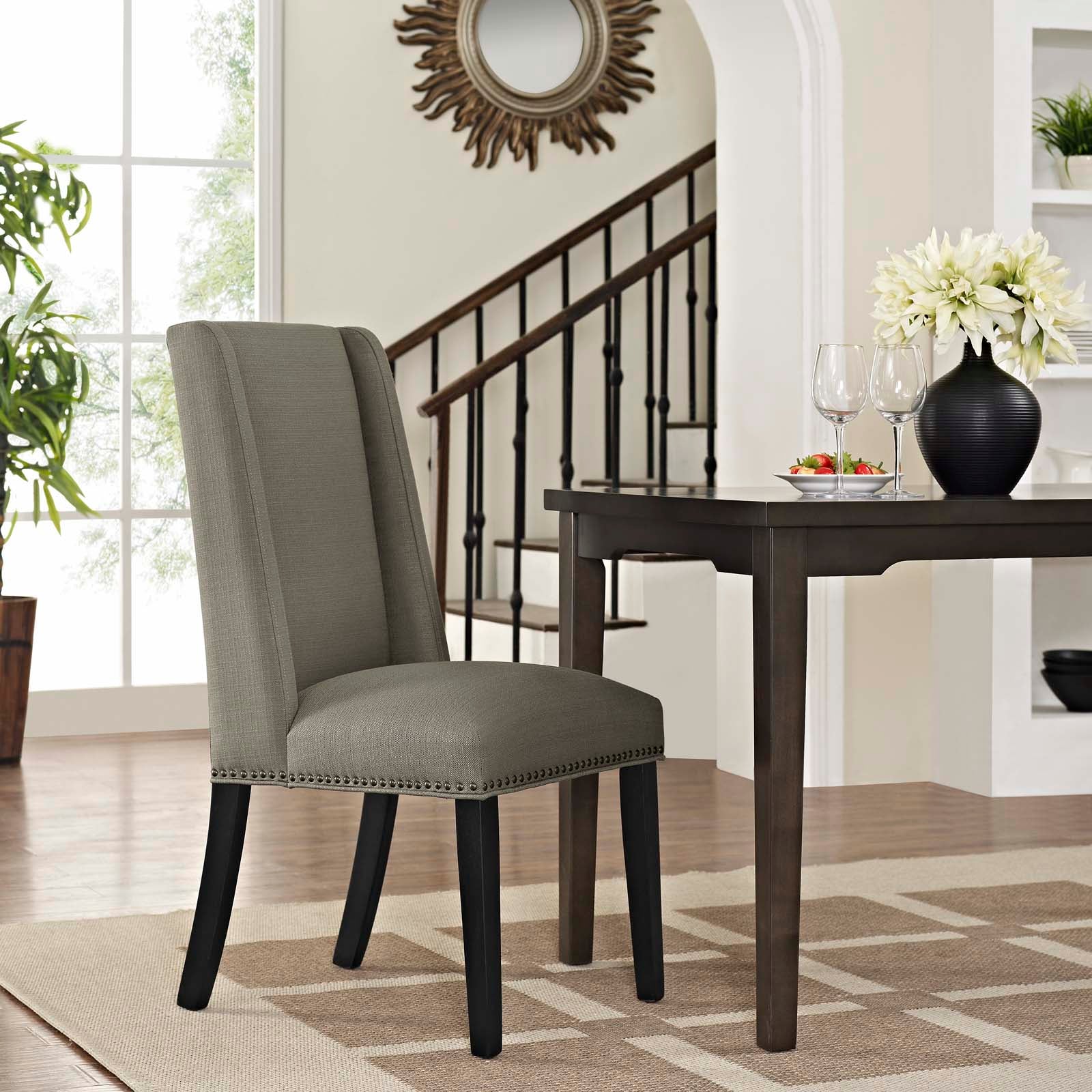 Explore the vast riches of a treasured heritage with the Baron Dining Chair. Designed to resonate elegance, this dining side chair features a charming back and polished nailhead trimmed seat with a dash of grace and noble appeal. Complete with dense foam padding, fine fabric upholstery, solid wood and MDF frame, and legs with non-marking foot glides, this updated Parsons chair is a stylish dining chair perfect for the dining room, living room, entryway, or home office. Weight Capacity: 500 lbs.