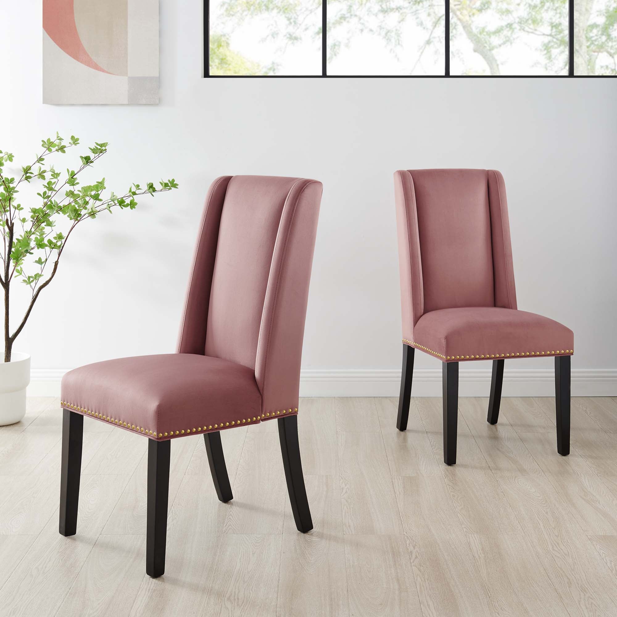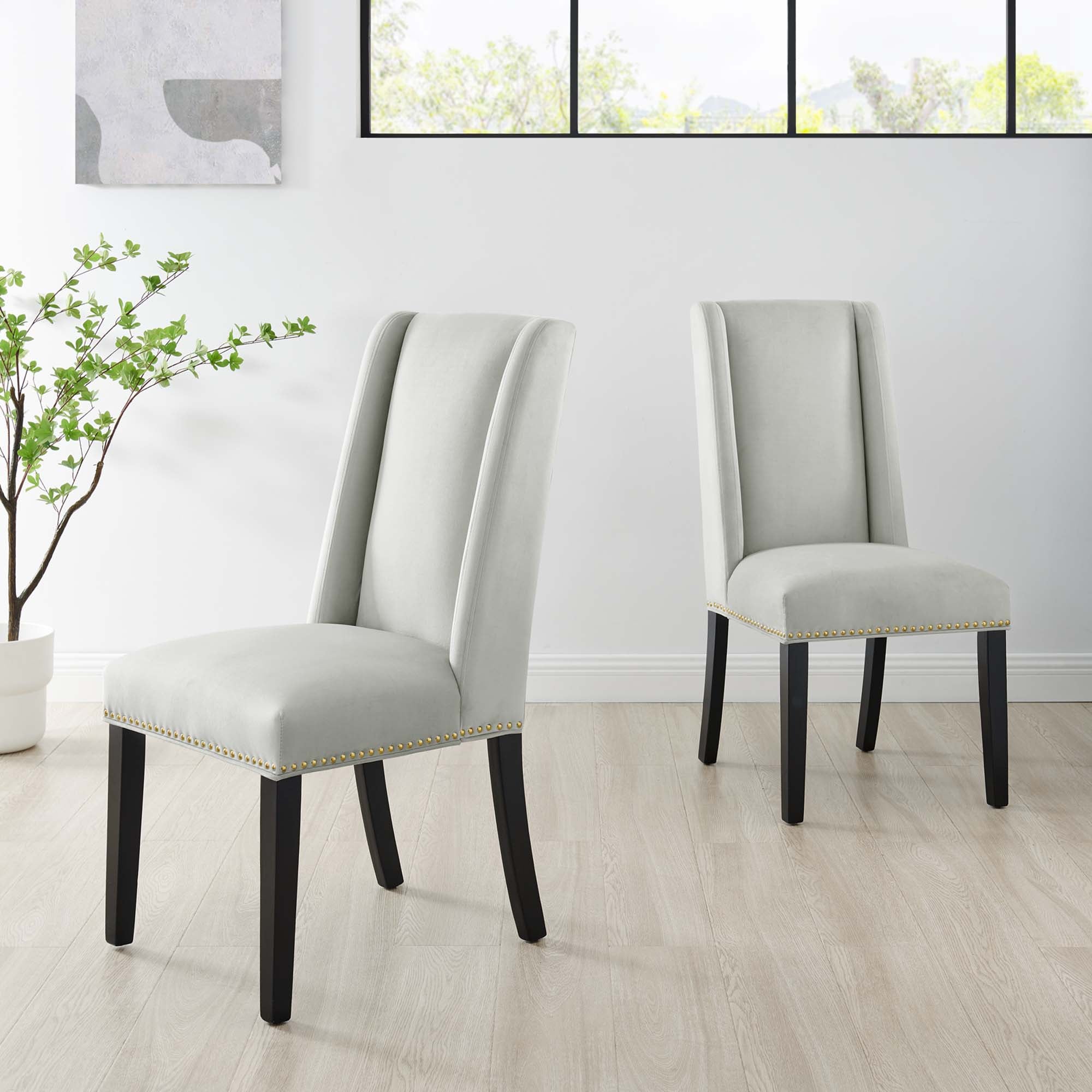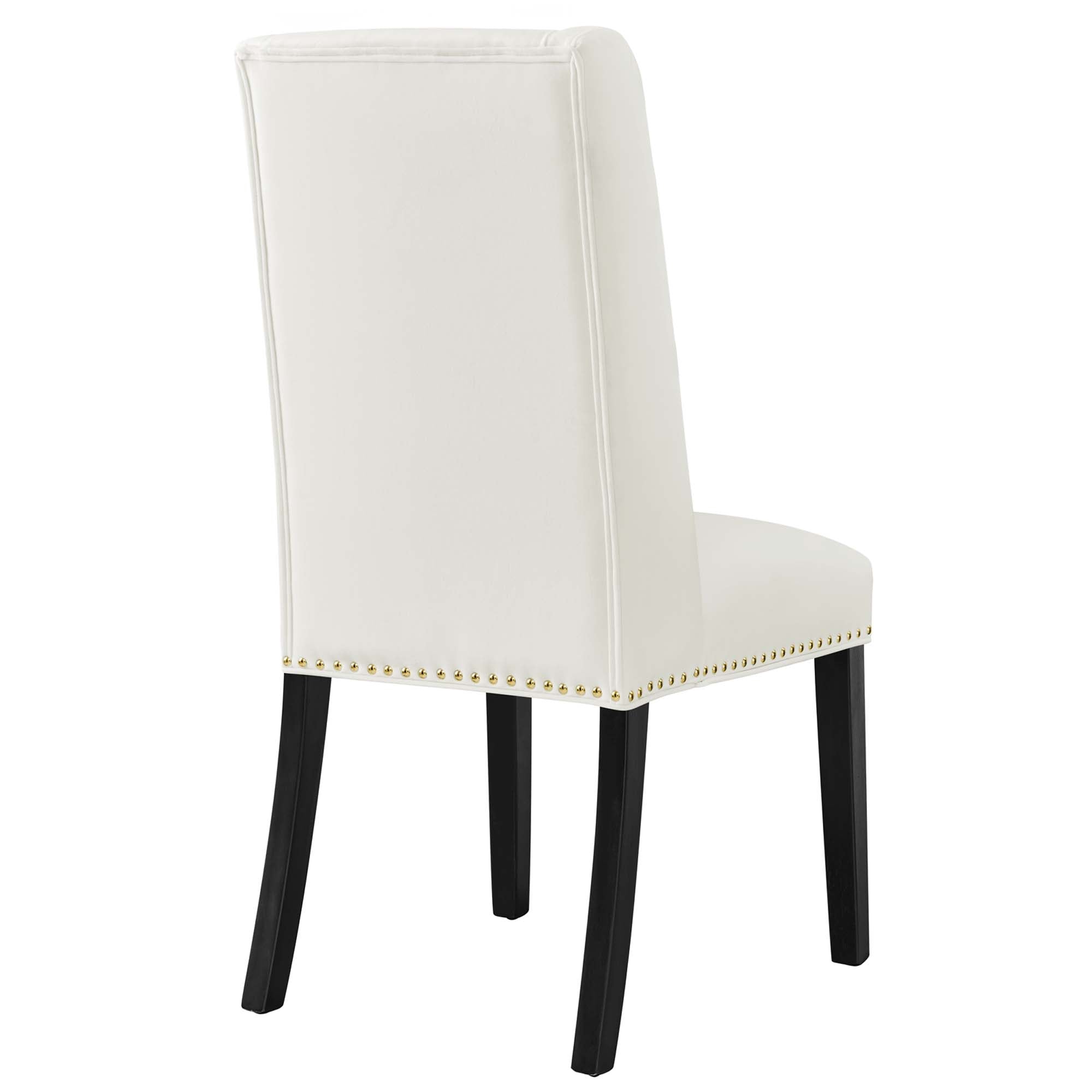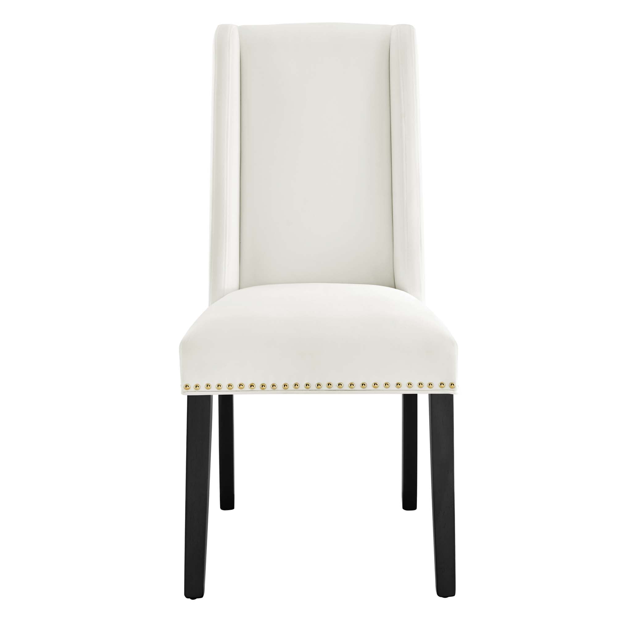 Explore the vast riches of a treasured heritage with the Baron Dining Chairs - Set of 2. Designed to resonate elegance, Barons features a charming back and polished nailhead trimmed seat with a dash of grace and noble appeal. Dense foam padding and a sinuous spring support system grant a premium seating experience. Complete with stain-resistant performance velvet upholstery, solid wood frame and legs with non-marking foot glides, Baron is a stylish dining chair set perfect for the modern home.