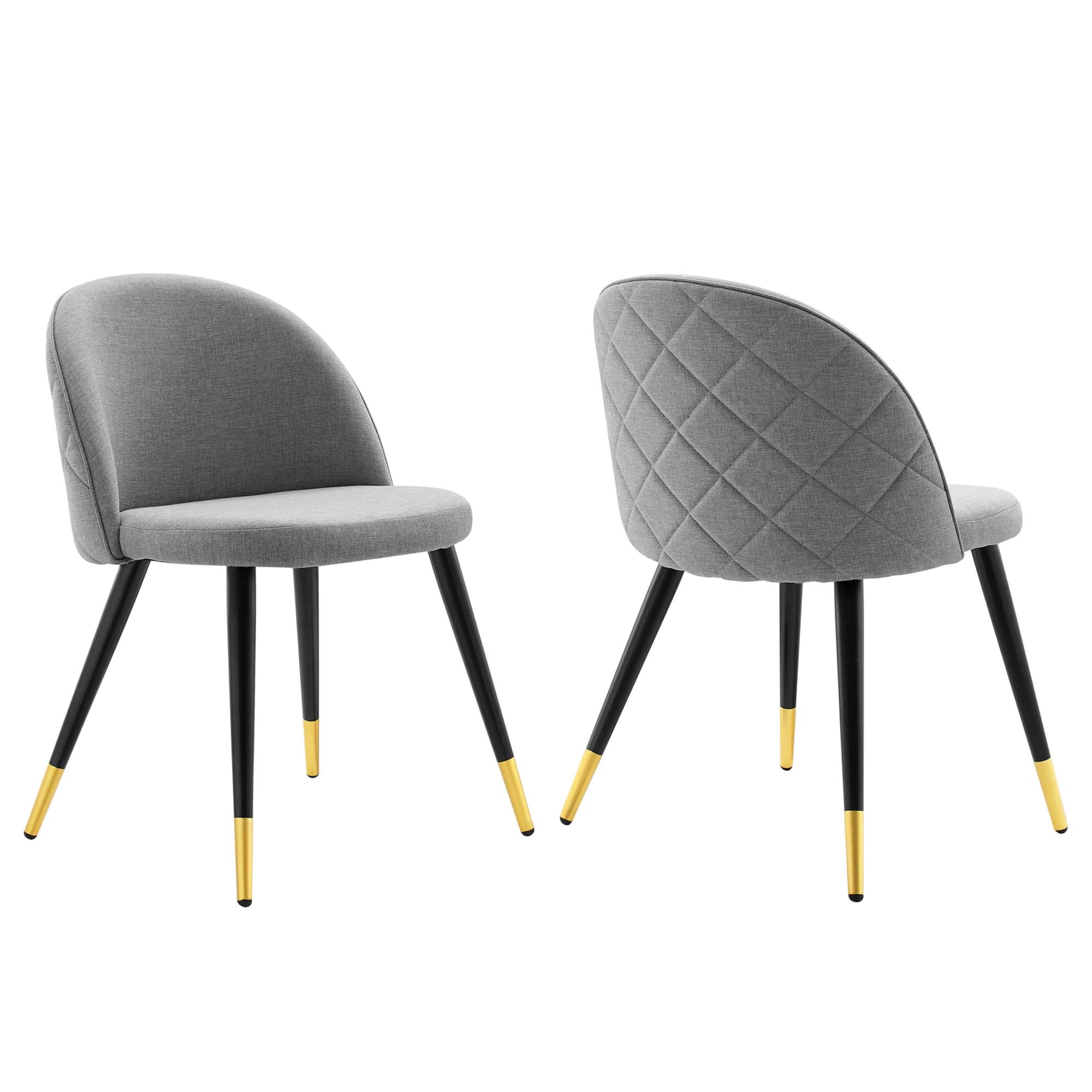 Inspire whimsical dining and stylish living with the Cordial Fabric Upholstered Dining Chairs - Set of 2. Featuring a rounded silhouette with French piping detail and a diamond lattice pattern along the back, these upholstered chairs are covered in soft polyester fabric and padded in dense foam to grant supportive comfort while dining or relaxing. A versatile addition to the dining room, kitchen, living room, home office, or entryway, these accent chairs rest atop black metal legs with gold accents and non-marking foot caps. Chair Weight Capacity: 300 lbs.