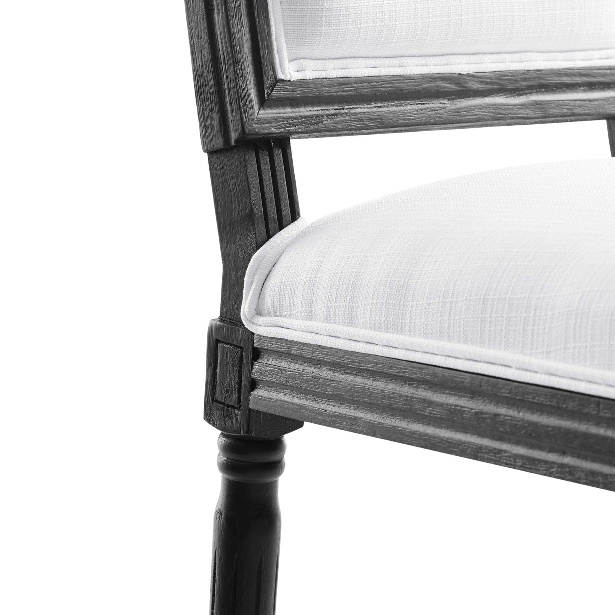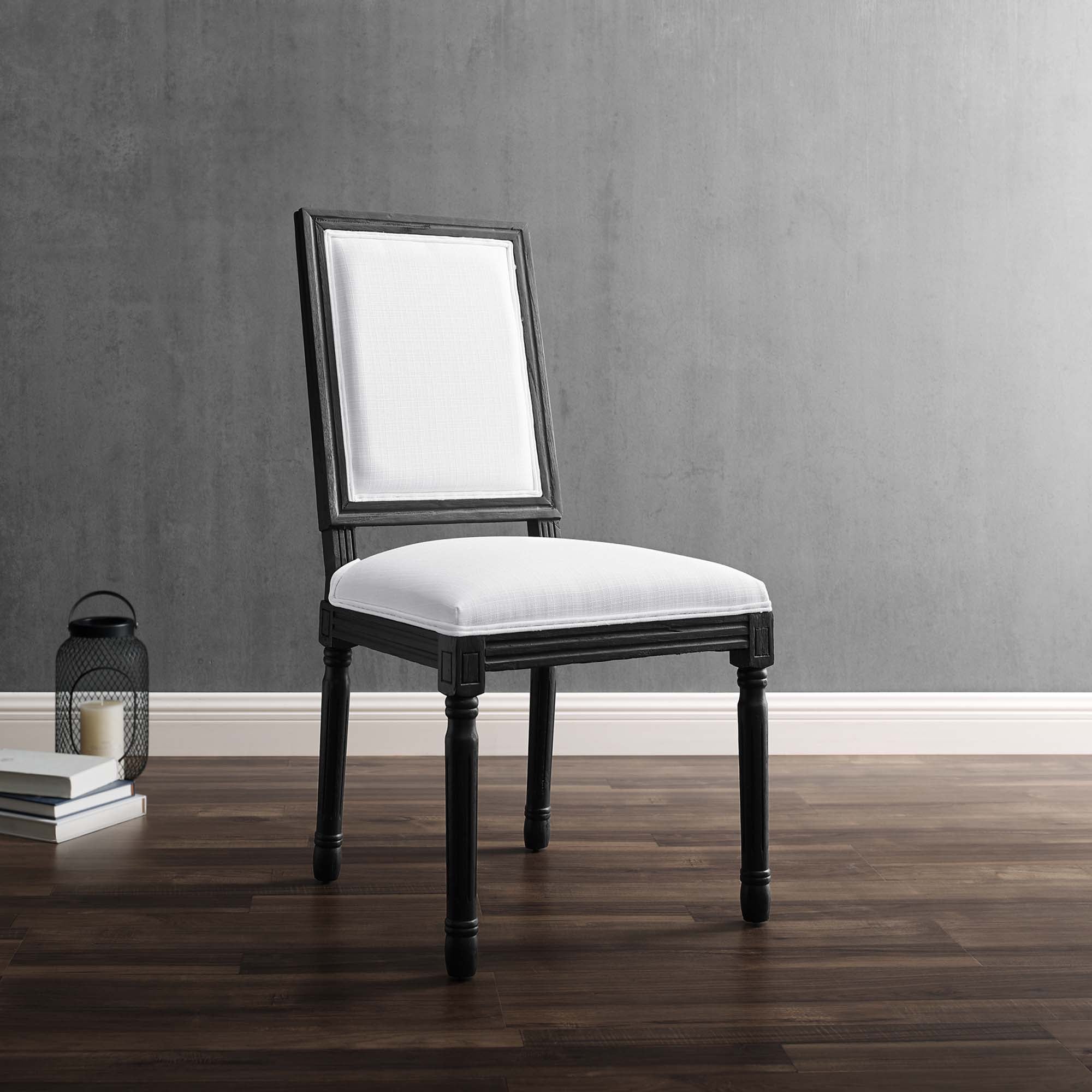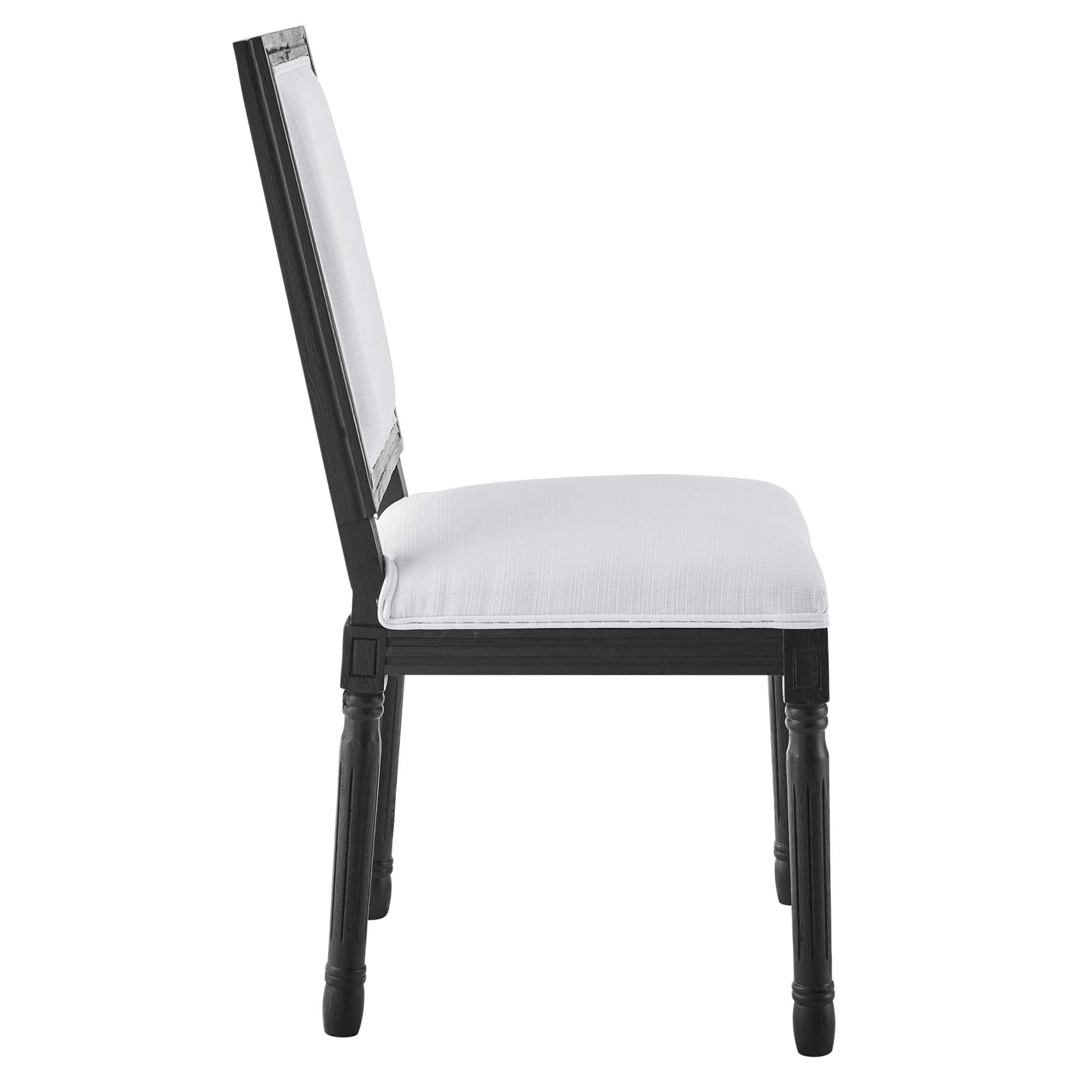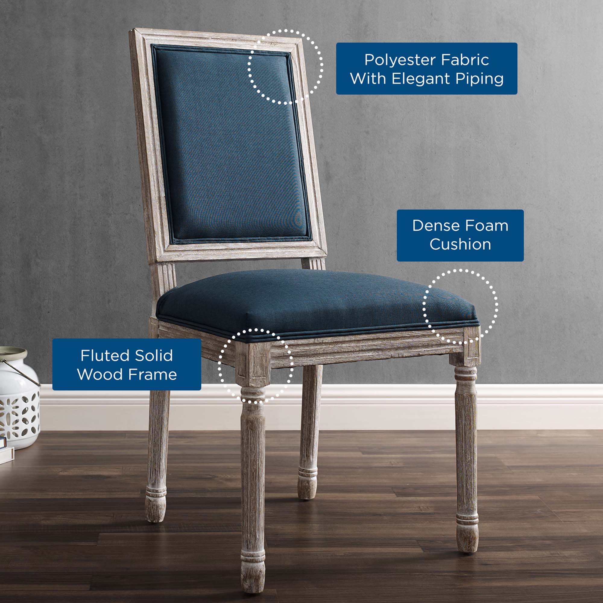 Revel in the whispered opulence of the Court Dining Side Chair. Featuring a fluted wood frame, dense foam upholstered fabric seat with elegant welting, this square back dining or accent chair harmoniously blends old world charm with modern intrigue. Designed with a vintage French look and an undeniable appeal, Court supports up to 331 pounds and comes with foot pads to preserve flooring. Comes fully assembled.