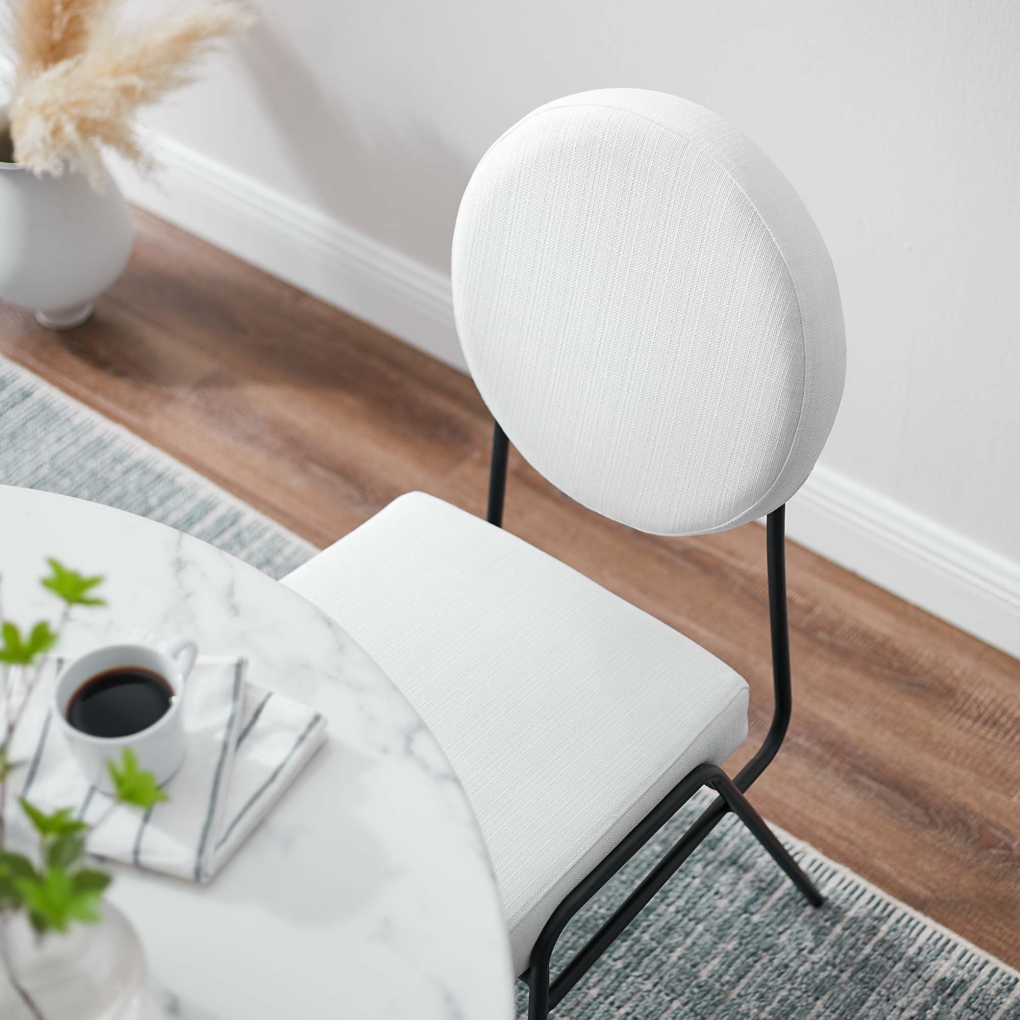 The blended aesthetics of mid-century modern style and the elegance of retro glamour are channeled to create the striking Craft Fabric Upholstered Dining Side Chair Set of Two. Featuring two densely padded foam cushions covered in soft, durable polyester fabric upholstery, these dining chairs are a luxurious seating experience with an open, breathable design. The Craft Accent Chairs sit on an eye-catching matte black stainless steel frame with flared rear legs and non marking foot caps elevating your dining room, lounge room, and office decor. Chair Weight Capacity: 330 lbs. Come fully assembled.