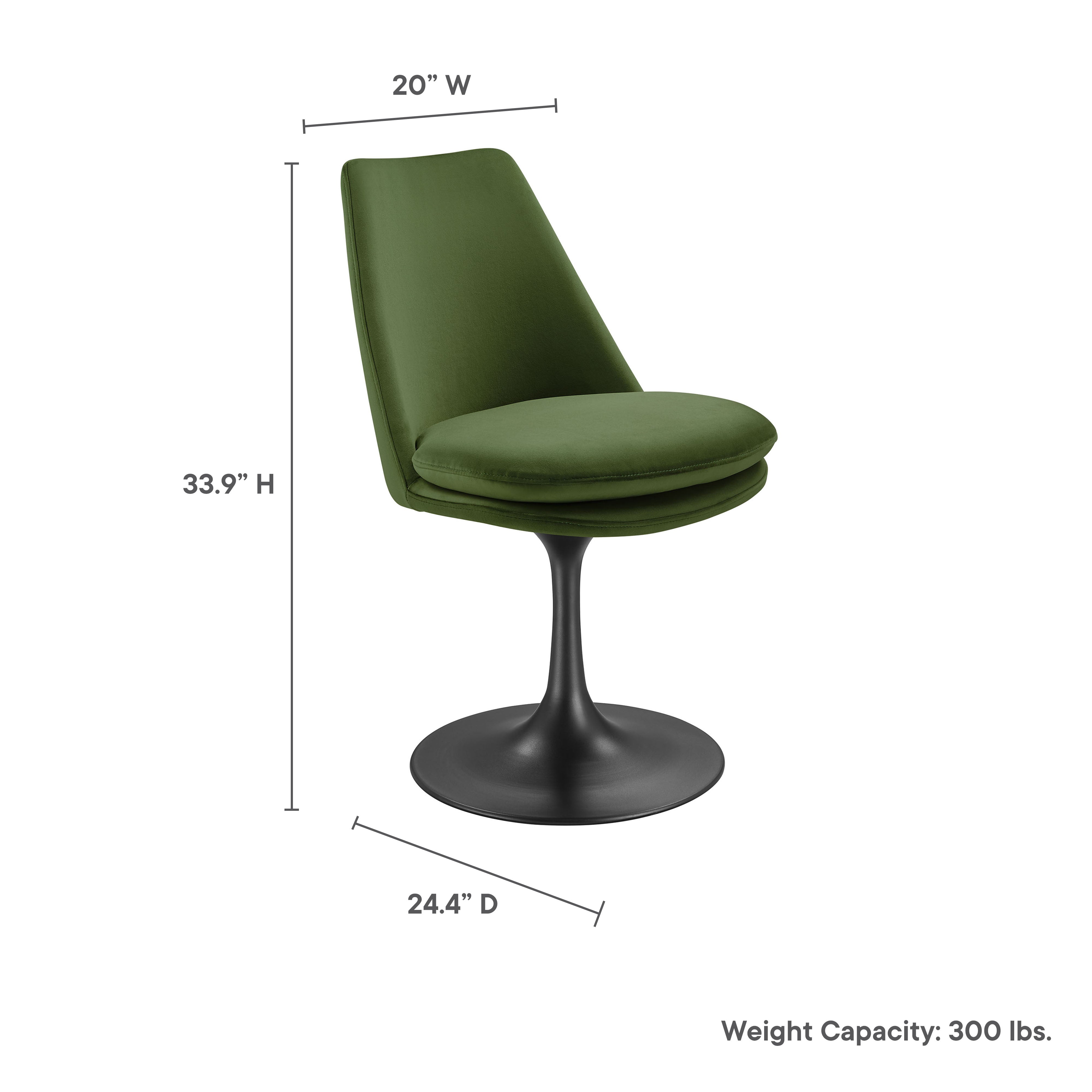 Embrace the day-to-day with the Lippa Vegan Leather Swivel Dining Room Side Chair. Upholstered in smooth, vegan leather, this armless chair combines style and comfort and is perfect for everyday use. Resting on a tapered, metal pedestal base, the Lippa faux leather side chair not only exudes modern elegance but also features a 360º swivel capability and a slightly reclined back, making it perfect for both casual dining and relaxed conversation. The fixed seat cushion complements the chic design of the vegan leather dining chair, while a plastic rubber ring around the base protects floors from scratches. Not only an upholstered swivel dining chair, it also functions beautifully as an armless faux leather office chair, or even a unique vegan leather vanity chair. Whether complementing one of the Lippa dining room tables or your existing setup, this faux leather swivel dining chair with pedestal base naturally freshens up your space. Assembly Required. Swivel Side Chair Weight Capacity: 300 lbs.