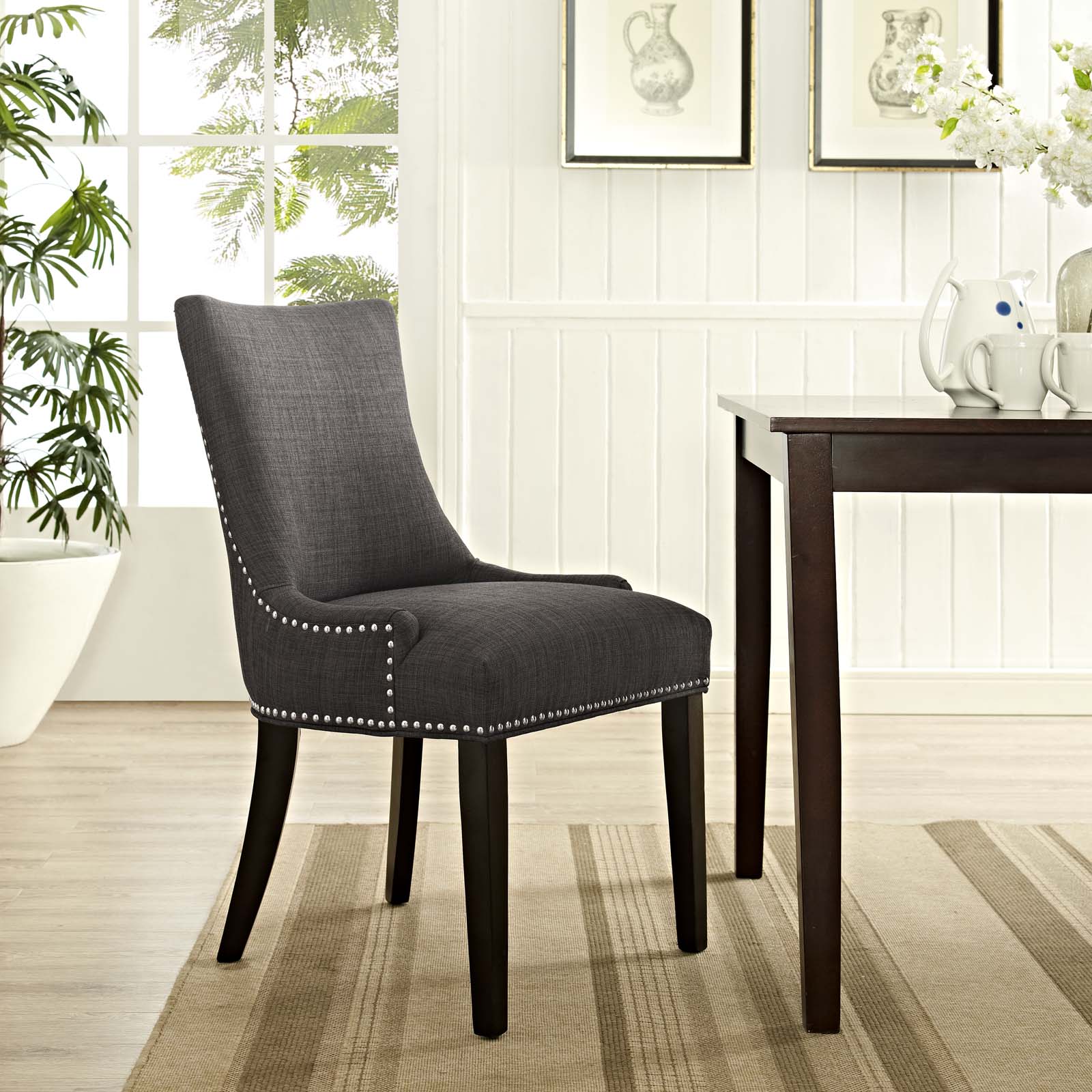 Inspire your décor with the Marquis Dining Side Chair. Marquis is fashioned with a chic hourglass shaped back, studded nailhead trim, non-marking foot caps, tapered wood legs, and a regal seat generously padded in foam and upholstered in polyester fabric. Marquis works well in both modern and traditional dining rooms as well as in the living room, entryway, or home office.