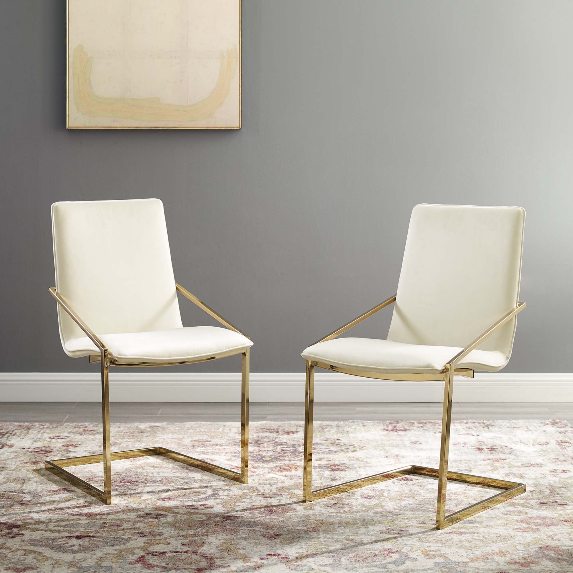 Freely flowing angles form the understated elegance of the Pitch Performance Velvet Upholstered Dining Armchair. The Pitch Dining Chair has a geometric gold stainless steel frame with non-marking foot caps, and a foam padded plywood seat. Covered in soft and stain-resistant performance velvet upholstery, the Pitch Accent Chair embraces open space for a notable modern chair that stands out amongst your dining room decor. Chair Weight Capacity: 330 lbs.