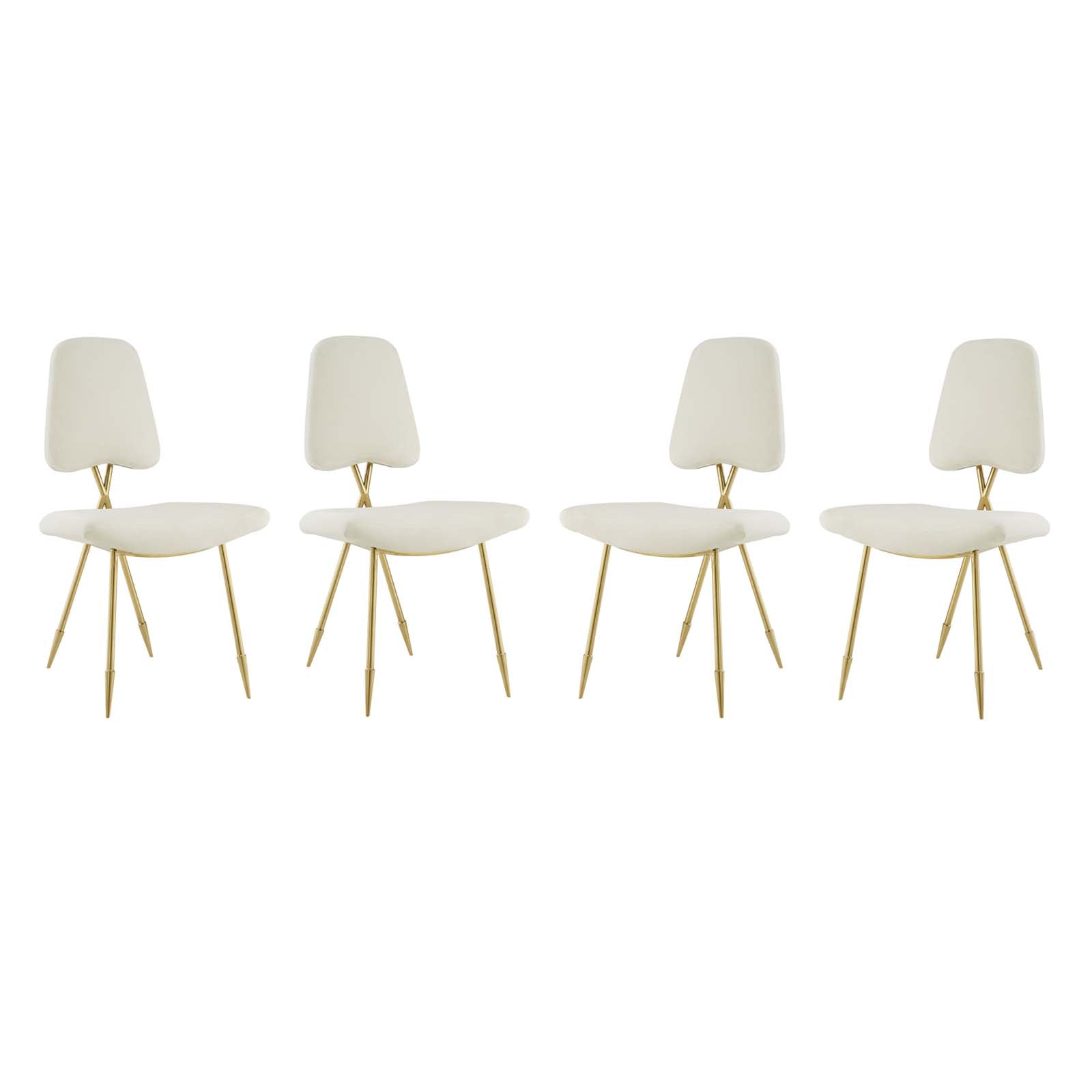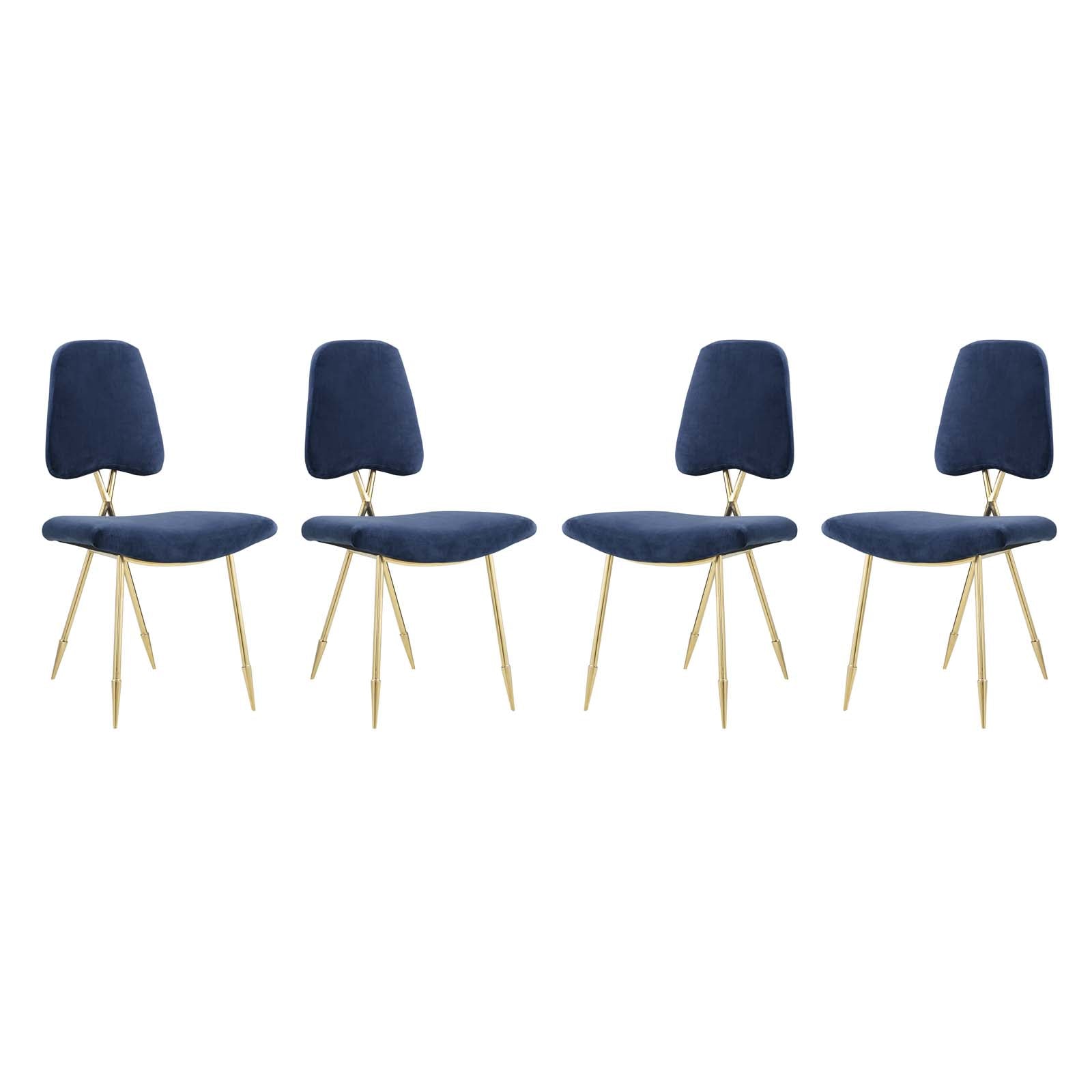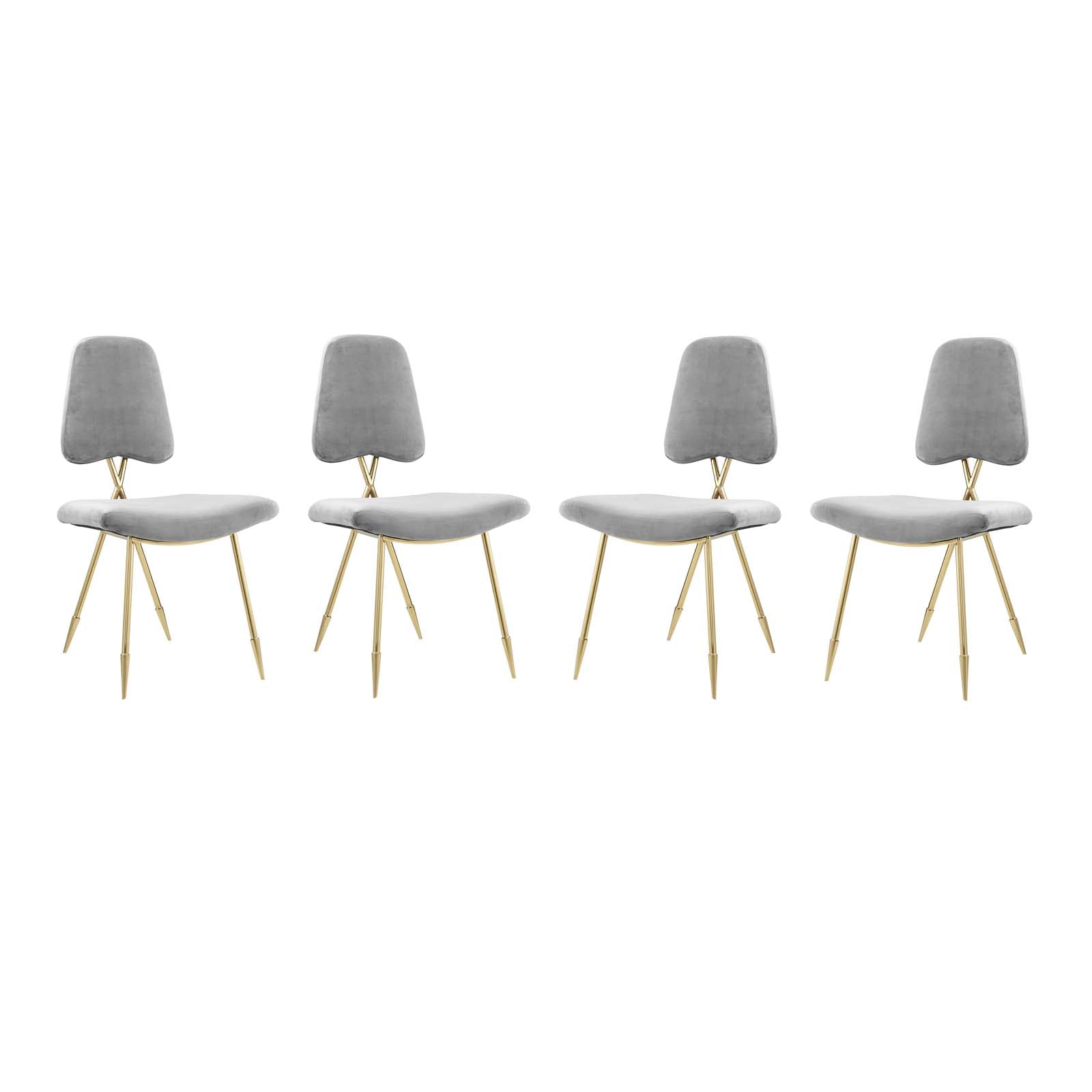 Survey your surroundings with confidence with the Ponder Dining Side Chair. Ponder’s padded high-density foam seat gently slopes upward providing embracing comfort while the tapered back provides ergonomic support. Finely upholstered in luxuriously soft velvet, and supported by a sturdy gold stainless steel frame with four angled mid-century toothpick legs, Ponder makes a striking statement. Accentuate your modern decor with a contemporary side chair that elevates any empty area of your home.