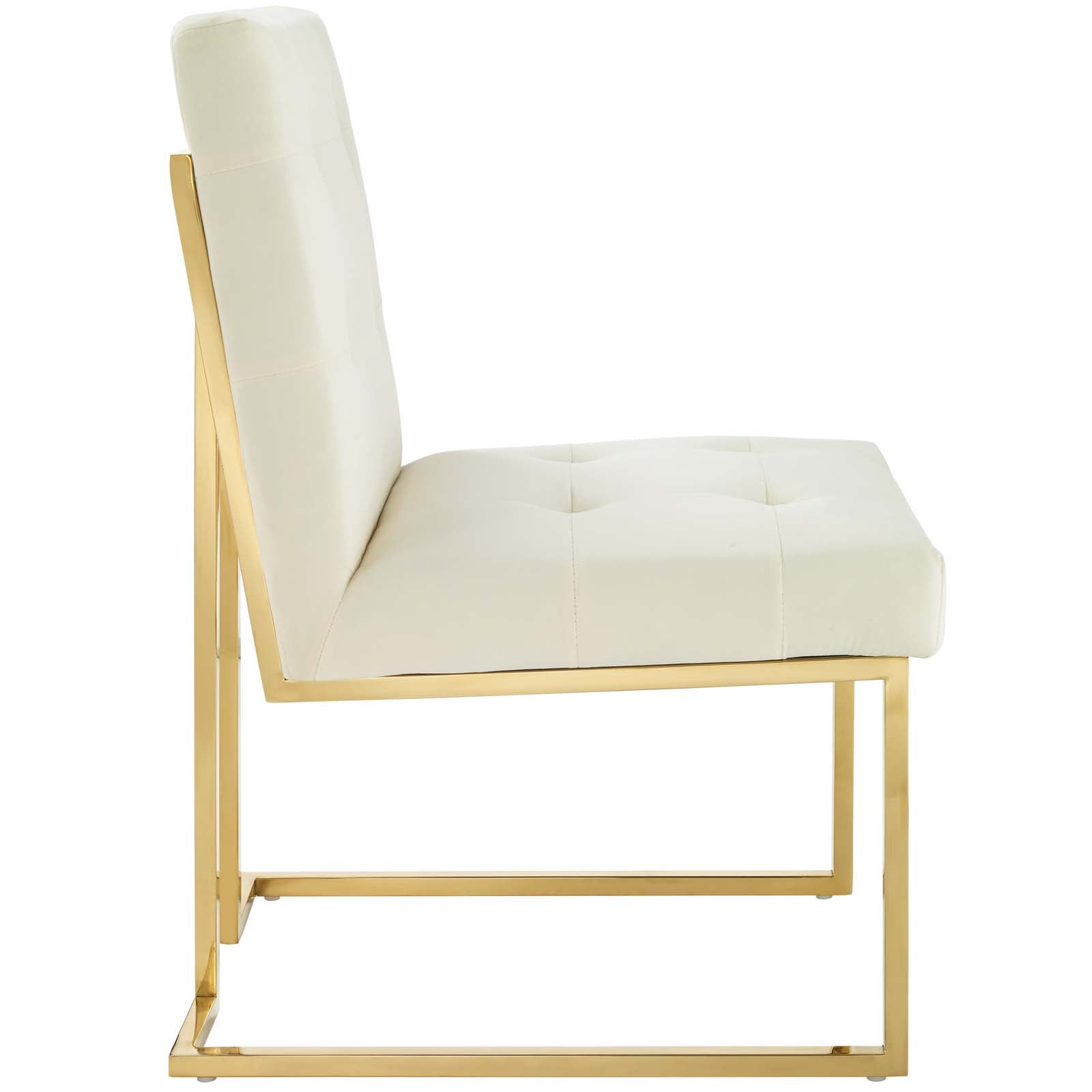 Maximize your dining room decor with Privy. A glam deco dining chair, Privy features soft and stain-resistant performance velvet polyester upholstery for a streamlined modern look. This modern dining chair rests atop a sleek gold stainless steel geometric base that will elevate your dining experience. No assembly required. Chair Weight Capacity: 331 lbs.