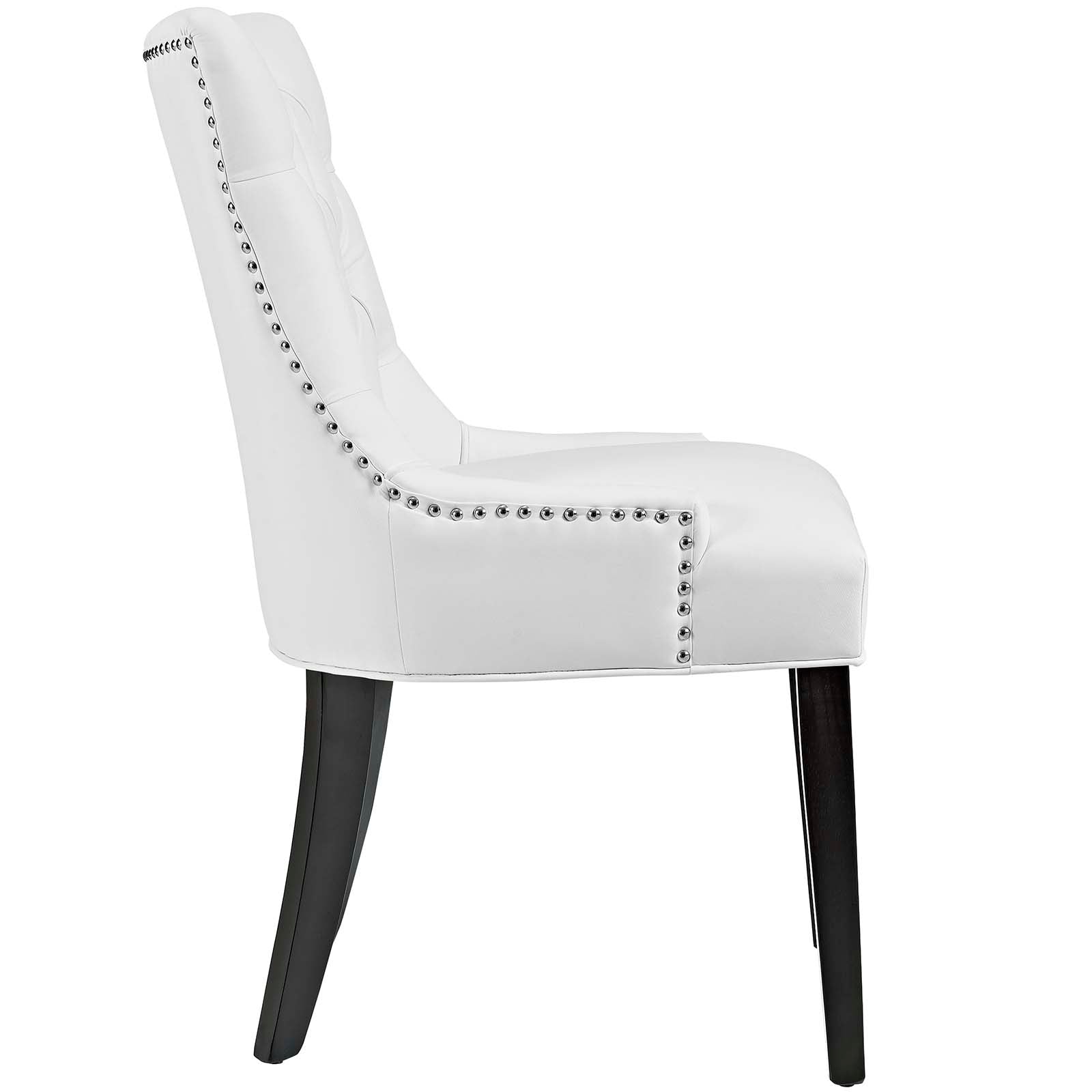 Transport your décor to a simpler time with the Regent Dining Side Chair. Fashioned with a chic and elegant look, Regent features finely tufted buttons, studded nailhead trim, and a regal seat generously padded in foam and upholstered in vinyl. Regent comes with non-marking foot caps, tapered wood legs, and works well in both modern and traditional dining rooms.