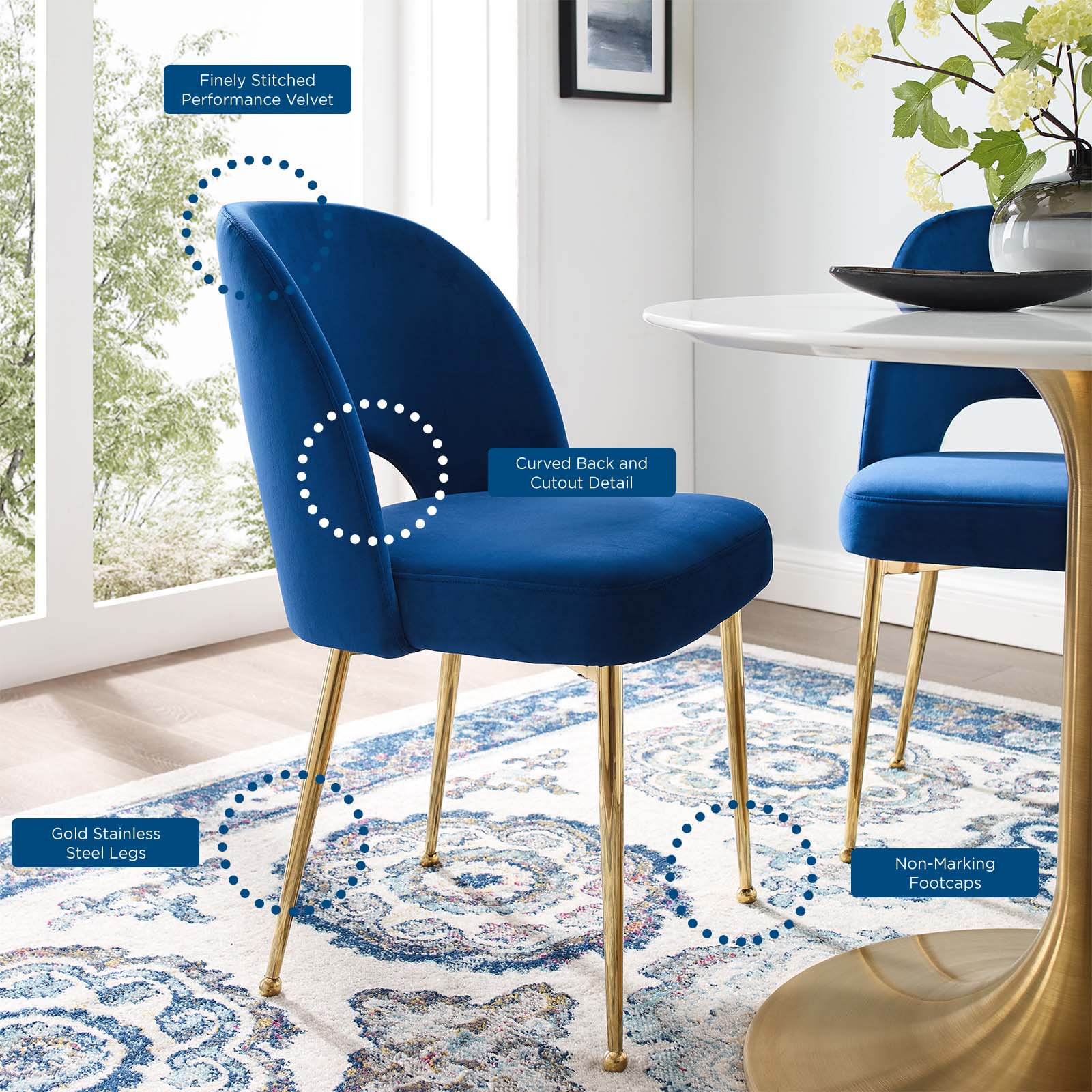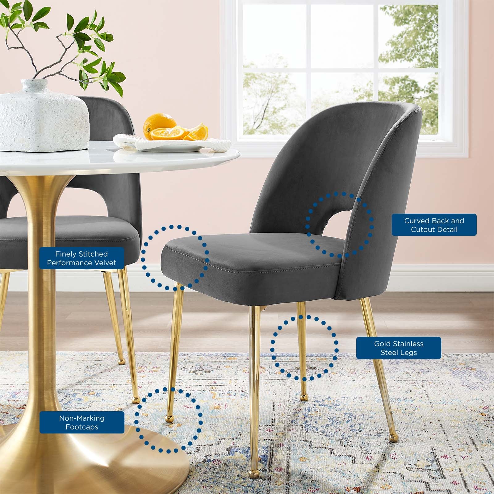 Revel in a stylish update on a classic design. Comprised of densely padded foam that supports the soft, stain-resistant performance velvet upholstery, Rouse offers a luxurious update to mid-century design. This glamorous dining chair is constructed from bentwood and sits atop four gold stainless steel splayed and tapered legs with ball feet. A comfortable velvet dining chair with open back design, experience the smooth curves and subtle embrace of this versatile dining room side chair. Chair Weight Capacity: 331 lbs.