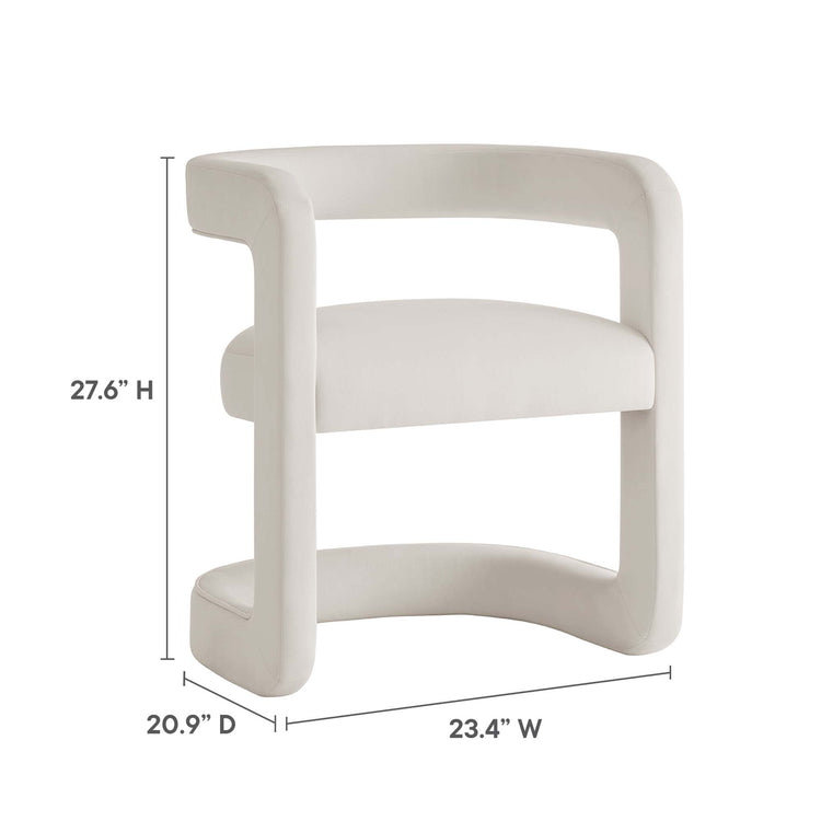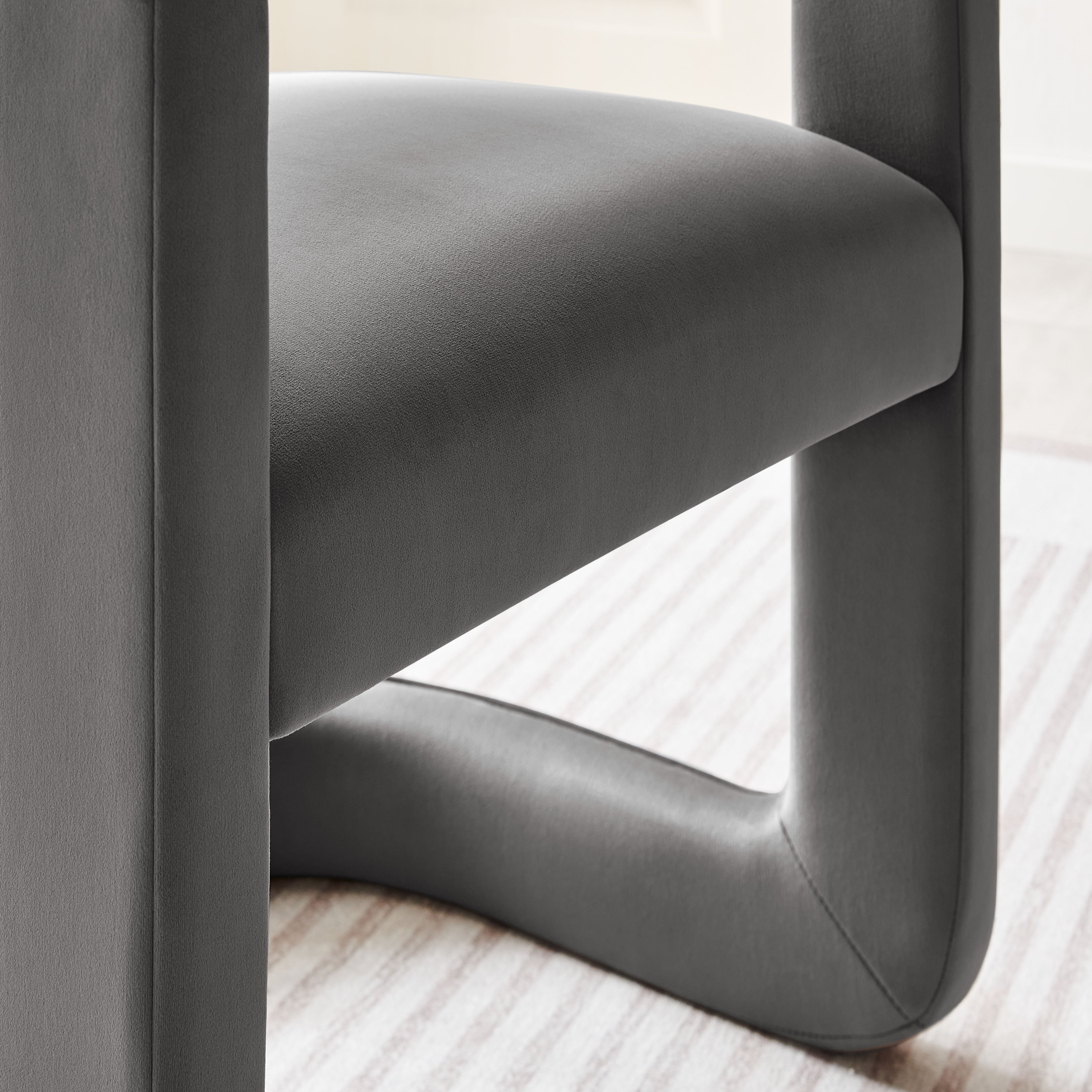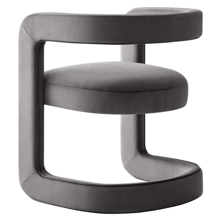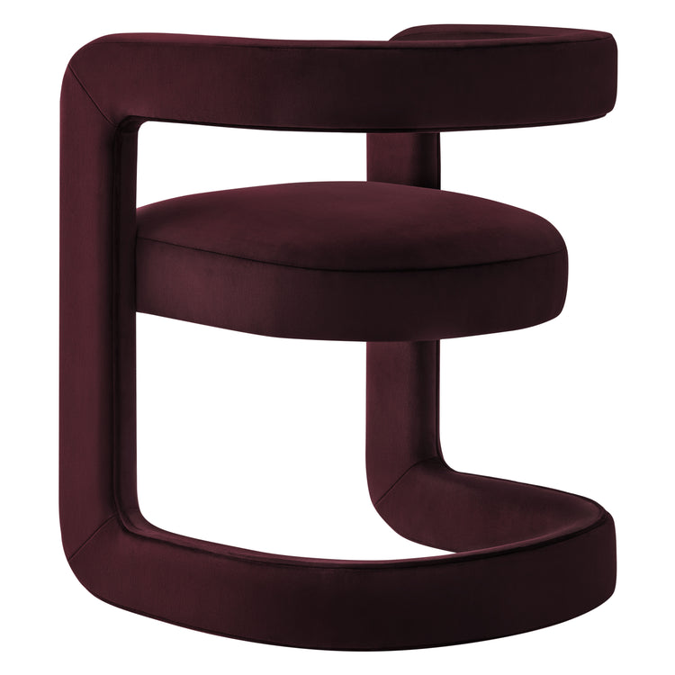 Lift the ambiance of your decor with the Winslow Performance Velvet Barrel Dining Chair. Its distinctive curved frame and supportive, open backrest create a unique silhouette that is visually pleasing and inviting. Crafted with a solid plywood foundation and completely draped in stain-resistant performance velvet upholstery, this kitchen and dining room chair offers a comforting, contoured seat, becoming a standout feature in any room. The fixed seat and cushion, padded in dense foam, add to the stylish allure, promising a sleek, uninterrupted line. Set upon non-marking plastic foot pins, the Winslow Velvet Dining Chair protects your flooring from scuffs and scratches. This barrel back dining chair is not just a seat but a beautiful addition to your home decor, perfect for adorning your dining room as a velvet dining chair, serving as a cozy reading nook chair, or adding an air of modern sophistication as a vanity chair. The Winslow Open Back Velvet Dining Chair invites you to sit down and stay awhile. Weight Capacity: 331 lbs.
