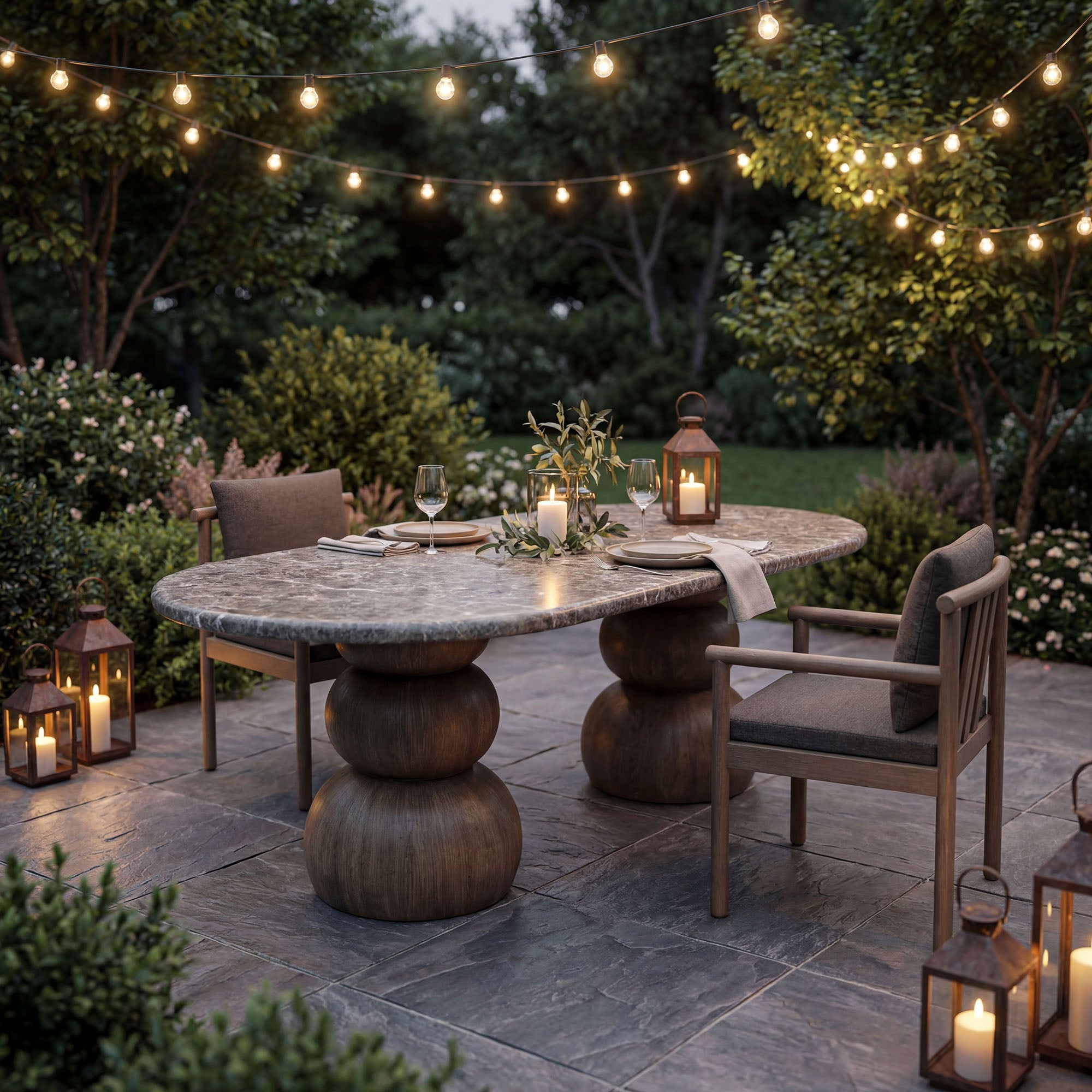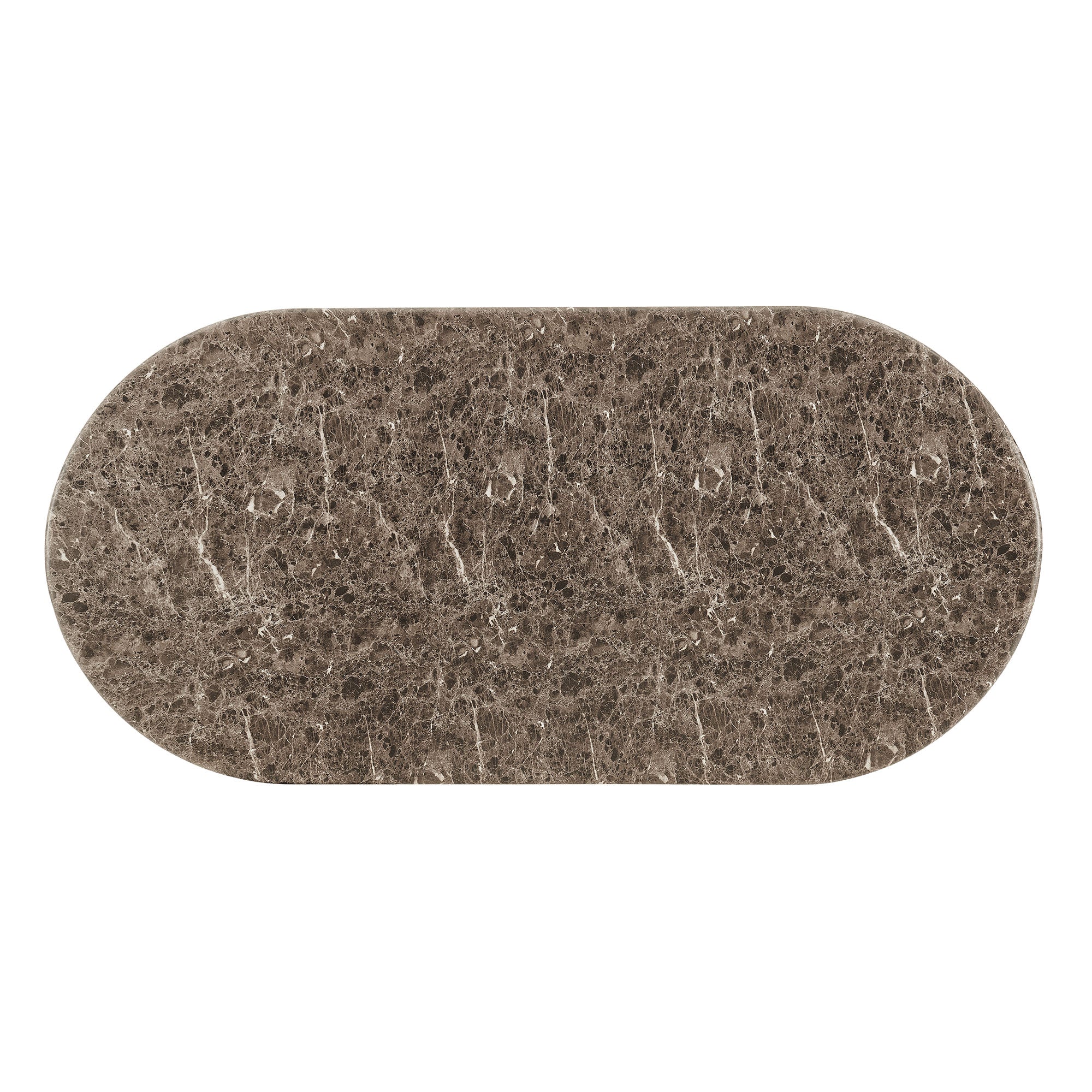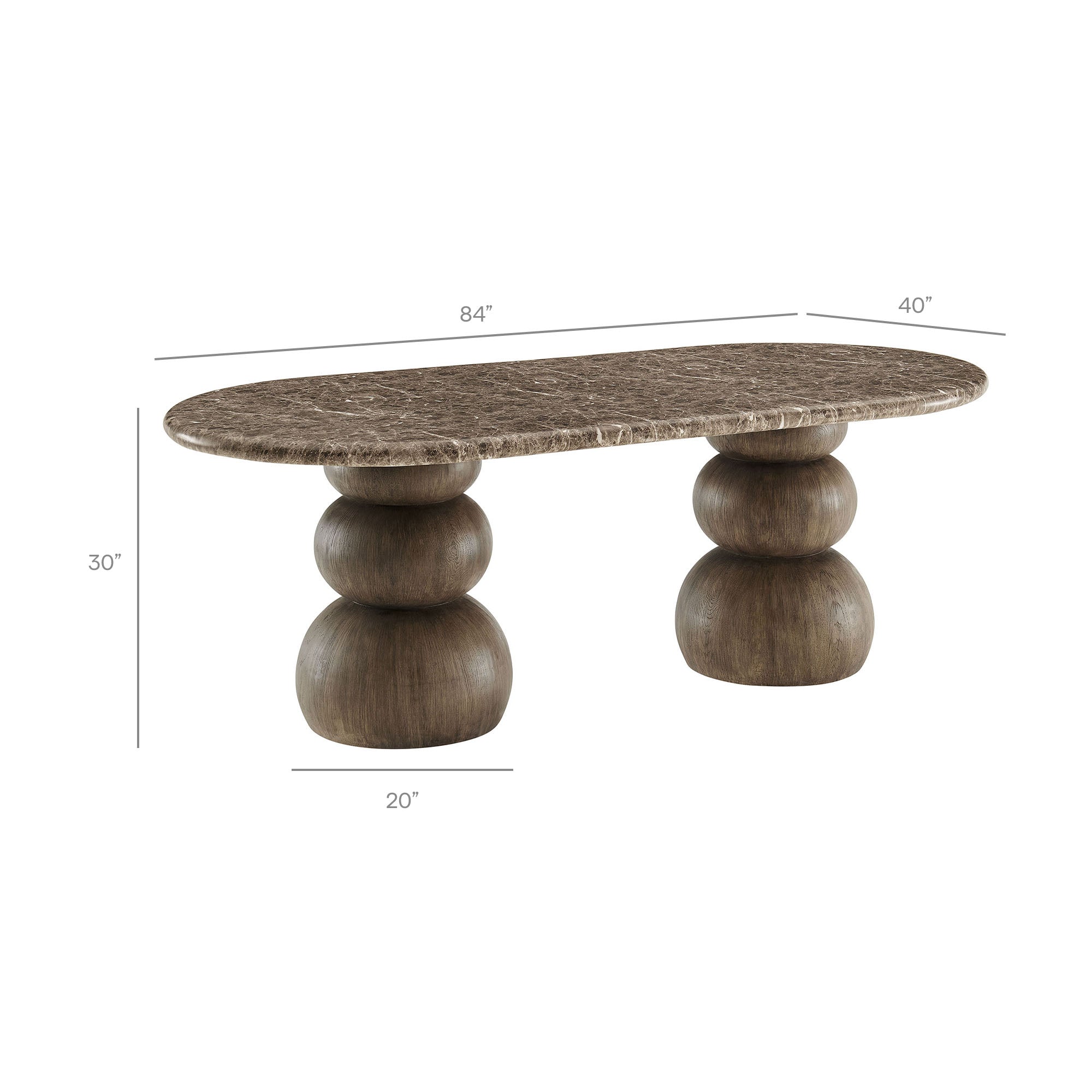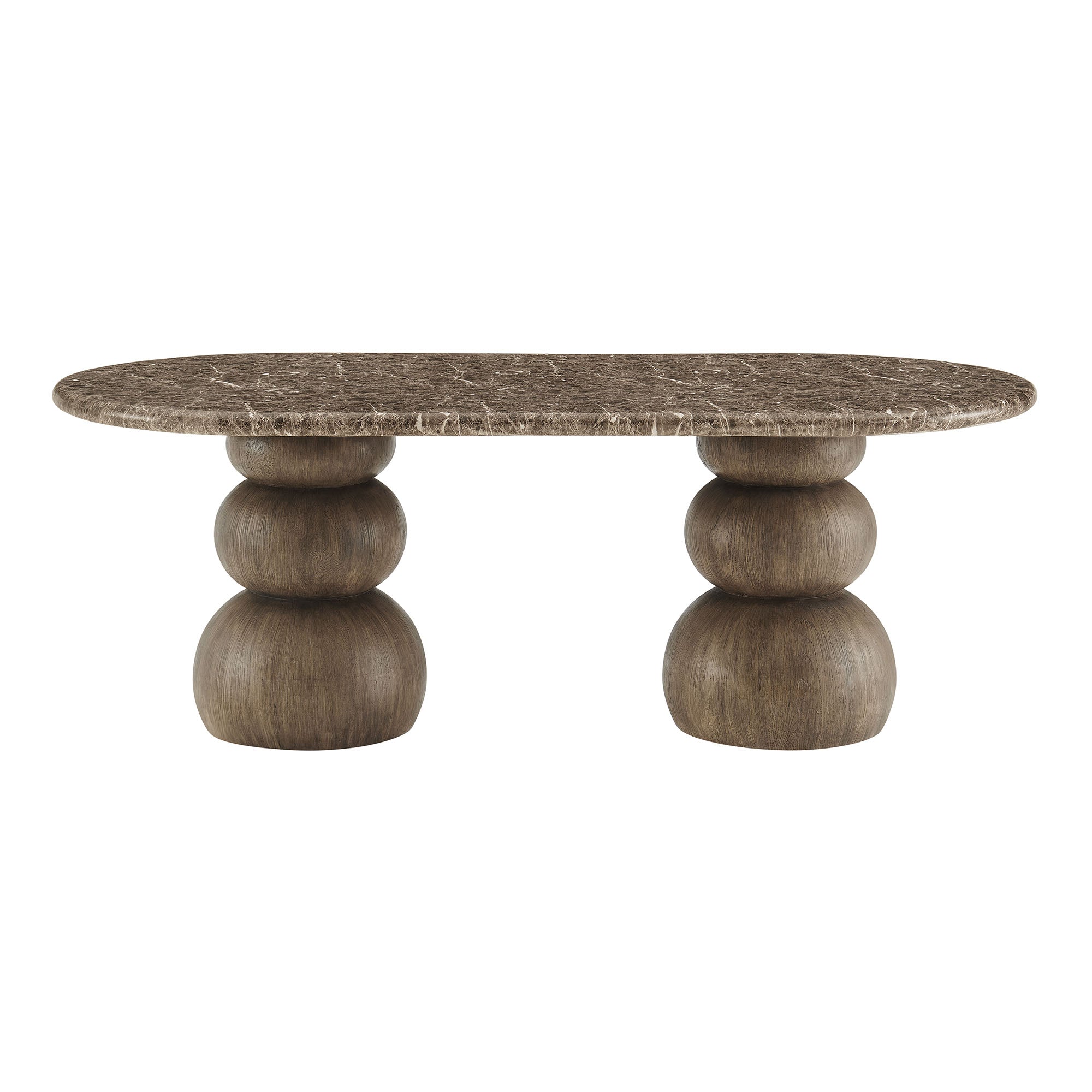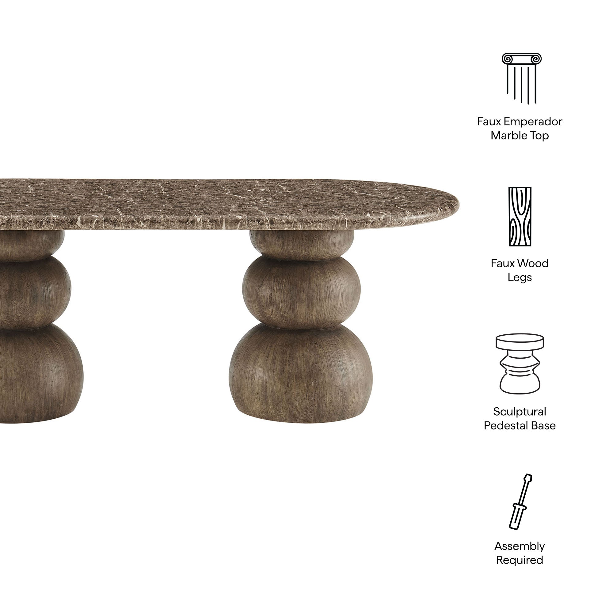 Bold yet balanced, the Pietra Oval Dining Table is a modern sculptural indoor/outdoor dining table designed to anchor both patios and interiors. Its faux emperador marble top features rich marble-look veining that brings depth and refinement to outdoor dining areas as well as contemporary dining rooms. Two stacked faux wood pedestal bases create a distinctive sculptural foundation, forming an architectural silhouette that feels grounded yet artful. Designed for versatility, this indoor outdoor oval dining table transitions effortlessly from a modern patio dining table to an architectural dining room table. Durable construction makes Pietra a weather-resistant dining table suitable for outdoor use, while its sculptural presence ensures it works just as beautifully indoors. Simple assembly required. Weight Capacity: 398 lbs.