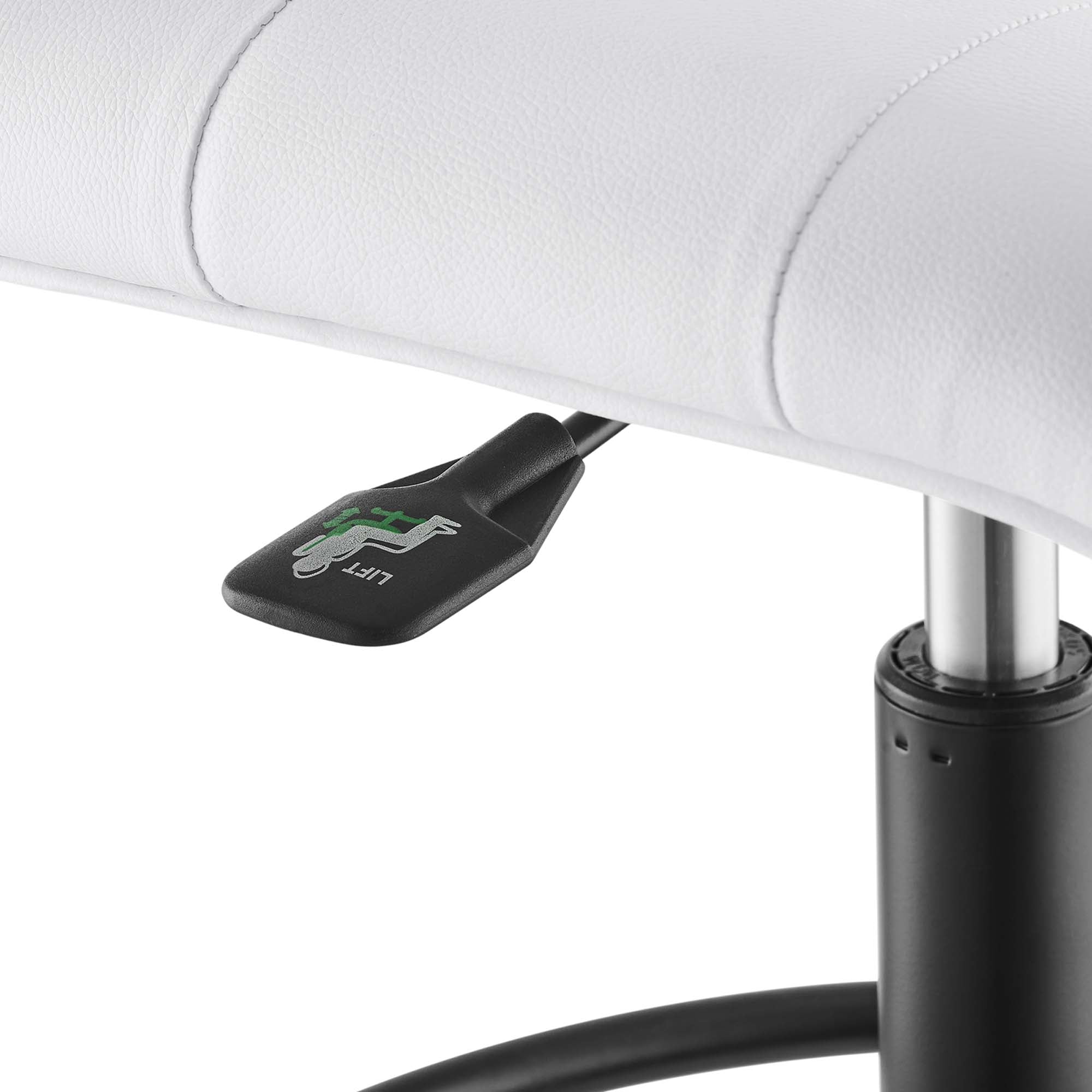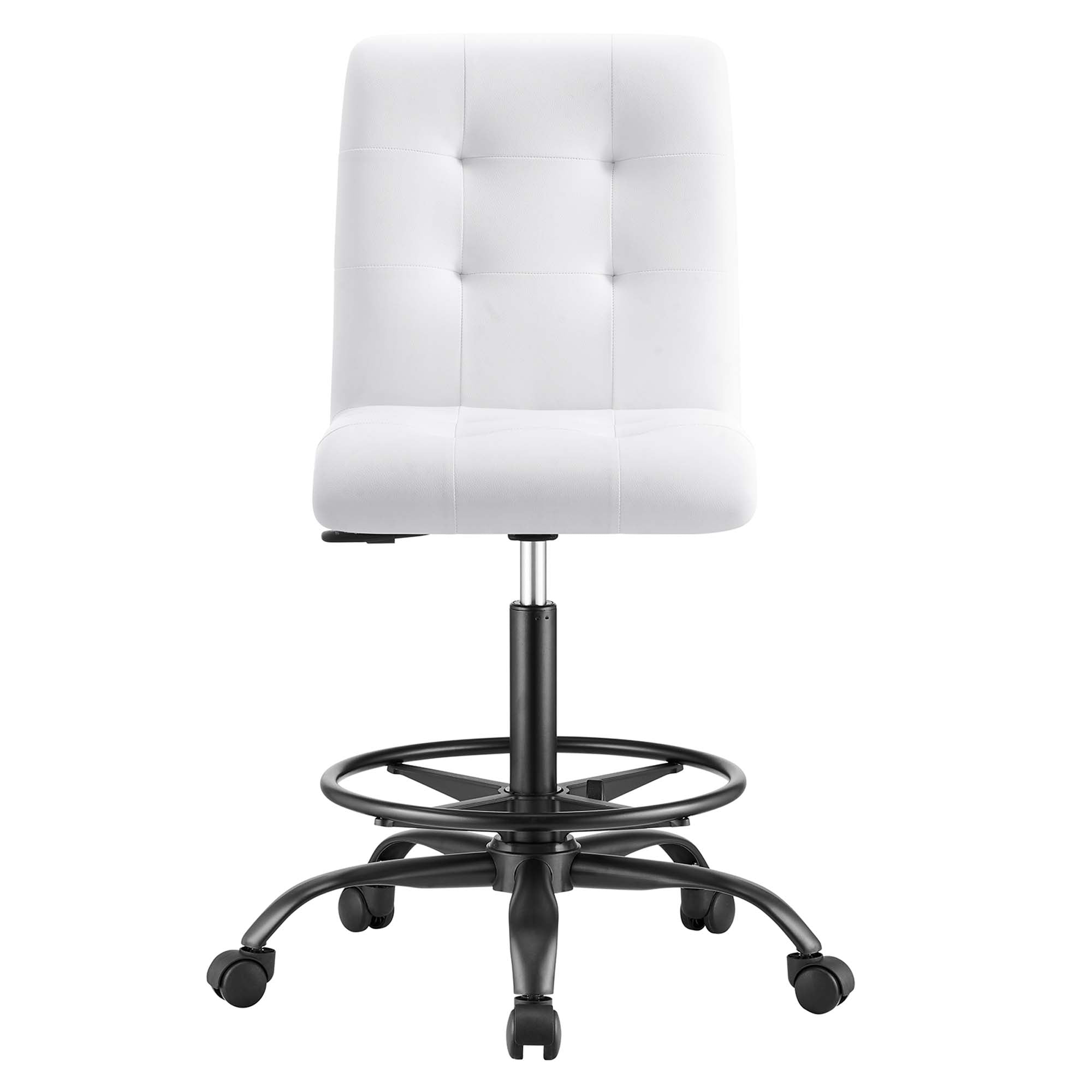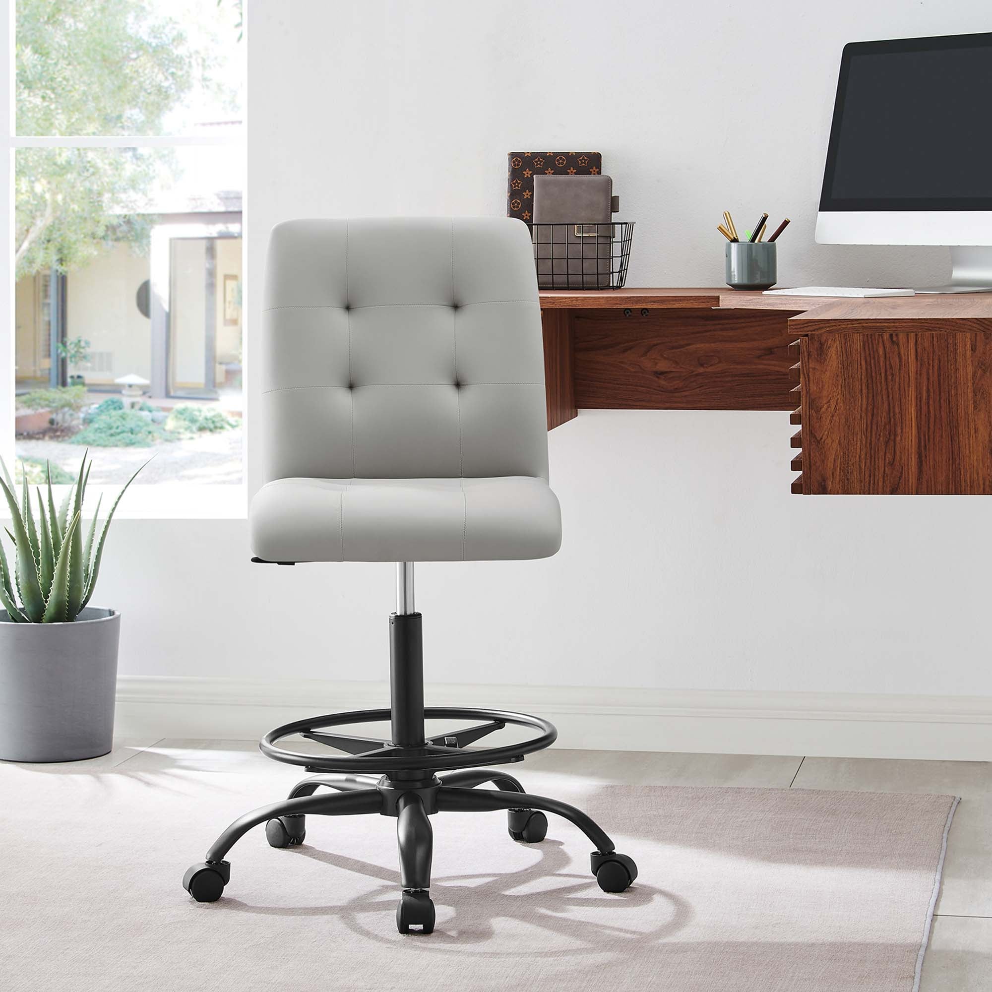 Etiquette presides over the properly styled Prim Armless Drafting Chair. Modern and luxurious, this swivel drafting stool features deep biscuit tufting, durable vegan leather upholstery, and elegant piped trim for added finesse. This vegan leather drafting chair is height adjustable, features a 360º swivel, and comes outfitted with a matte black base with five dual-wheel nylon casters. Perfect for standing desks, drafting tables, reception desks, and more, this drafting-height office chair is complete with dense foam padding for lasting comfort throughout the workday. Assembly required. Weight Capacity: 287 lbs.