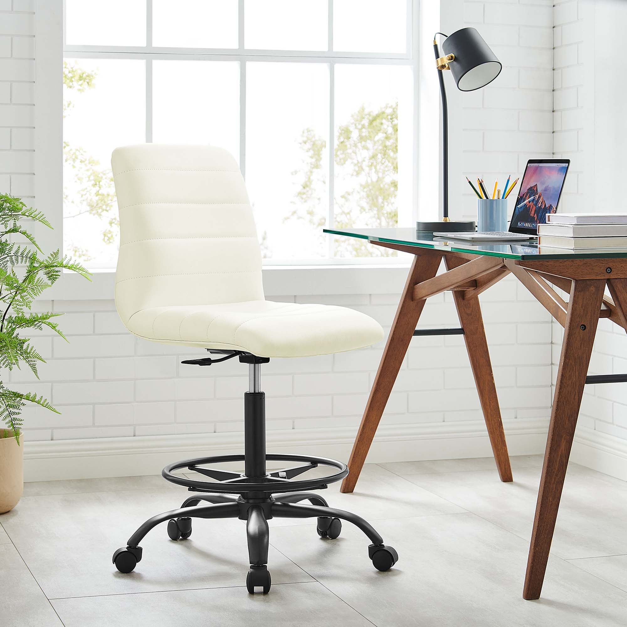 Focus on the task at hand while bringing modern style to your workspace with the Ripple Armless Drafting Chair. Outfitted with a matte black frame and five dual-wheel casters for easy mobility over hardwood or carpeted surfaces, this padded drafting stool is upholstered in durable vegan leather and covered in dense foam for added comfort. An ergonomic choice for workstations, this vegan leather drafting-height office chair features a mid-back design, channel tufting, and fine stitching throughout. This drafting chair is fully height adjustable with a 360-degree swivel and its drafting-height makes it suitable for standing desks, drafting tables, reception desks, and more. Assembly required. Weight Capacity: 287 lbs.