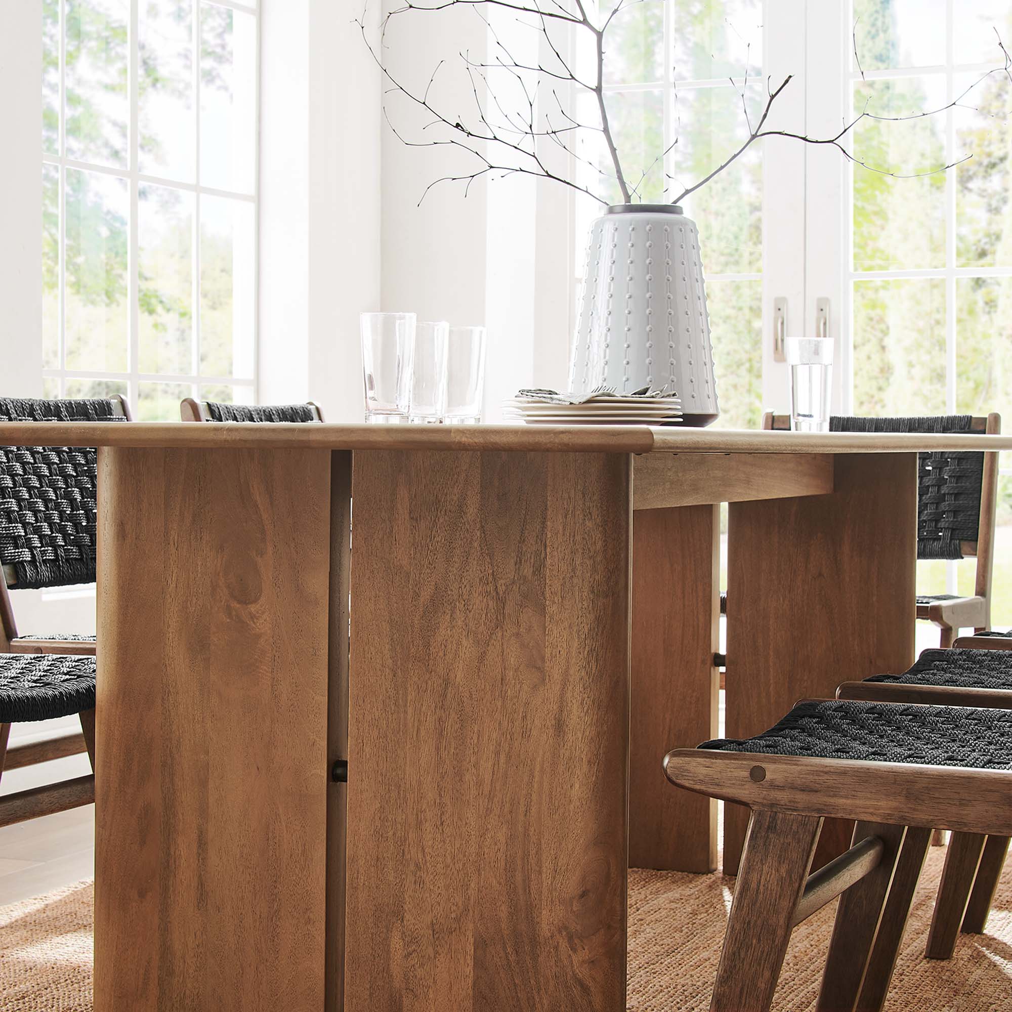 Experience the seamless fusion of natural elegance with the Amistad 86" Wood Dining Table. This centerpiece breathes life into your dining space with its warm, inviting charm, and endless opportunities for memorable family gatherings or game nights. Meticulously crafted with authentic mango wood, this dining table's durability matches its stunning aesthetics. Further enhancing its functionality, adjustable non-marking foot pads ensure stability while safeguarding your flooring from scuffs and scratches. Turning any mealtime into an occasion of comfort and modern farmhouse style, this 86" dining table comfortable seats eight dining chairs. Assembly required.