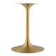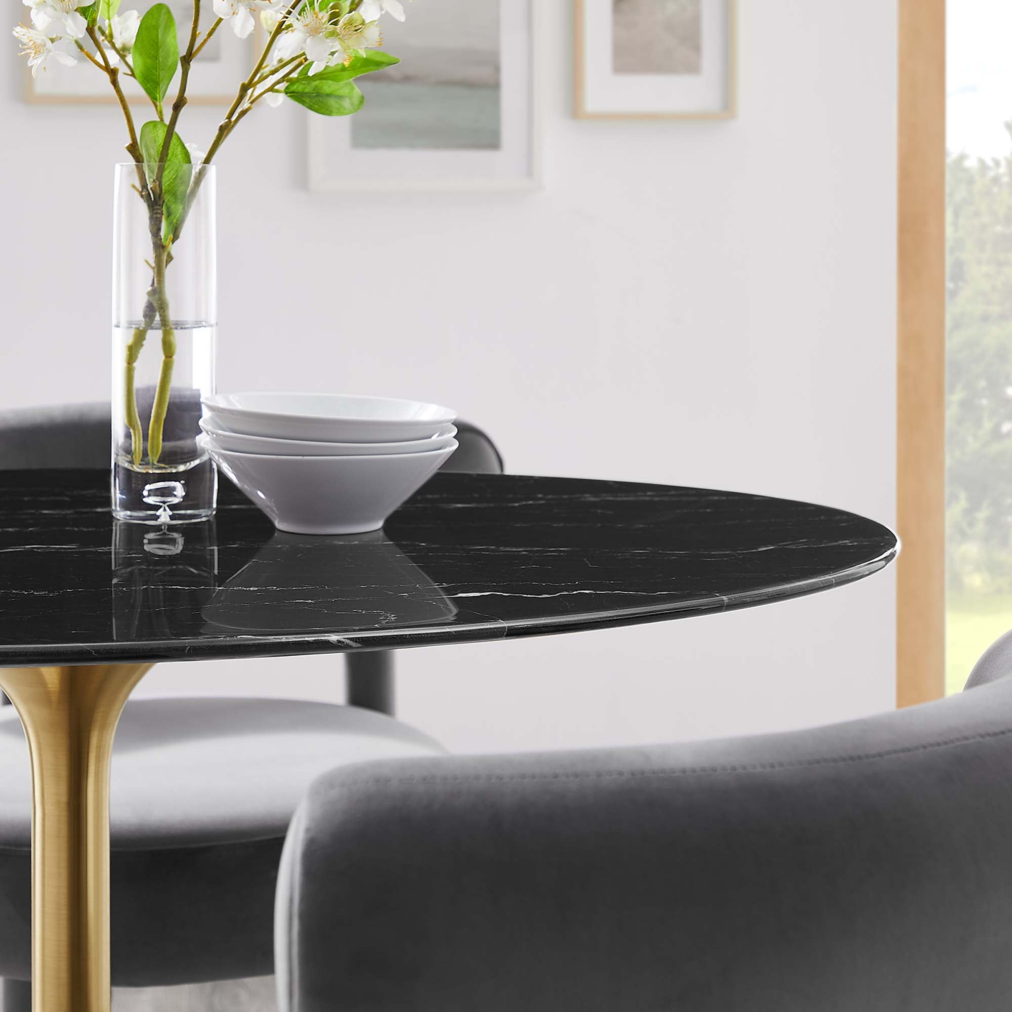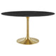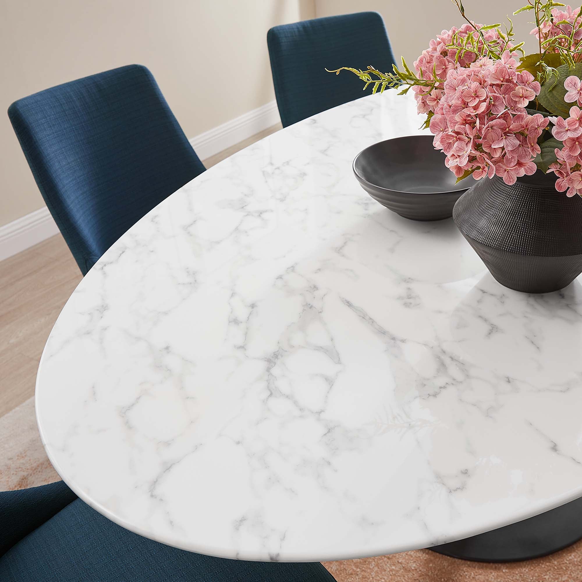 Reflecting a seamless organic shape and timeless form, the Lippa dining table has become a symbol of modernism for over the past 60 years. Before its release, homes were filled with clunky remnants of an industrial age long gone by. But in order to advance into the new world, homes first had to transition from the traditional square table, into a piece that connoted progress. The base and dimensions are true to the original specifications, while the table’s oval-shaped artificial marble top, and tapered metal base, are carefully lacquered with a durable finish.