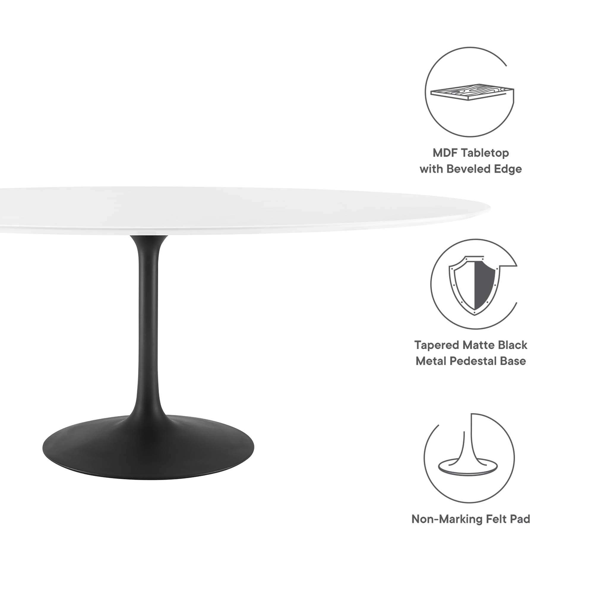 Let modern inspiration flow while gathered around the Lippa 48" Oval Dining Table. Perfect for entertaining family and friends or everyday dining, this pedestal table comfortably seats four. Its oval tabletop is crafted with MDF with a high gloss finish and beveled edge for a contemporary yet timeless design. Embodying an iconic mid-century silhouette, this pedestal dining table floats on a sleek tapered metal pedestal base with a chip-resistant lacquered finish. Includes non-marking felt pad to protect flooring. Assembly required.