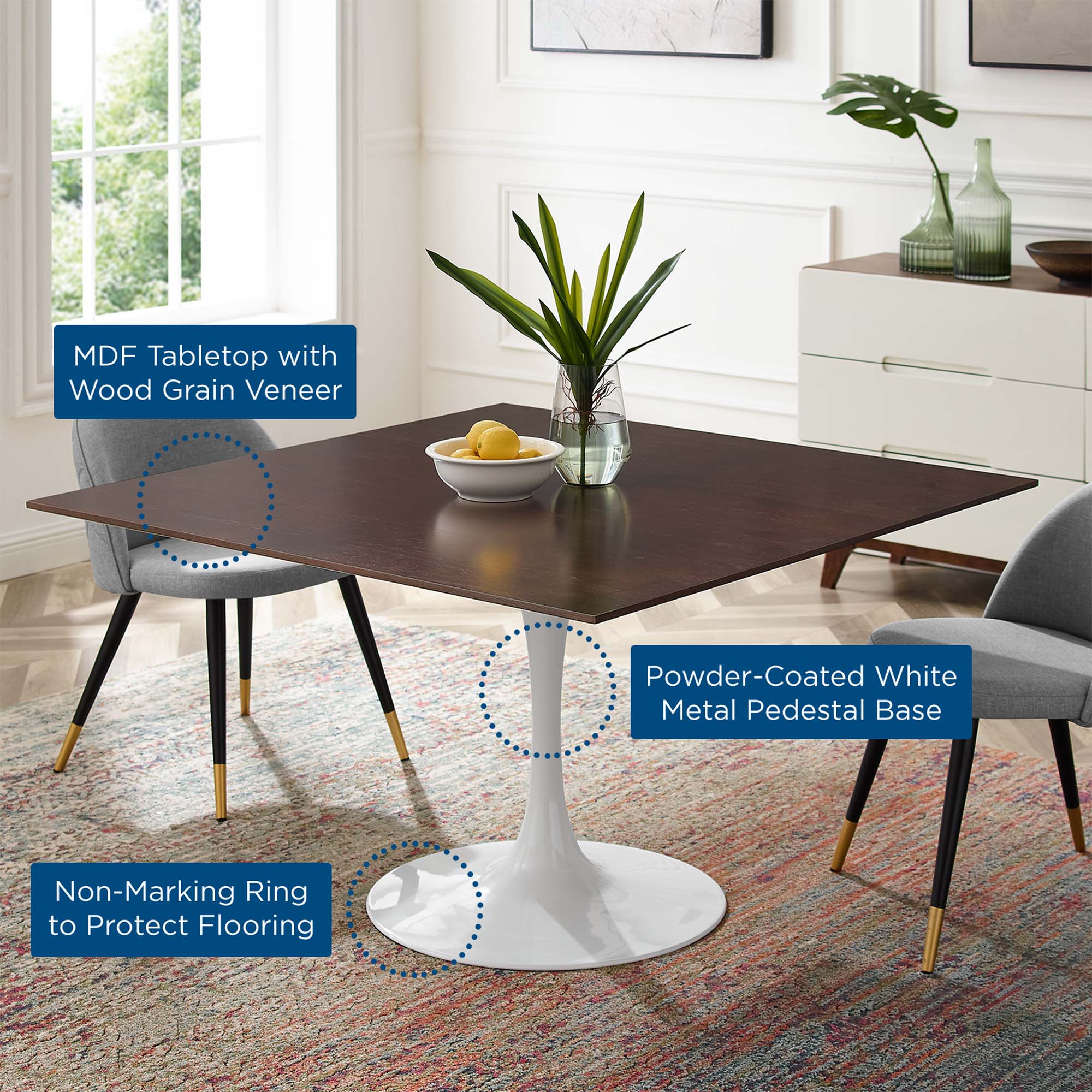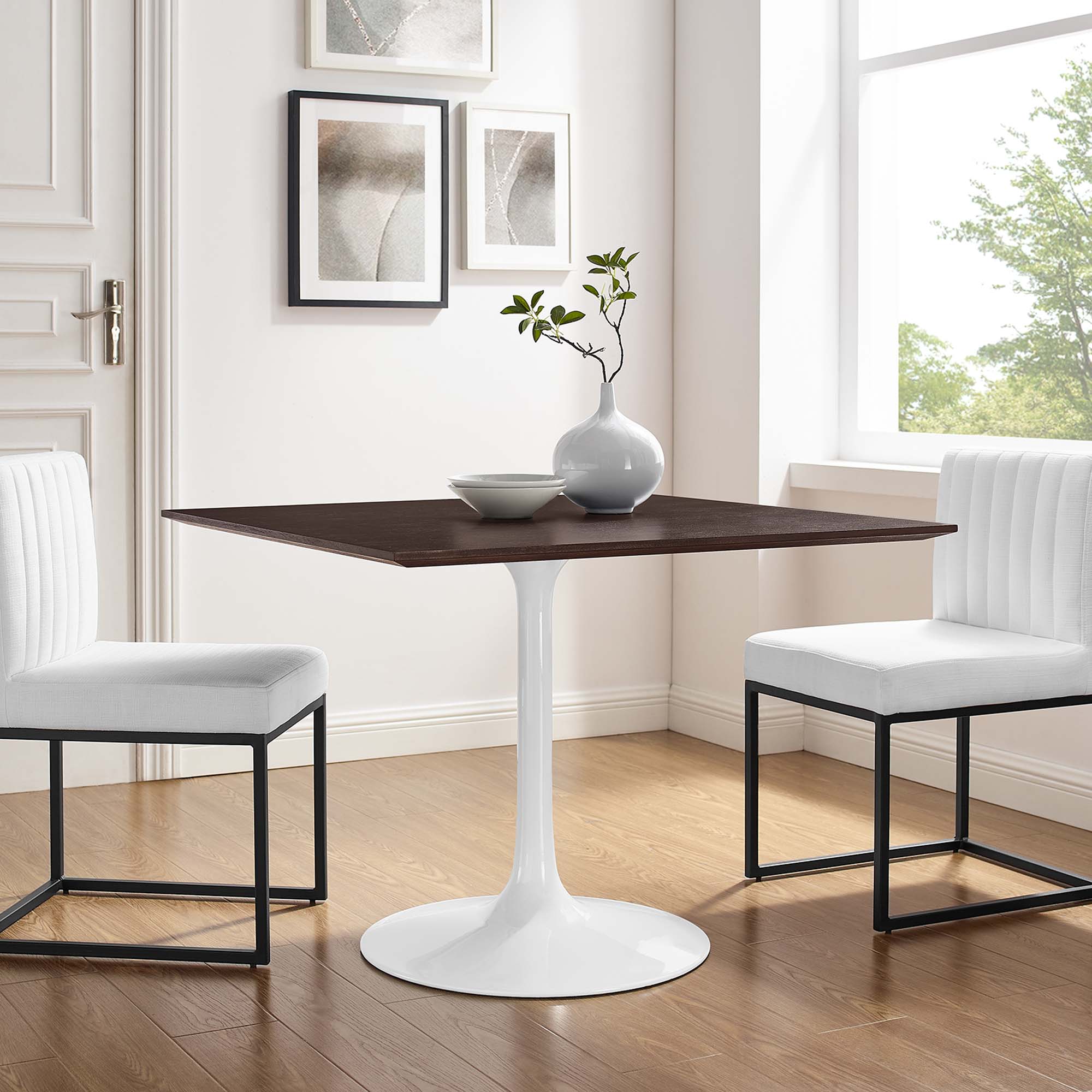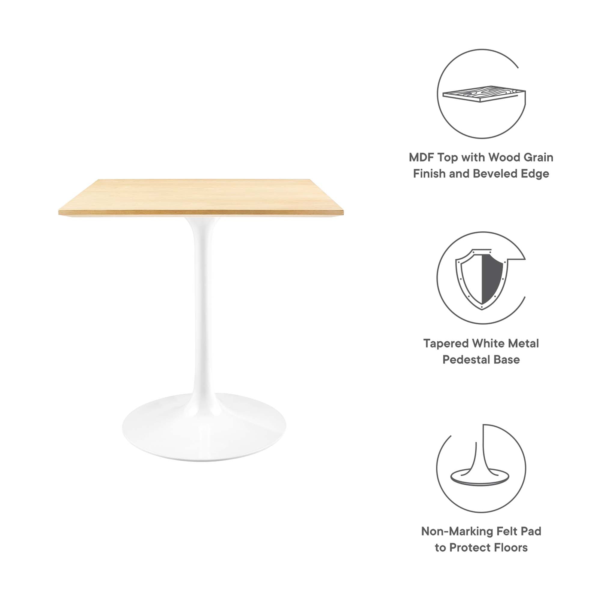 Let modern inspiration flow while gathered around the Lippa 48" Square Dining Table. Perfect for entertaining family and friends or everyday dining, this pedestal table comfortably seats four. Its square tabletop is crafted with MDF with a high gloss finish and beveled edge for a contemporary yet timeless design. Embodying an iconic mid-century silhouette, this pedestal dining table floats on a sleek tapered metal pedestal base with a chip-resistant lacquered finish. Includes non-marking felt pad to protect flooring. Assembly required.