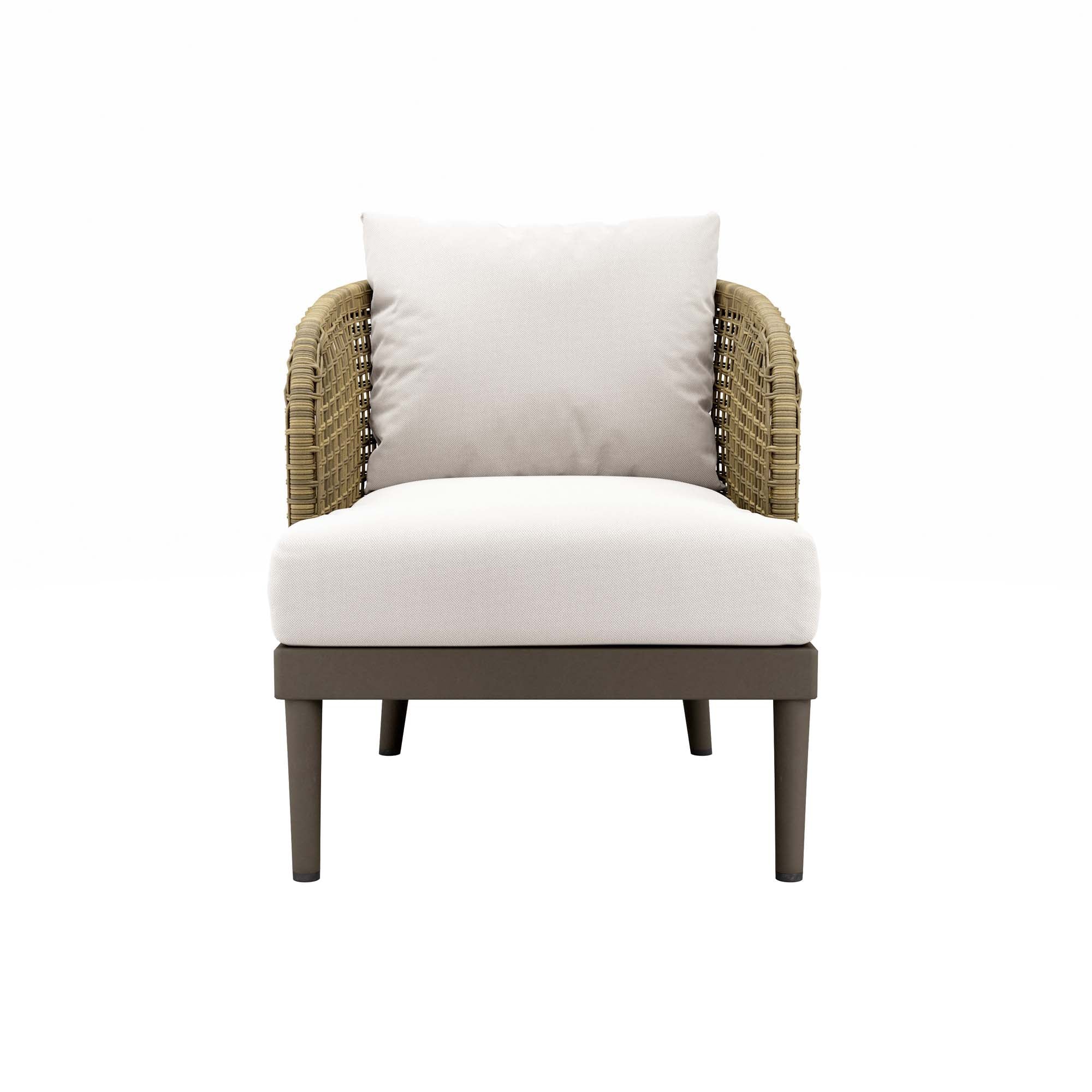 The Meadow Rattan Outdoor Armchair is made for extended relaxation on the patio, deck, or poolside. This outdoor chair commands attention and delivers total satisfaction, standing squarely on a powder-coated stainless steel base, wrapped in textured synthetic wicker rattan, and topped with generous seat and back cushions padded with dense foam. Outfitted with durable, stain-resistant Sunproof® fabric, this irresistible patio chair is the pride of every outdoor party. It's easy to settle into this rattan poolside chair resting on round, tapered legs equipped with non-marking foot caps to protect your deck or patio floor. Weight Capacity: 800 lbs.