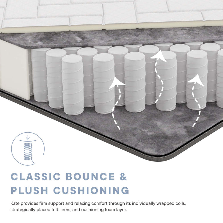 Get a good night's sleep with the Kate Mattress, designed with comfort in mind. Featuring an integrated Bonnell spring system that combines the classic buoyancy of steel springs with a luxurious 0.4” cushioning foam layer, this mattress is supportive and plush. Enhancing comfort, Kate boasts two felt liners, one placed above the springs and one below, to evenly distribute weight and relieve pressure on hips, back, and shoulders. Complete with a gray fabric fire-resistant barrier that has been tested to ensure it meets safety standards, the Kate Twin Mattress is perfect for a child's bedroom, guest room, college dorm, or studio apartment. Shipped conveniently compressed and rolled within a portable box for straightforward delivery and setup, it typically takes 2 to 3 hours for the mattress to fully expand. This mattress comes backed by a 10-year warranty. Box spring or foundation is optional.