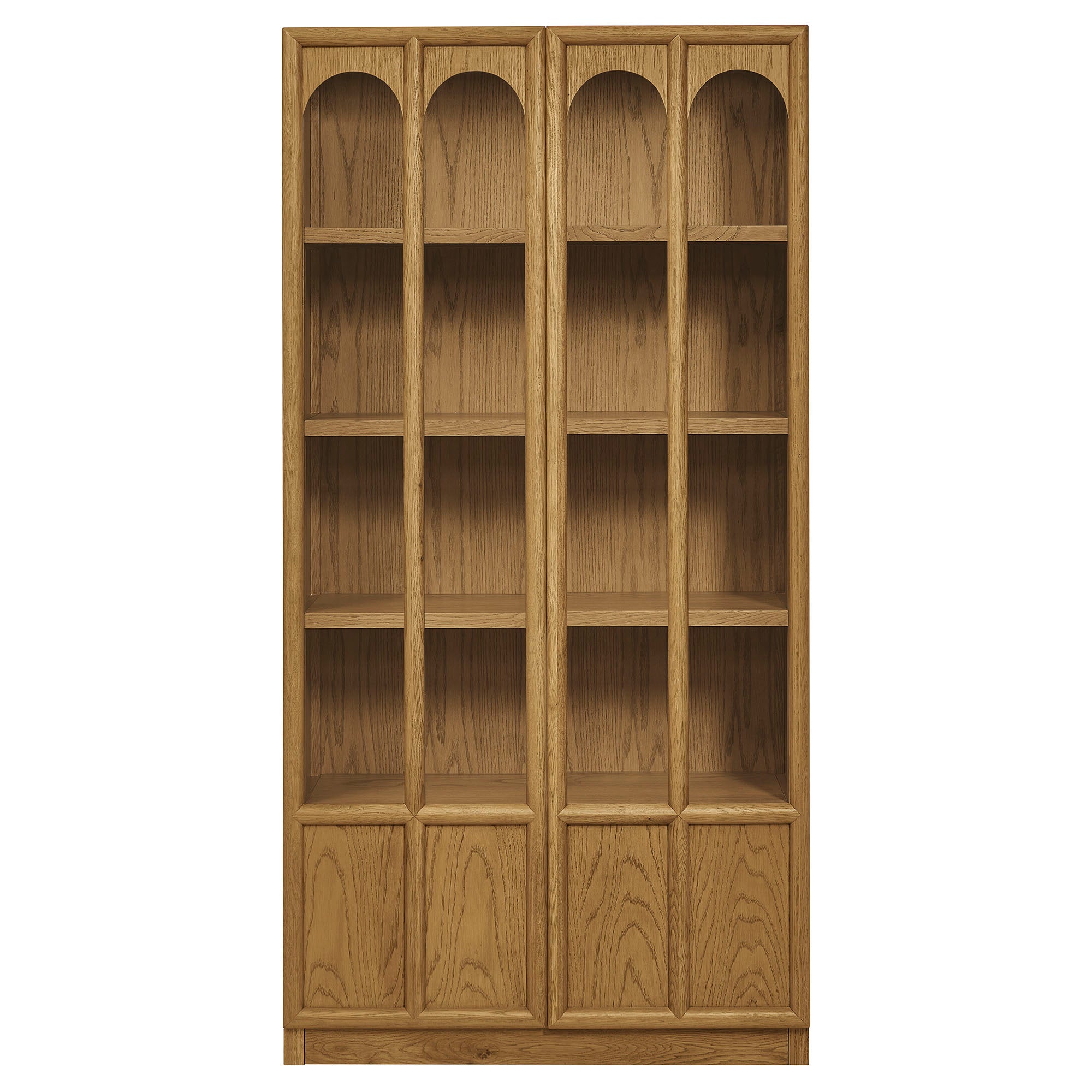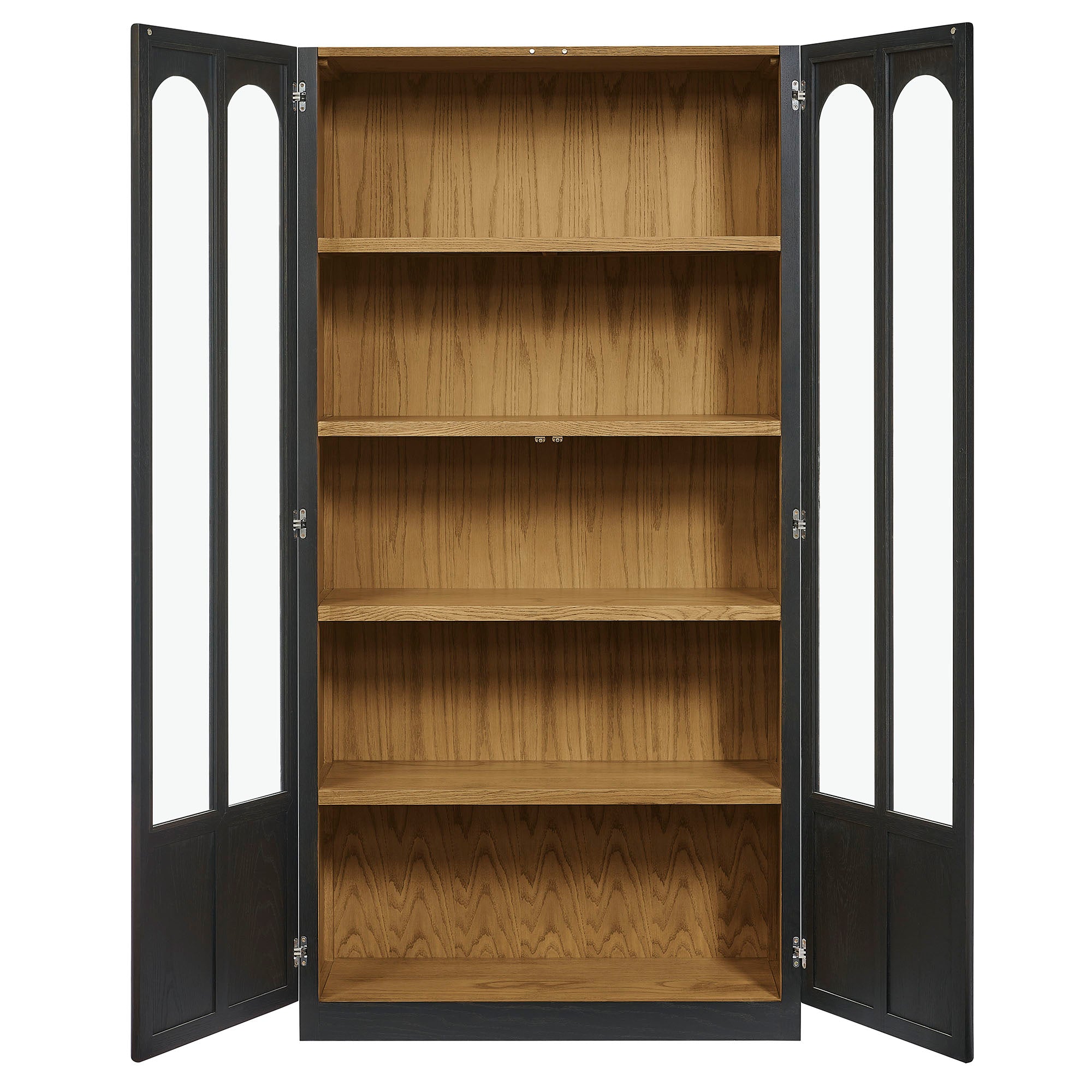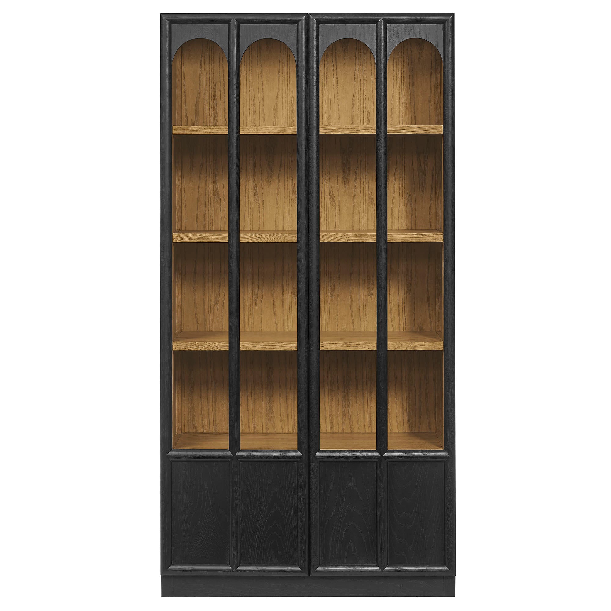 The Anwen Display Cabinet brings refined craftsmanship and modern elegance to living rooms, dining rooms, home libraries, and more. At 79" tall, this solid wood storage cabinet with glass doors and shelves showcases a sophisticated arched design across its front tempered glass panels, creating a timeless focal point for any interior. Constructed from solid, kiln-dried oak, acacia, and oak wood veneer, the Anwen tall wood curio cabinet features premium joinery, tempered glass doors, and soft-close precision with a push-to-open magnetic catch. Inside, four fixed shelves provide generous storage and display space for collectibles, dinnerware, books, or décor, while the concealed bottom shelf offers a clean, streamlined finish. Blending the function of a china cabinet, curio cabinet, and tall bookcase with glass doors, this contemporary display cabinet elevates both form and utility. Arrives fully assembled.
