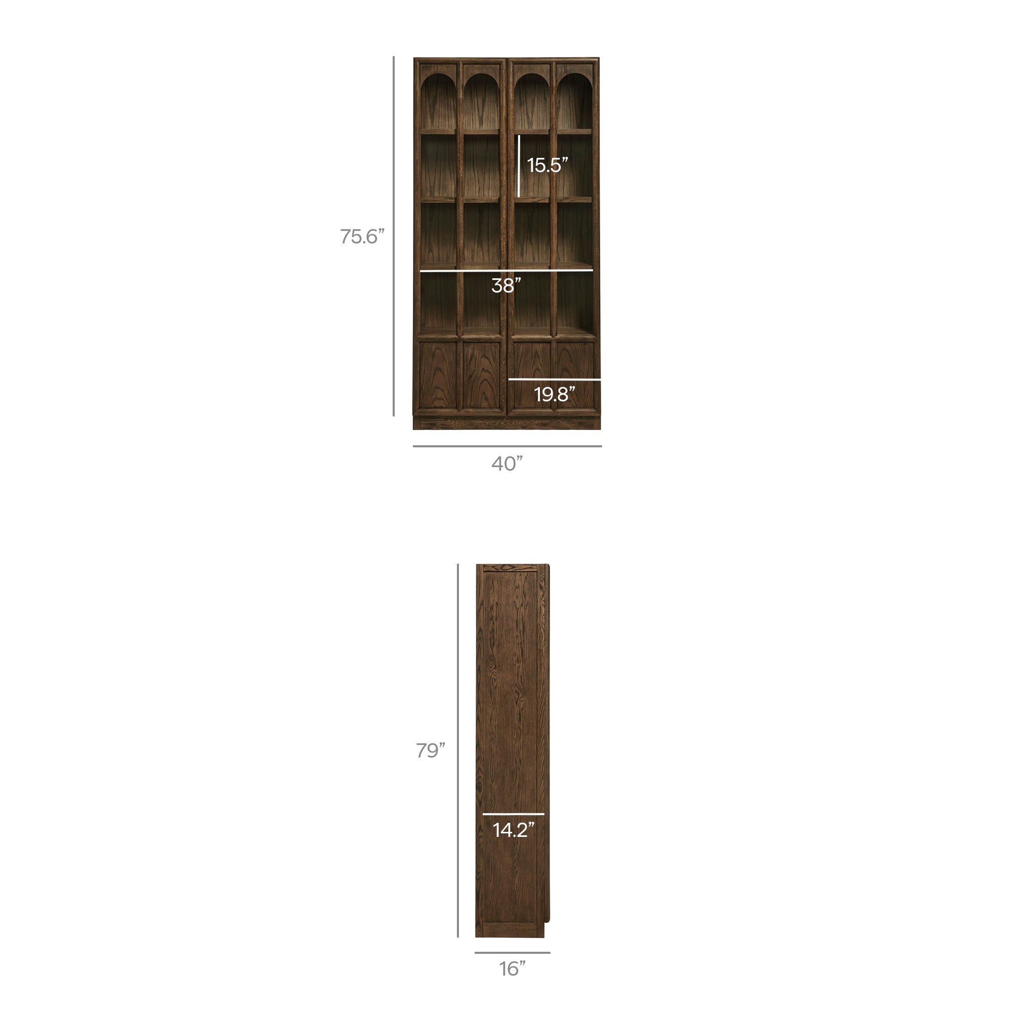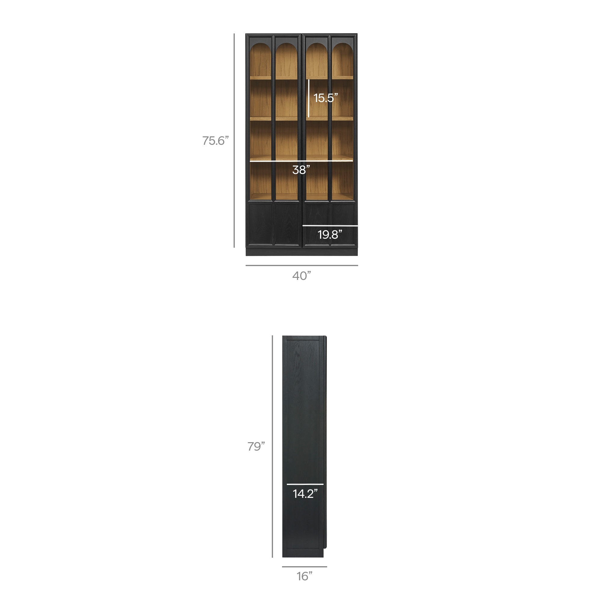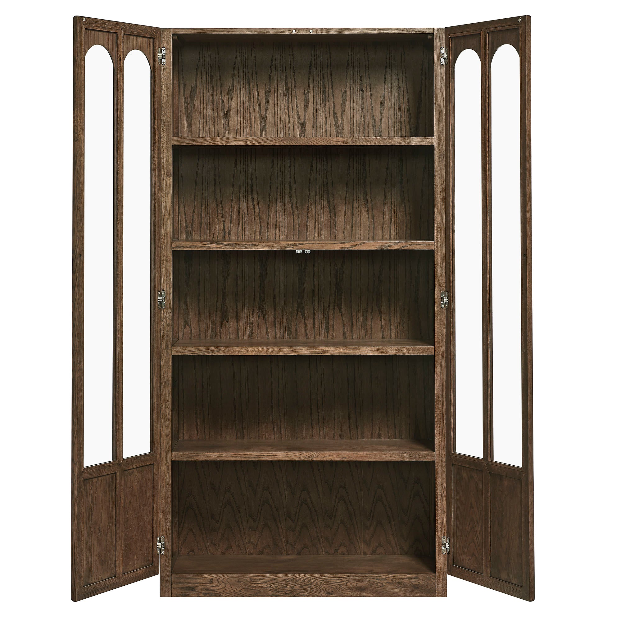 The Anwen Display Cabinet brings refined craftsmanship and modern elegance to living rooms, dining rooms, home libraries, and more. At 79" tall, this solid wood storage cabinet with glass doors and shelves showcases a sophisticated arched design across its front tempered glass panels, creating a timeless focal point for any interior. Constructed from solid, kiln-dried oak, acacia, and oak wood veneer, the Anwen tall wood curio cabinet features premium joinery, tempered glass doors, and soft-close precision with a push-to-open magnetic catch. Inside, four fixed shelves provide generous storage and display space for collectibles, dinnerware, books, or décor, while the concealed bottom shelf offers a clean, streamlined finish. Blending the function of a china cabinet, curio cabinet, and tall bookcase with glass doors, this contemporary display cabinet elevates both form and utility. Arrives fully assembled.