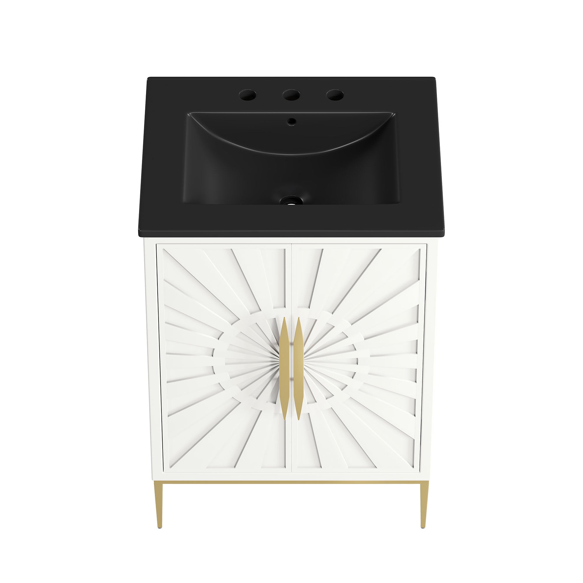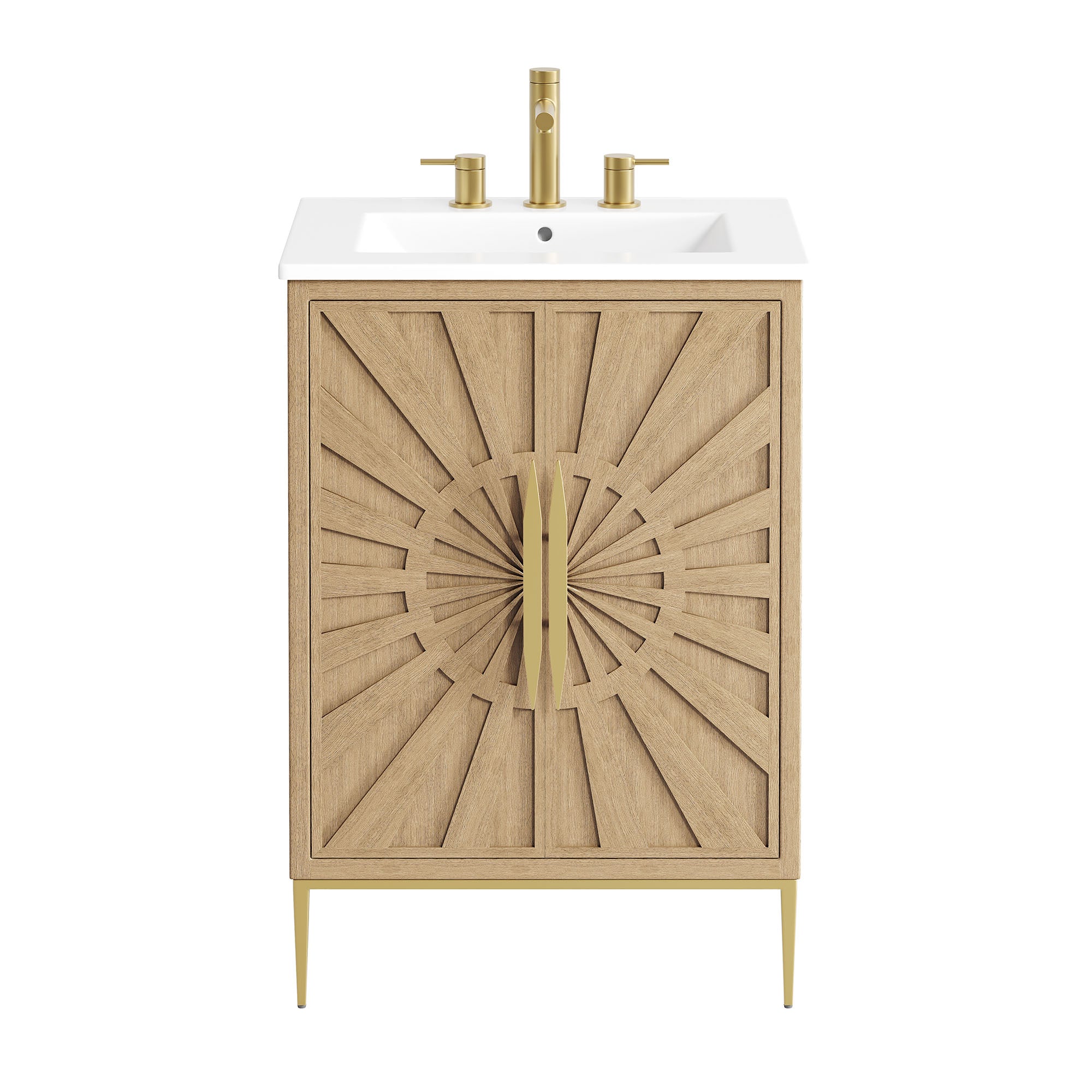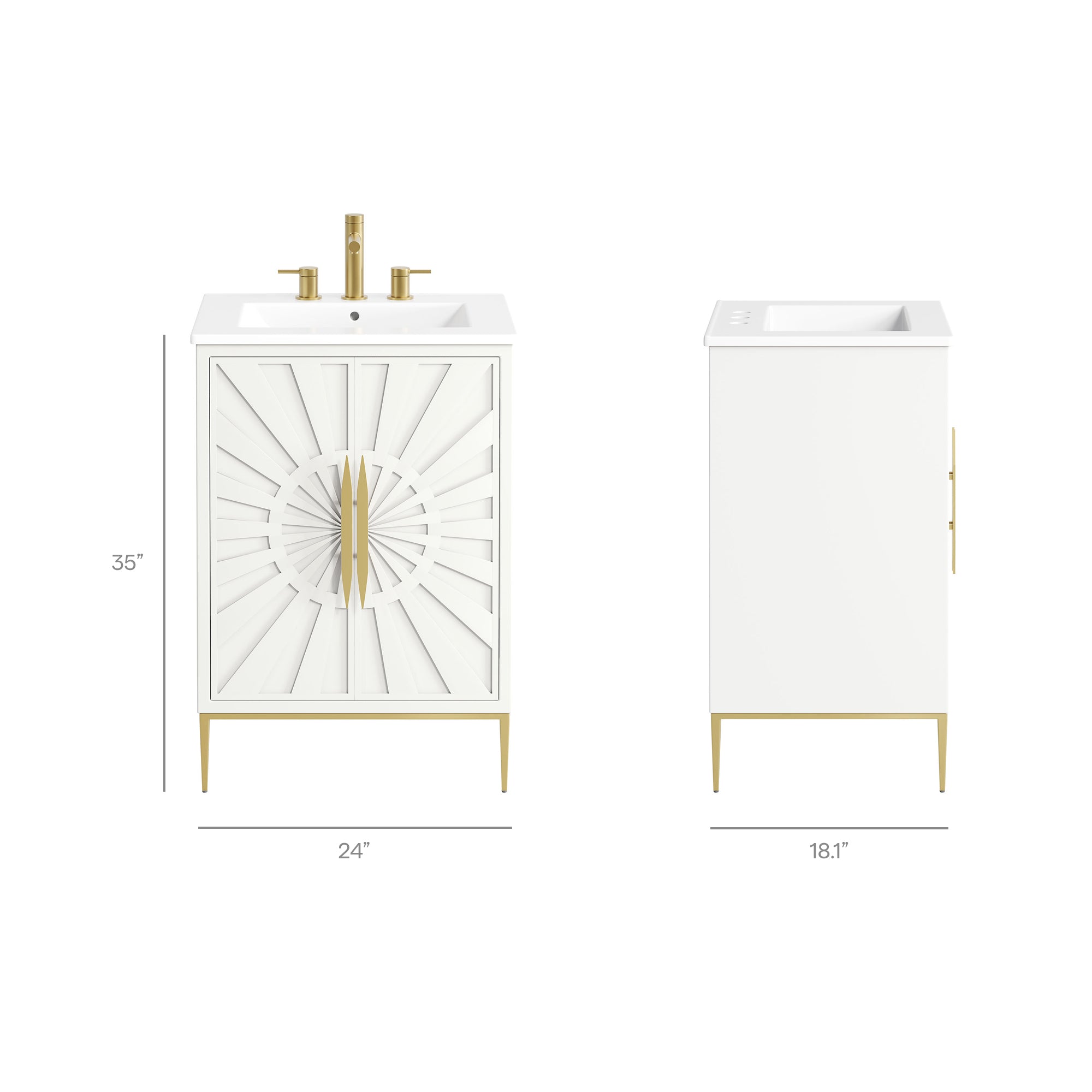 Bring refined modern elegance to your bathroom with the Awaken 24" Bathroom Vanity. The Awaken vanity showcases intricate modernity with clean radial lines crafted from solid wood and durable MDF, resting on a sleek gold base complete with non-marking foot pads to protect your floors. Behind its detailed doors adorned with minimalist gold hardware, you'll find spacious shelves that provide ample storage for all your bathroom essentials. Designed to complement the vanity, the 24" Sink features a rectangular ceramic basin with a narrow integrated countertop and 8-inch widespread faucet holes, delivering a sophisticated look with everyday functionality. Assembly is required.