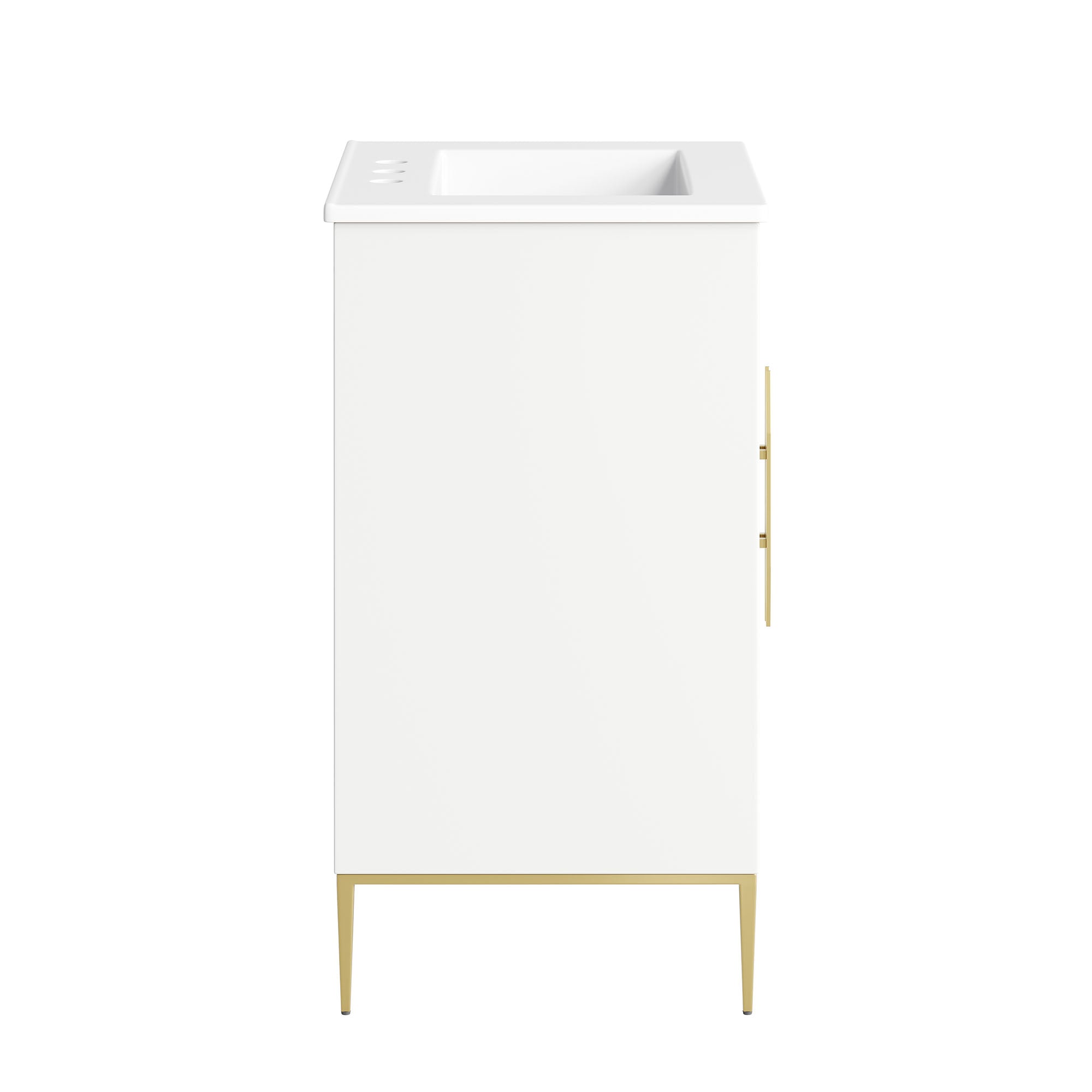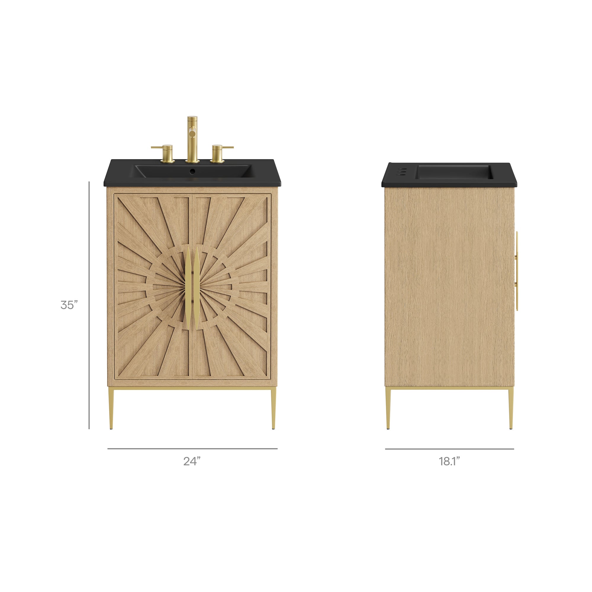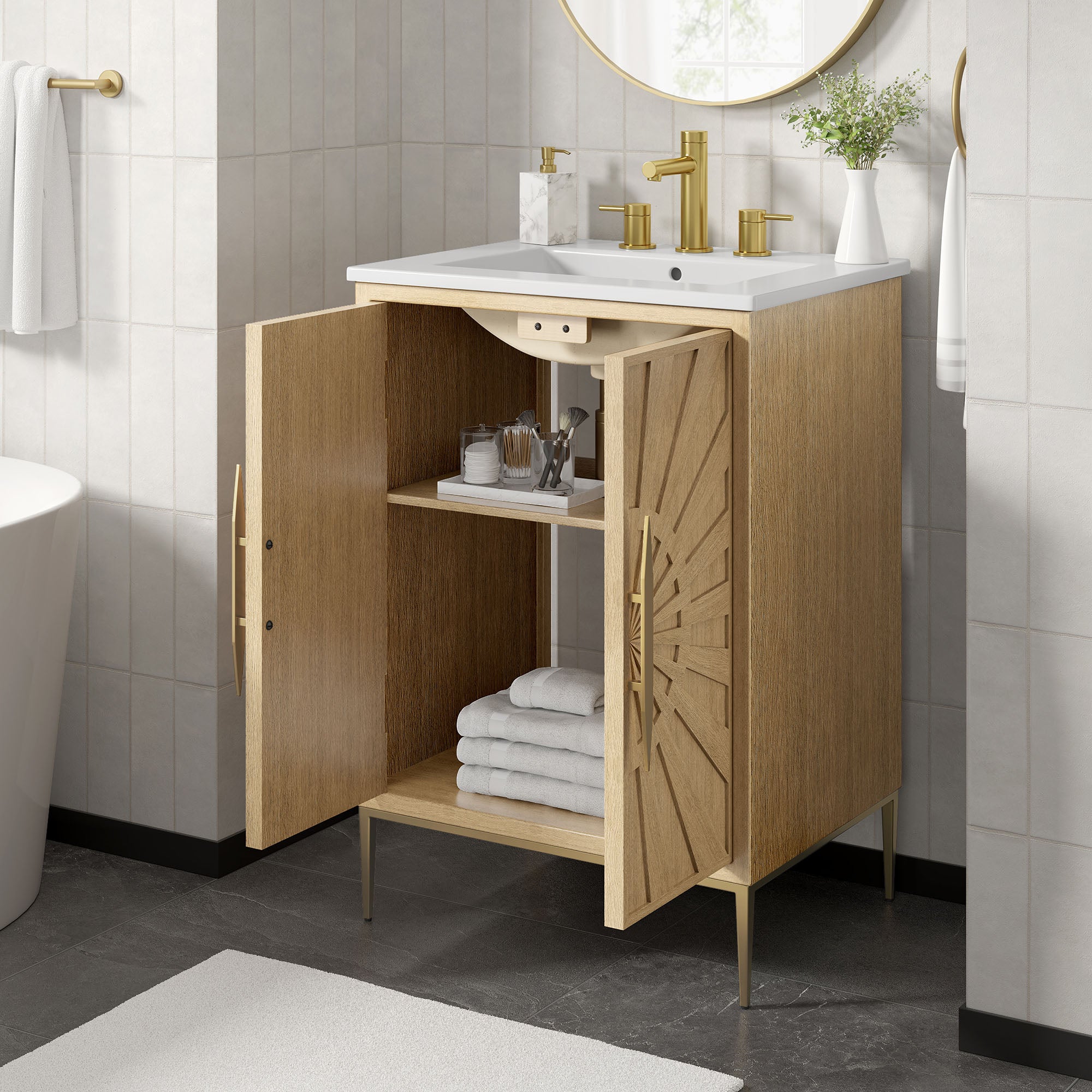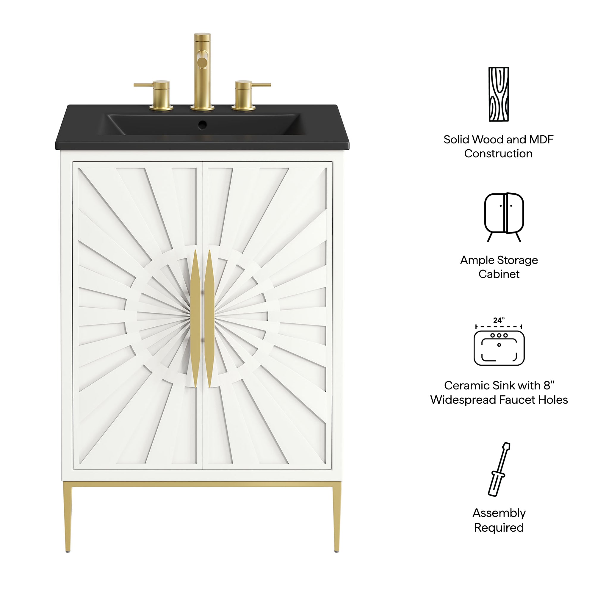 Bring refined modern elegance to your bathroom with the Awaken 24" Bathroom Vanity. The Awaken vanity showcases intricate modernity with clean radial lines crafted from solid wood and durable MDF, resting on a sleek gold base complete with non-marking foot pads to protect your floors. Behind its detailed doors adorned with minimalist gold hardware, you'll find spacious shelves that provide ample storage for all your bathroom essentials. Designed to complement the vanity, the 24" Sink features a rectangular ceramic basin with a narrow integrated countertop and 8-inch widespread faucet holes, delivering a sophisticated look with everyday functionality. Assembly is required.