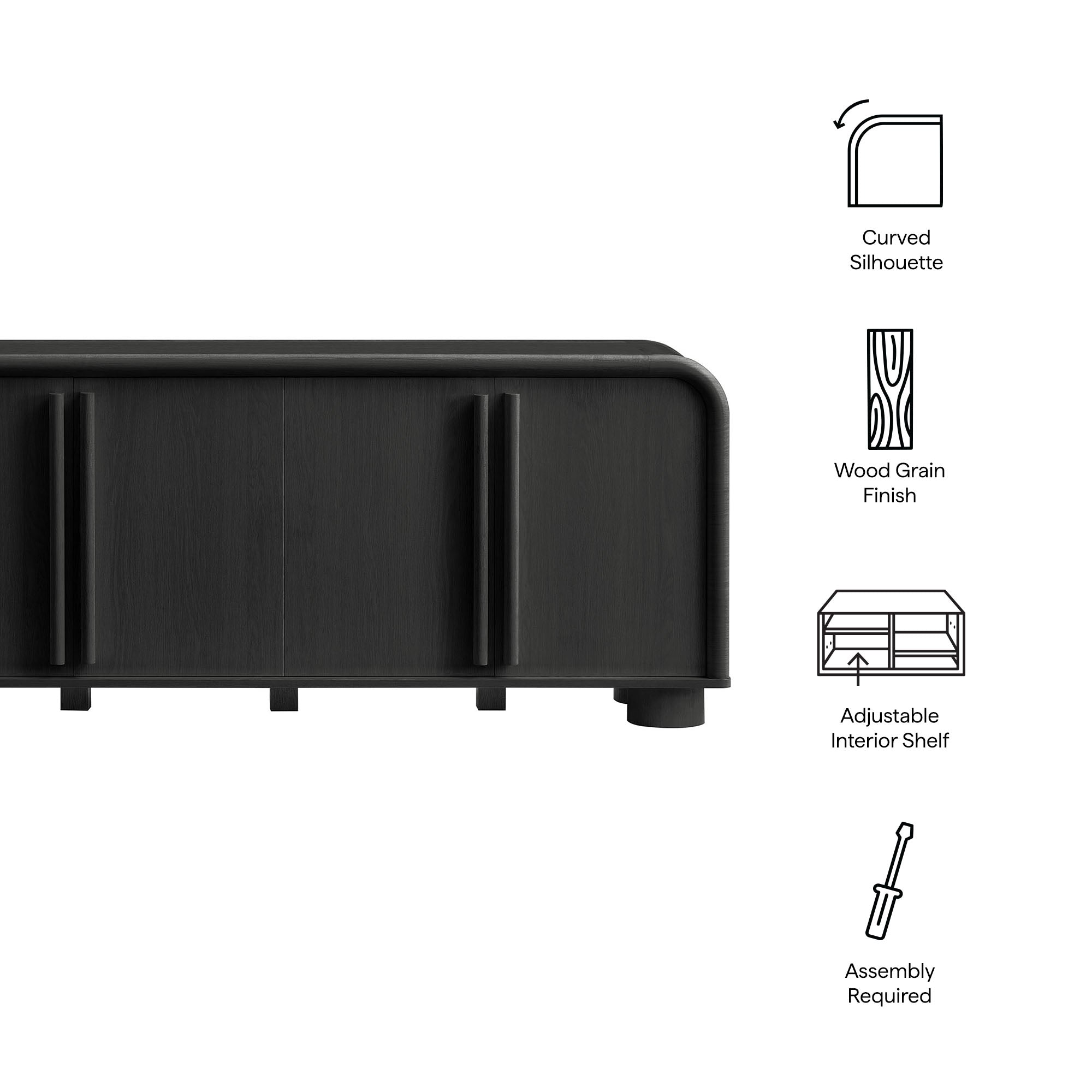 Blending contemporary design with functional elegance, the Bellamy Sideboard Cabinet creates a refined storage solution for dining rooms, living spaces, and entryways. Featuring a gracefully curved silhouette, this modern buffet cabinet makes a stylish statement while offering ample space for organizing dinnerware, linens, household items, or as a TV stand for wall-mounted TVs. Crafted with a beautiful wood grain finish, this storage cabinet is designed with distinctive elongated handle pulls and unique rounded feet, adding a touch of modern sophistication. The soft-close doors open to reveal an adjustable shelf, allowing for customizable storage options. Thoughtfully designed with non-marking floor glides for stability and floor protection, this versatile rounded cabinet is perfect for any space. Assembly required.