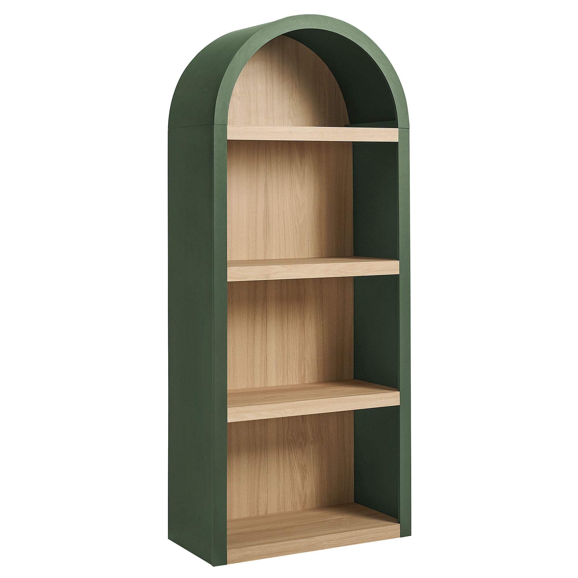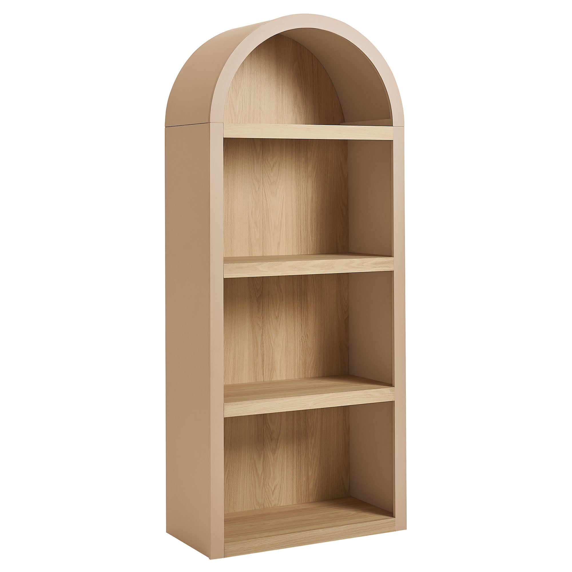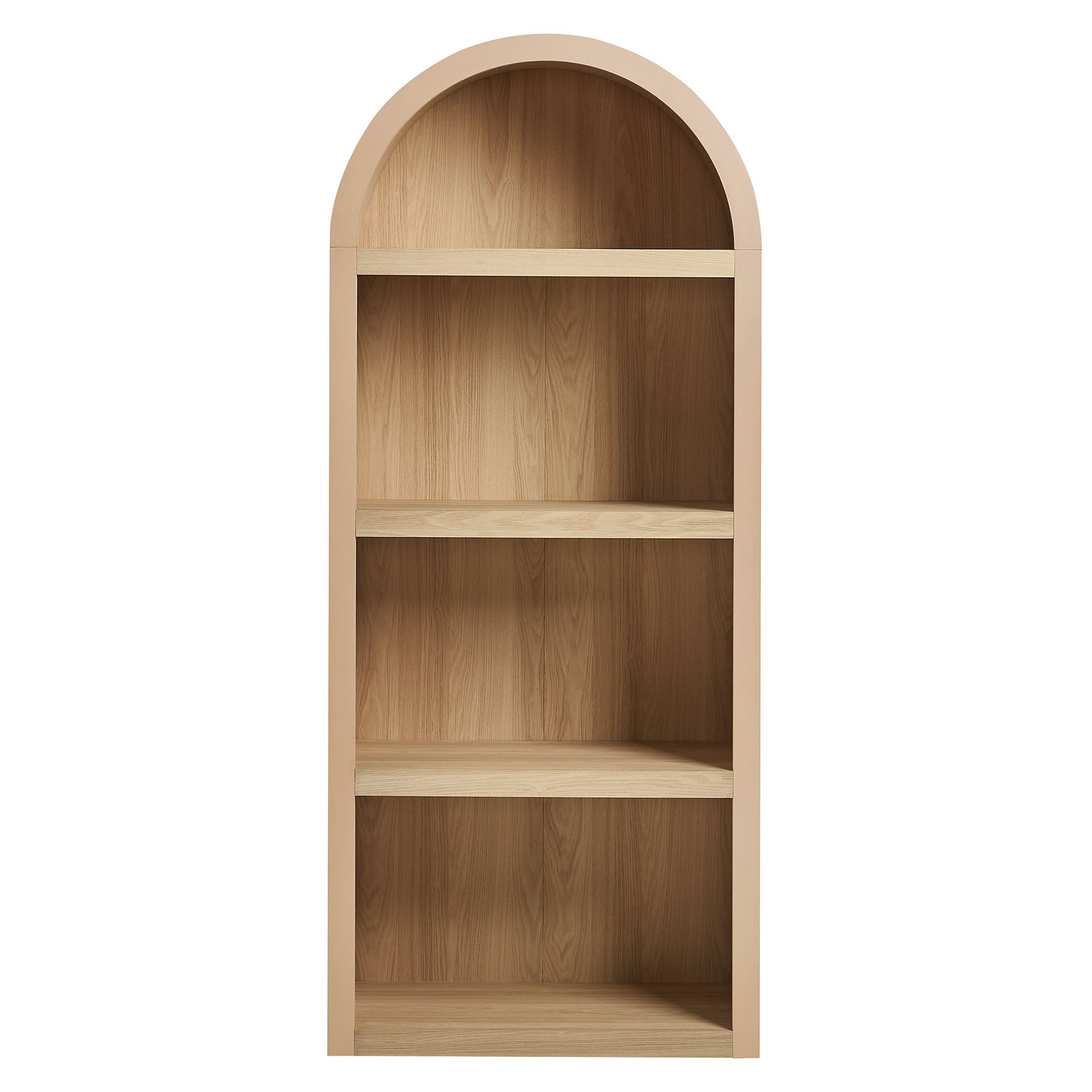 Gallery-style storage shapes the look of the Caleb Arched Display Shelf, a thoughtfully designed arched bookcase defined by simple lines offset by rounded contours. Framed by a bold arch silhouette, this open shelf bookcase features four evenly spaced tiers crafted from a warm laminated wood grain look. Style it as a dining room open shelving unit for serveware and bar essentials, a living room bookshelf for books and décor, or a large display shelf in a hallway or office. Keeping everyday items within easy reach, each shelf supports up to 99 lbs., offering dependable storage while maintaining an open, airy presence. Assembly required.