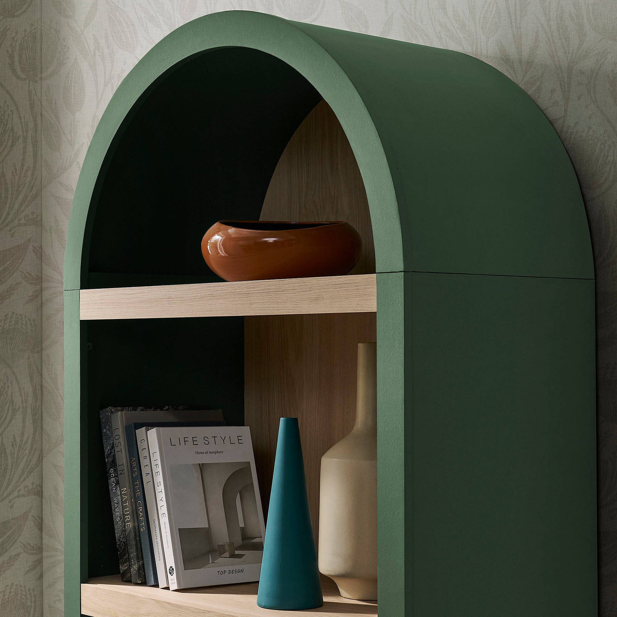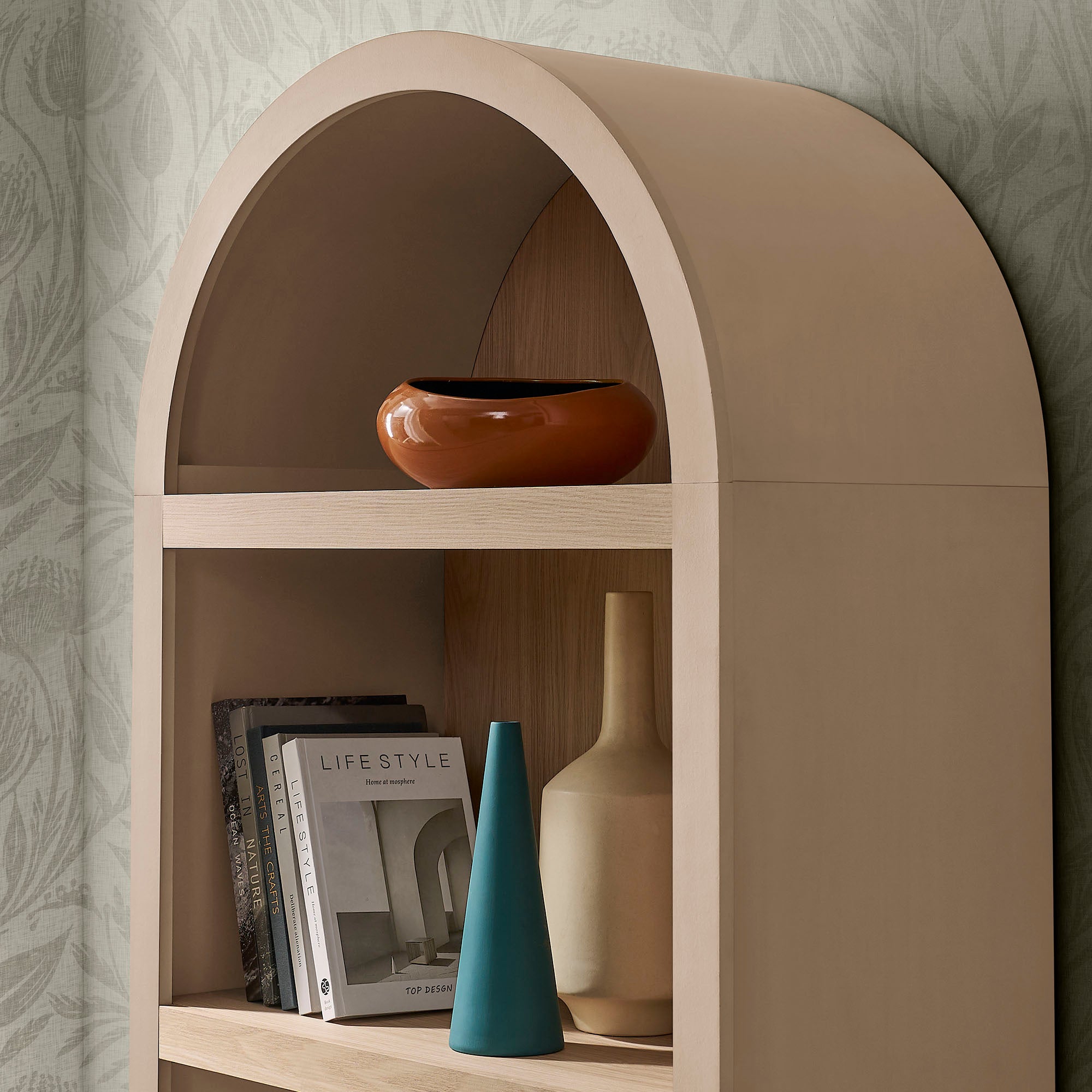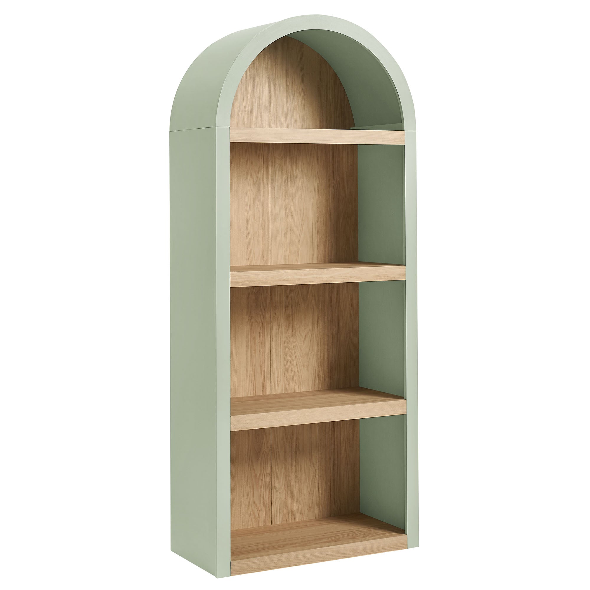 Gallery-style storage shapes the look of the Caleb Arched Display Shelf, a thoughtfully designed arched bookcase defined by simple lines offset by rounded contours. Framed by a bold arch silhouette, this open shelf bookcase features four evenly spaced tiers crafted from a warm laminated wood grain look. Style it as a dining room open shelving unit for serveware and bar essentials, a living room bookshelf for books and décor, or a large display shelf in a hallway or office. Keeping everyday items within easy reach, each shelf supports up to 99 lbs., offering dependable storage while maintaining an open, airy presence. Assembly required.