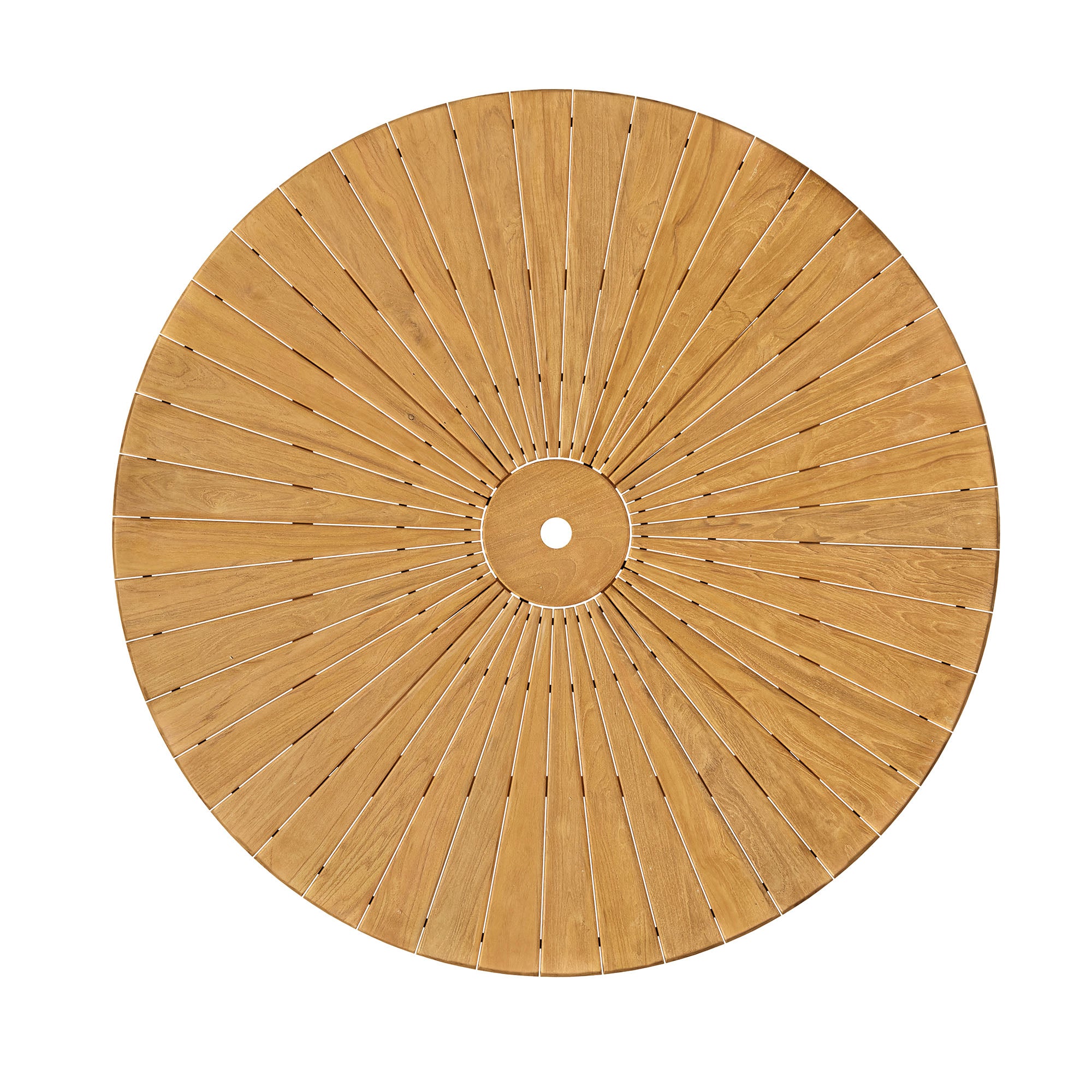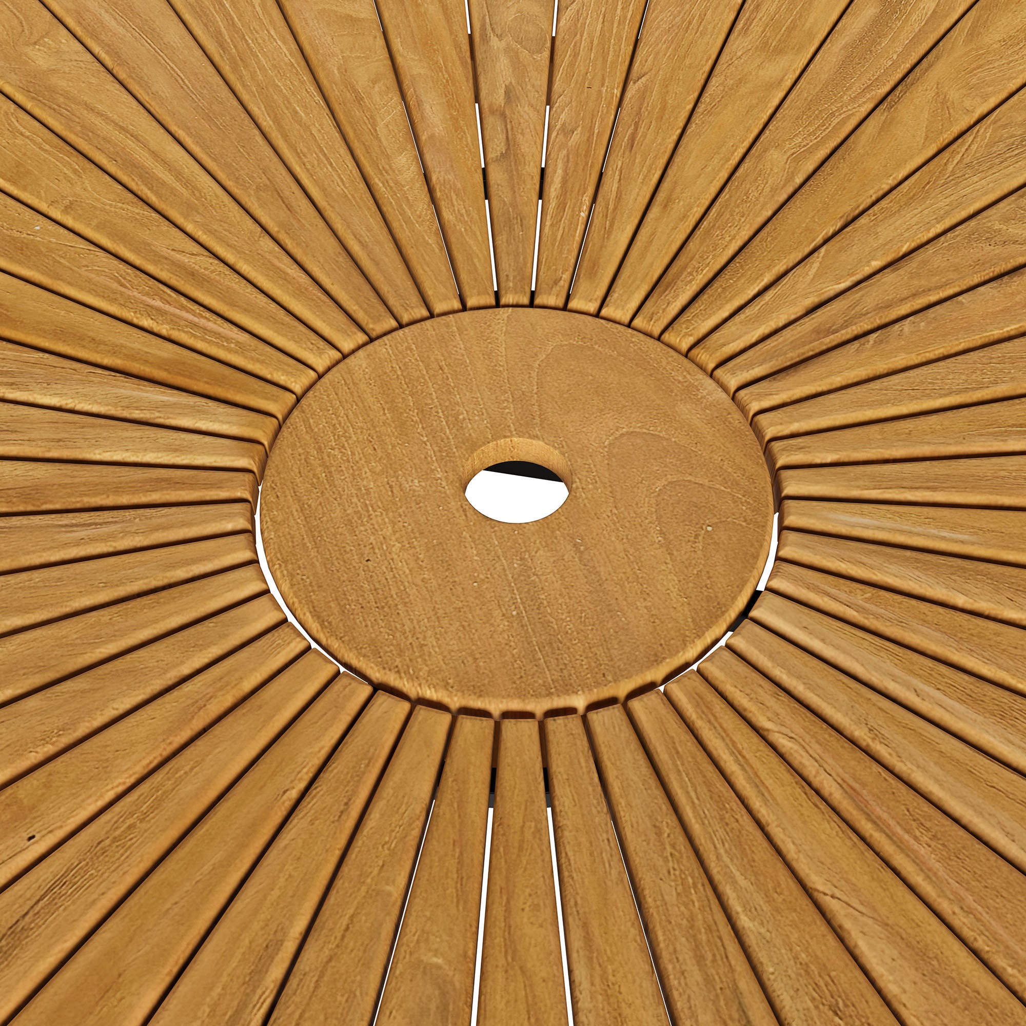 Set the scene for al fresco dining and weekend gatherings with the Cielo Outdoor Dining Table. Crafted as a teak solid wood round dining table, Cielo features a striking starburst slatted top that radiates from the center for a warm, sunburst look that feels right at home on a deck, patio, or porch. An integrated outdoor table with umbrella hole makes it simple to add shade, while the supportive cross brace beneath the tabletop helps keep the table grounded and stable for everyday use. Sized as a 59" round dining table for outdoor patio or porch dining, Cielo comfortably seats 6–8, making it an inviting outdoor entertaining table for family dinners, casual brunches, and summer hosting. Built from premium teak, this weather-resistant solid wood table brings lasting durability and natural character to your outdoor space. Assembly required. Weight Capacity: 704 lbs.