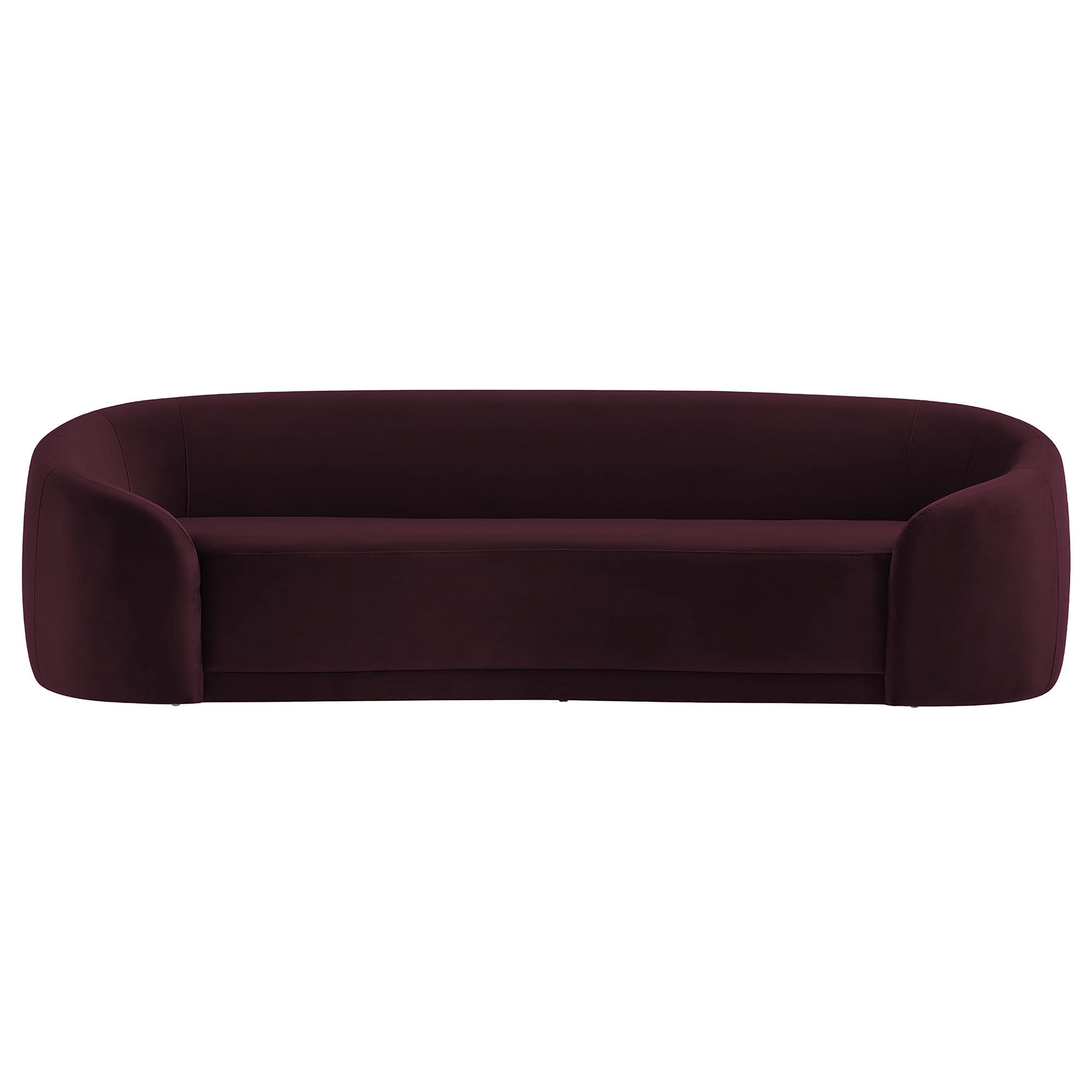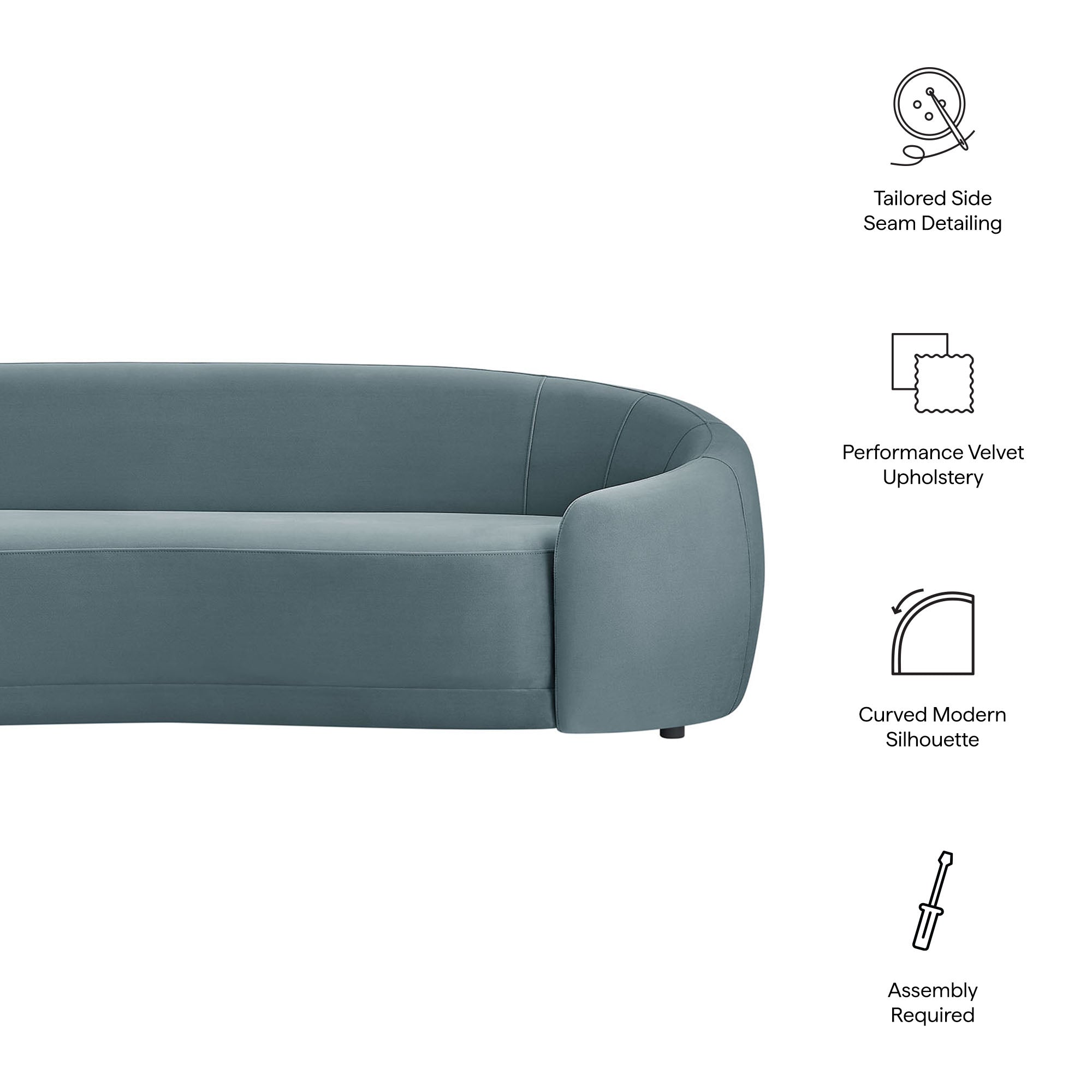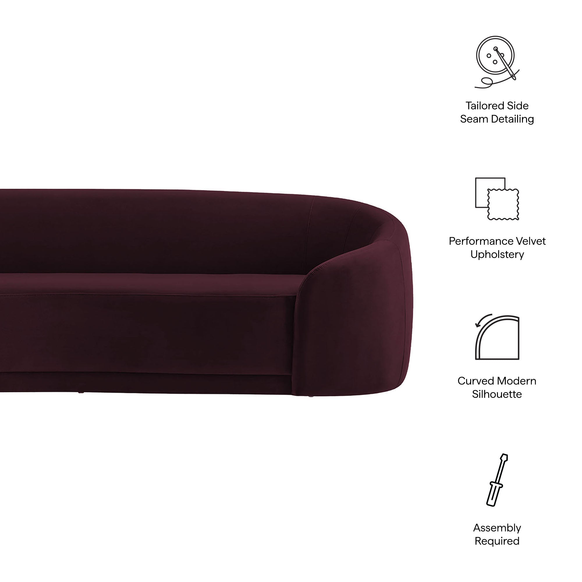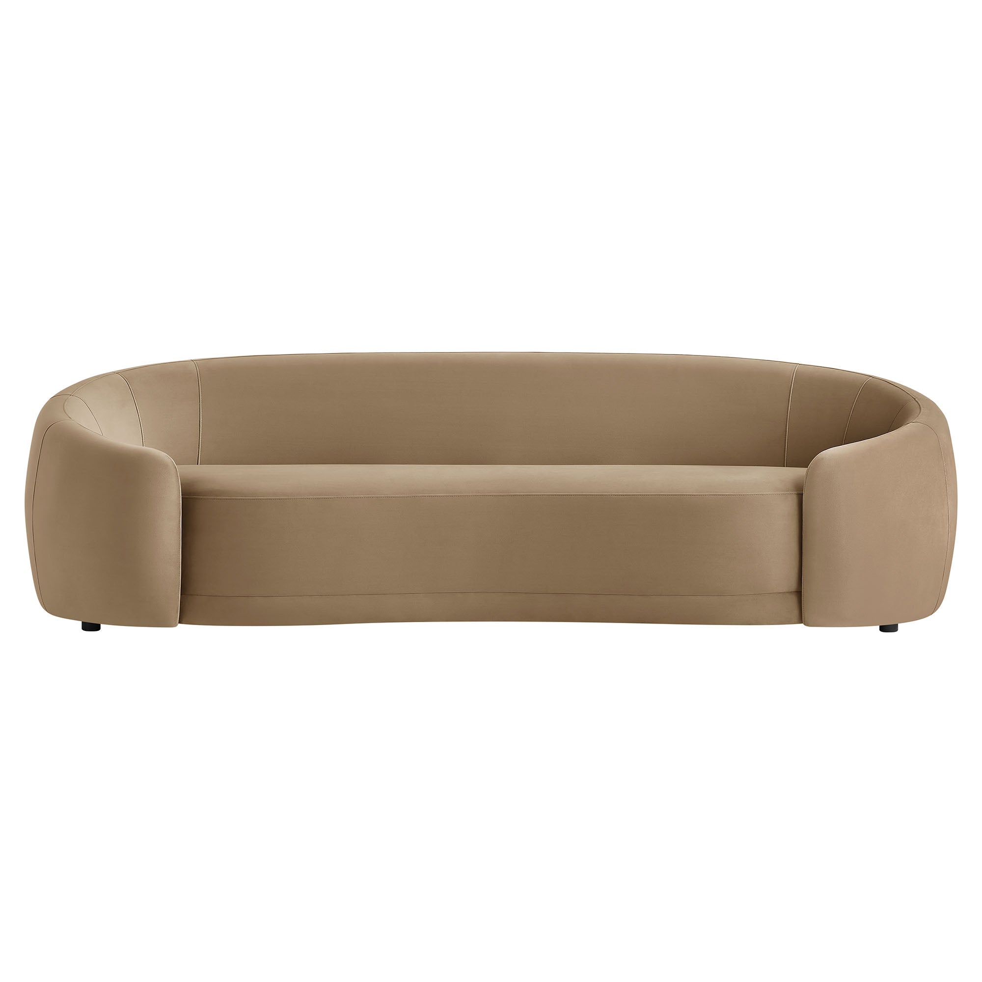 Designed as a sculptural centerpiece for modern interiors, the Contessa Curved Back Sofa brings a refined, lounge-forward look to everyday living. This modern curved back performance velvet sofa features a wrapped tight-back silhouette that flows into rounded sides, accented with tailored seam detailing that adds depth and structure from every angle. Upholstered in stain-resistant, performance velvet fabric, Contessa delivers a soft velvet finish with a clean, elevated feel that suits contemporary, minimalist, and apartment-friendly spaces. With its low profile curved sofa design and padded, supportive seating, this upholstered 3-seat couch is made for relaxed living room seating without overwhelming the room. Assembly required. Weight Capacity: 801 lbs.